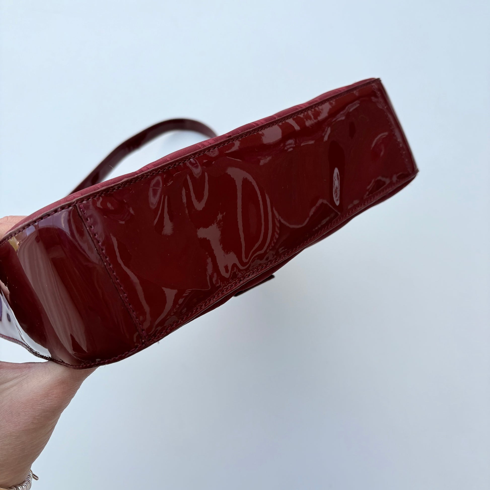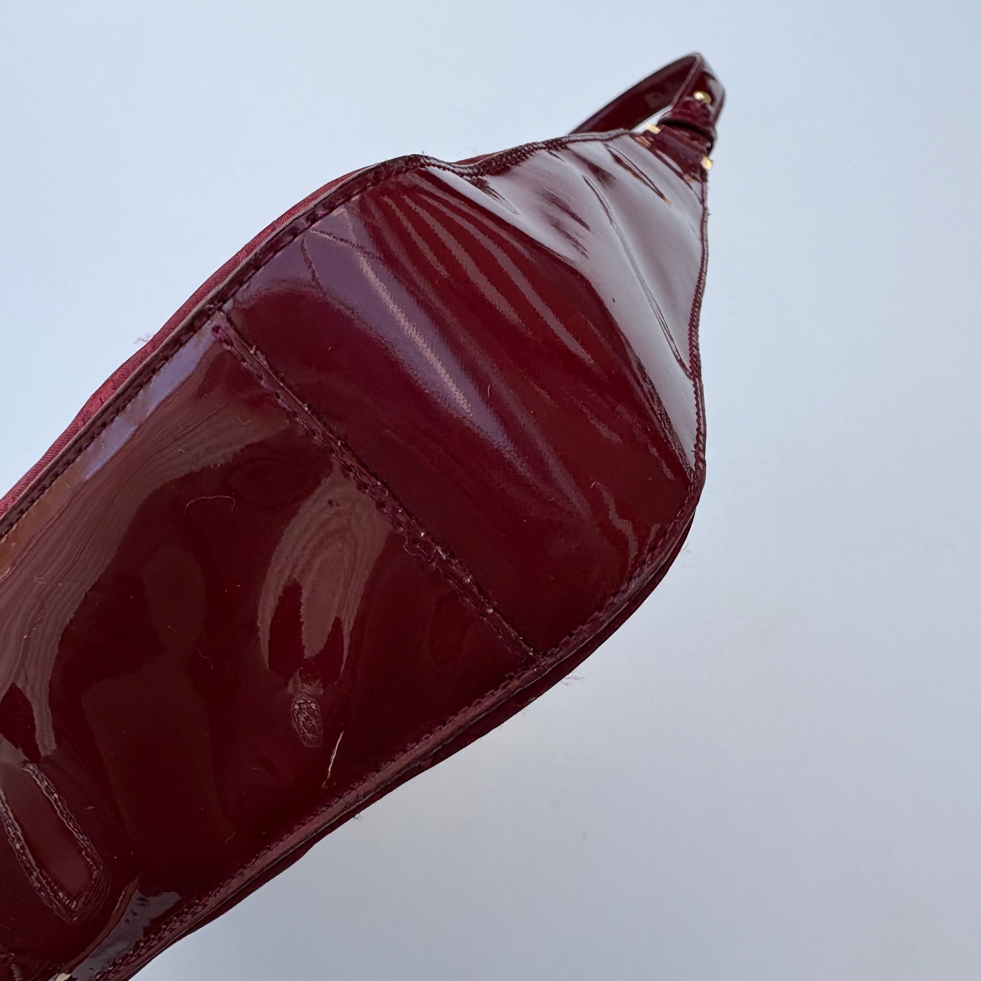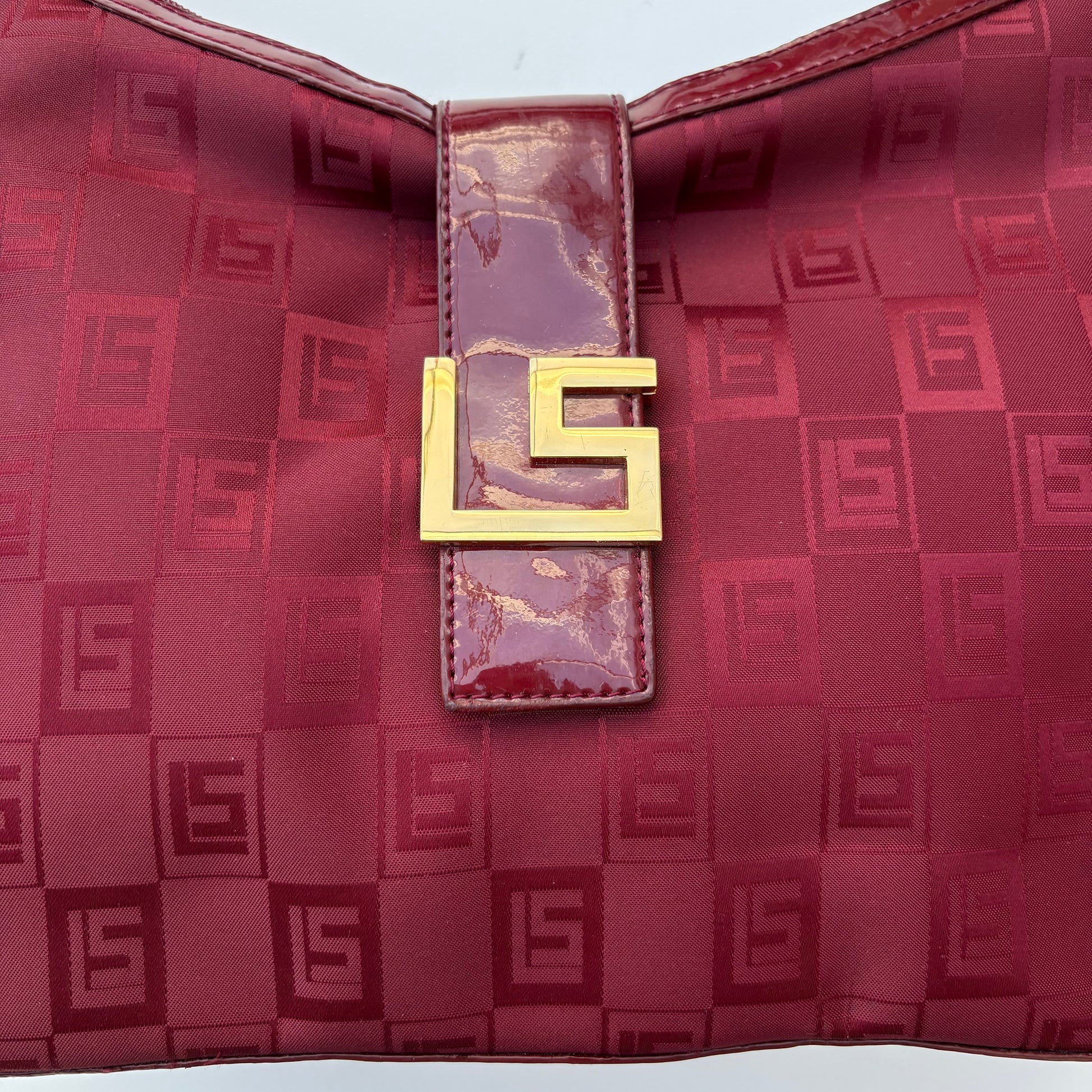 Di Luciano Soprani, borsa burgundi in tela con logo stampato in lucido e opaco, inserti in vernice e hardware Goldtone.