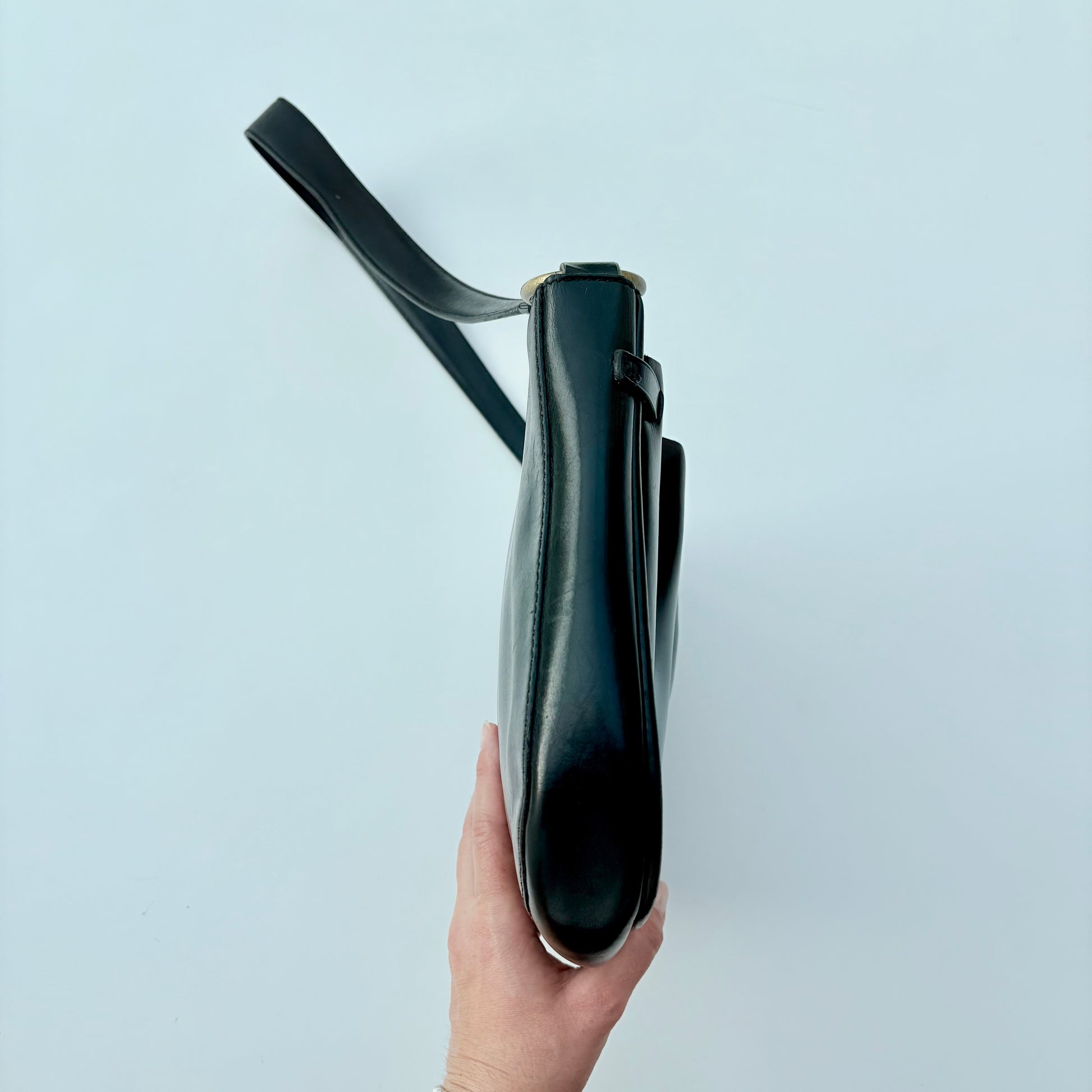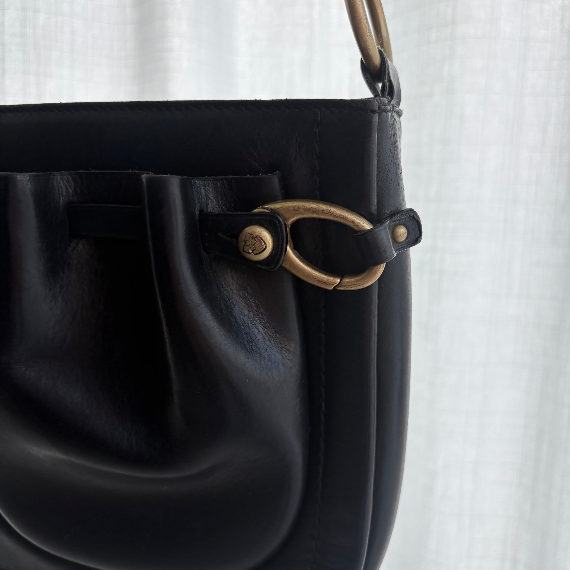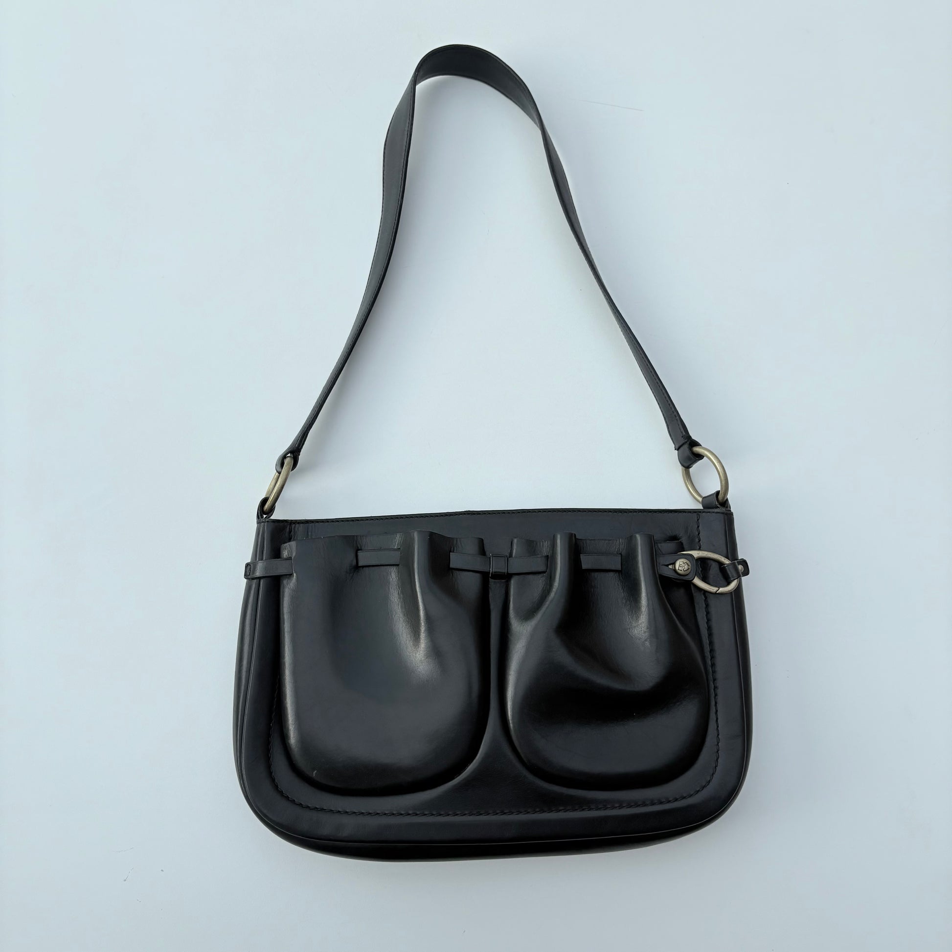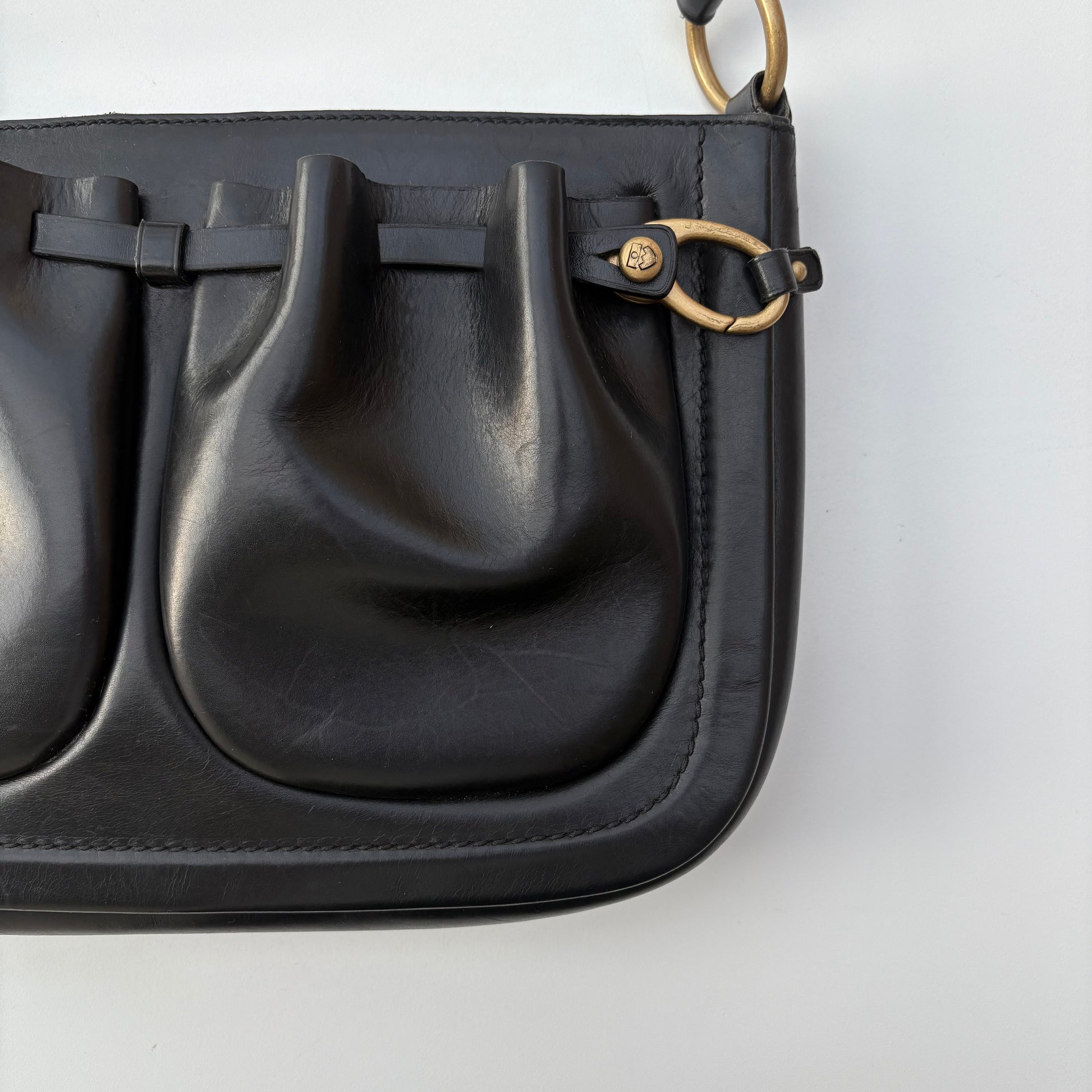 Tracolla in pelle spazzolata nera con due tasche sul davanti trattenute da una cinghia e morsetto che creano un’ arricciatura.