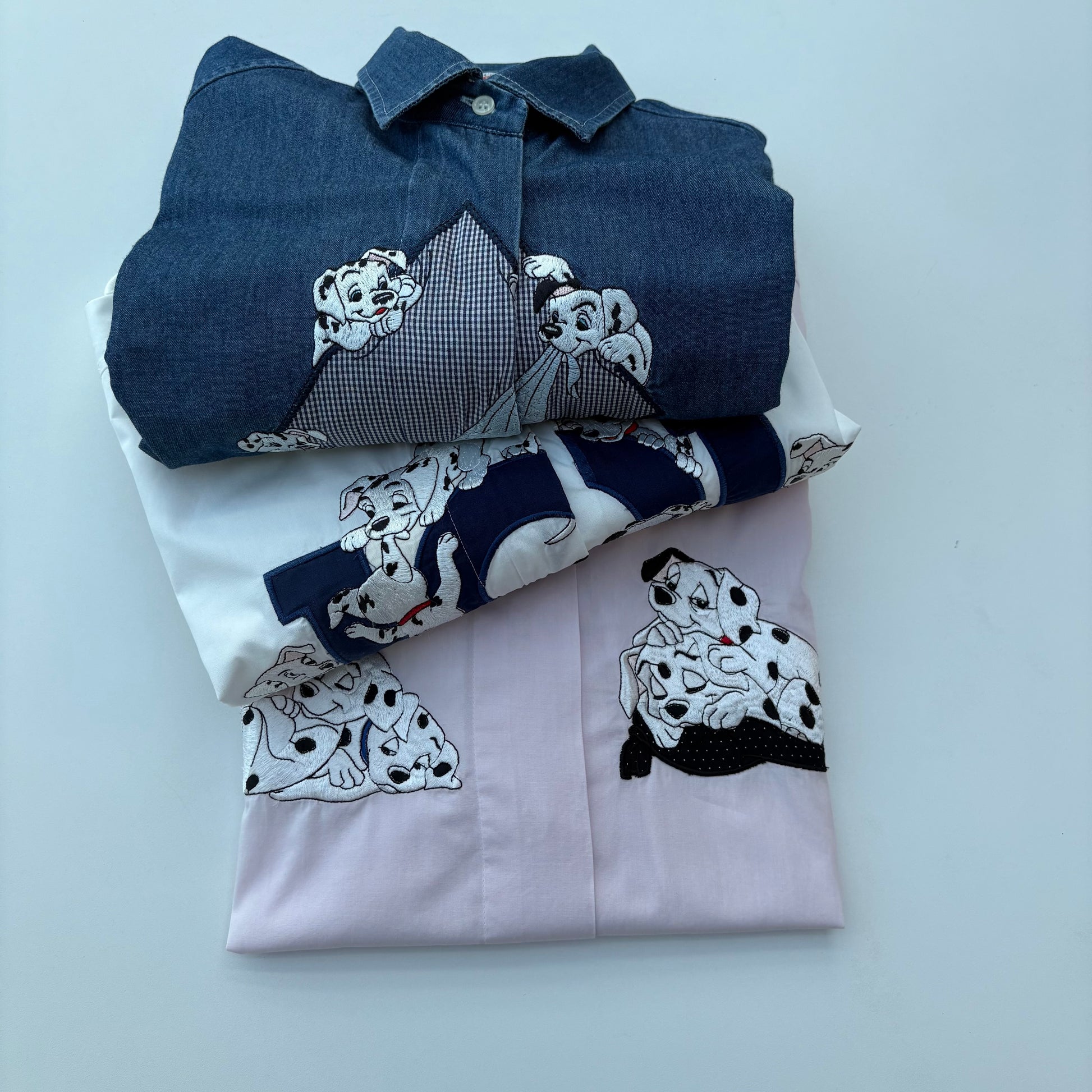 Camicia vintage anni 90 di Schvili, in denim lavaggio scuro con ricamo dedicato ai dalmata.