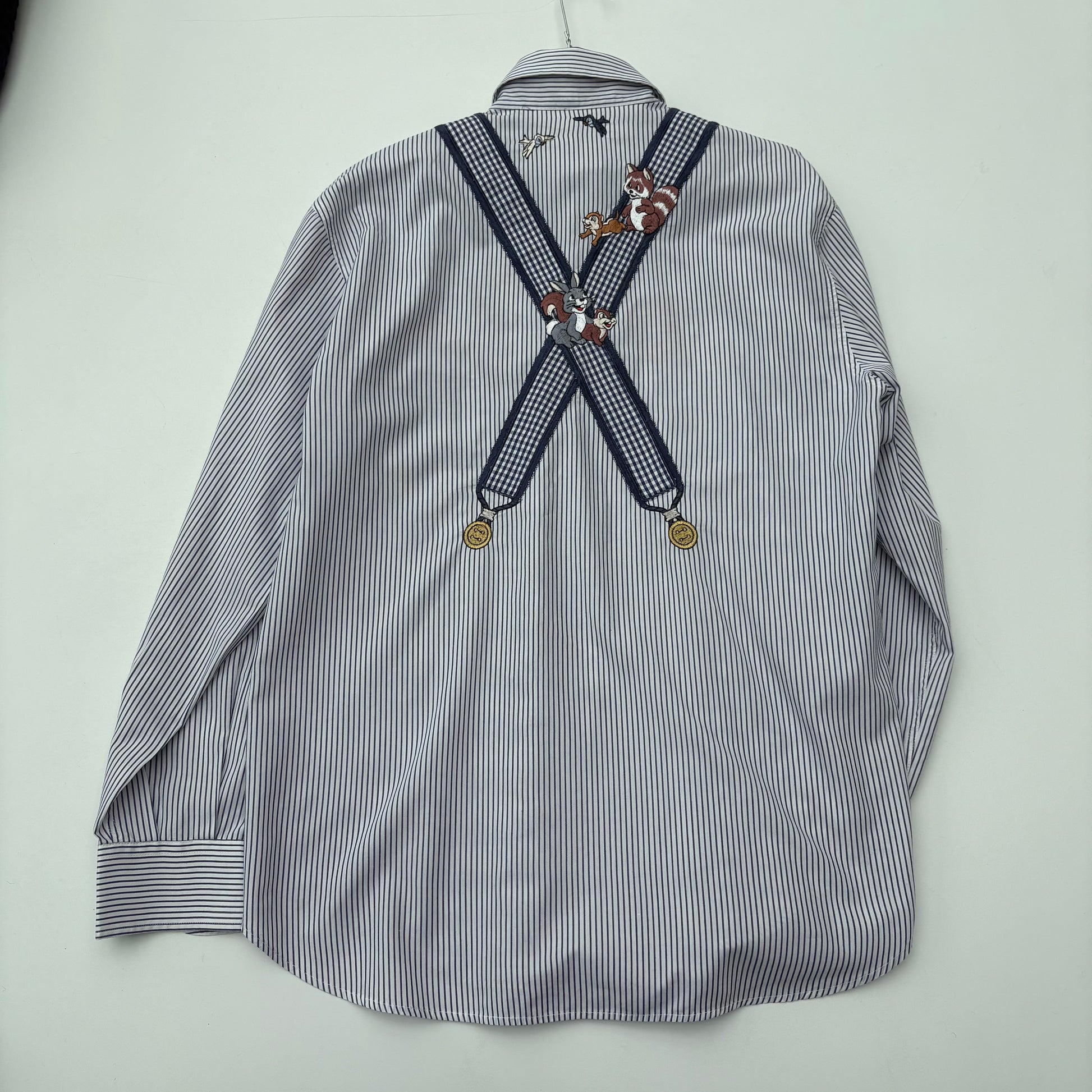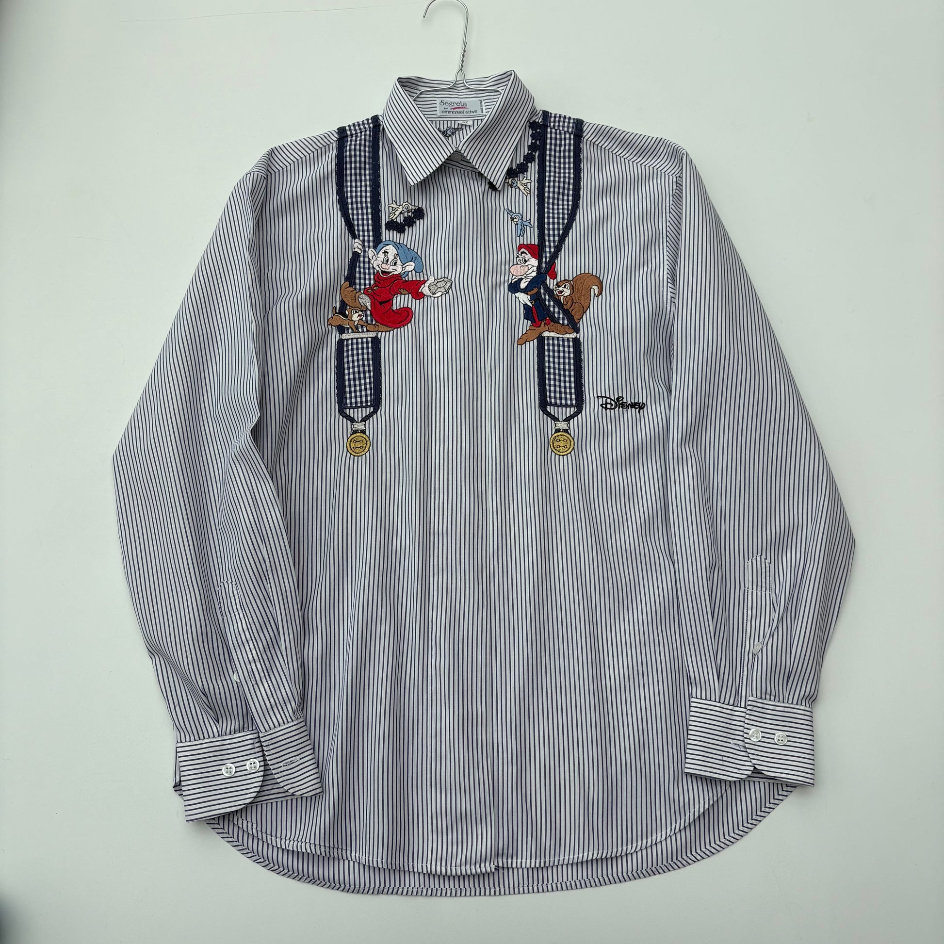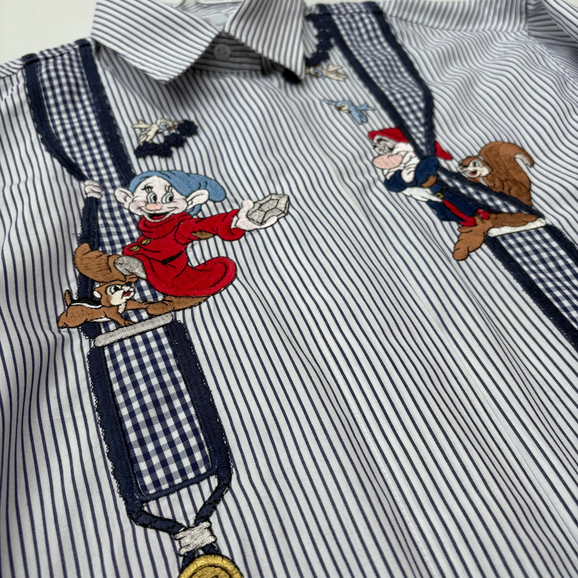 Spettacolare camicia vintage anni 90 di Schvili a righe bianco e blu con bretelle effetto trompe l’oeil e ricamo dedicato ai 7 nani!