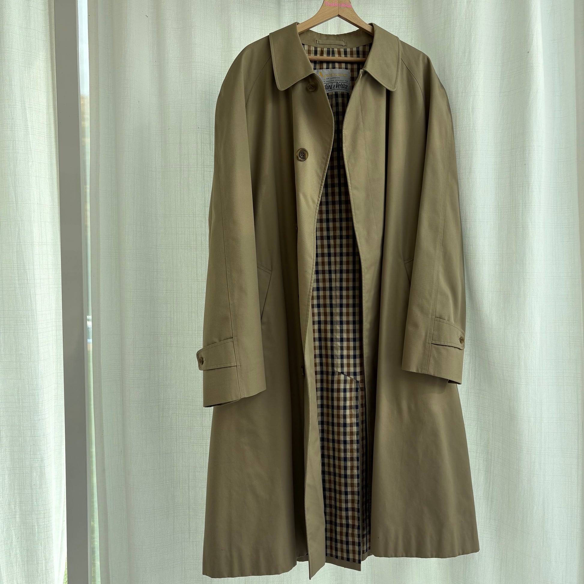 Il classico dei classici inglesi: l’impermeabile Aquascutum! Modello con spalla raglan, senza cintura. Anni 80, quando l’azienda produceva per i negozi autorizzati e personalizzava le etichette !
