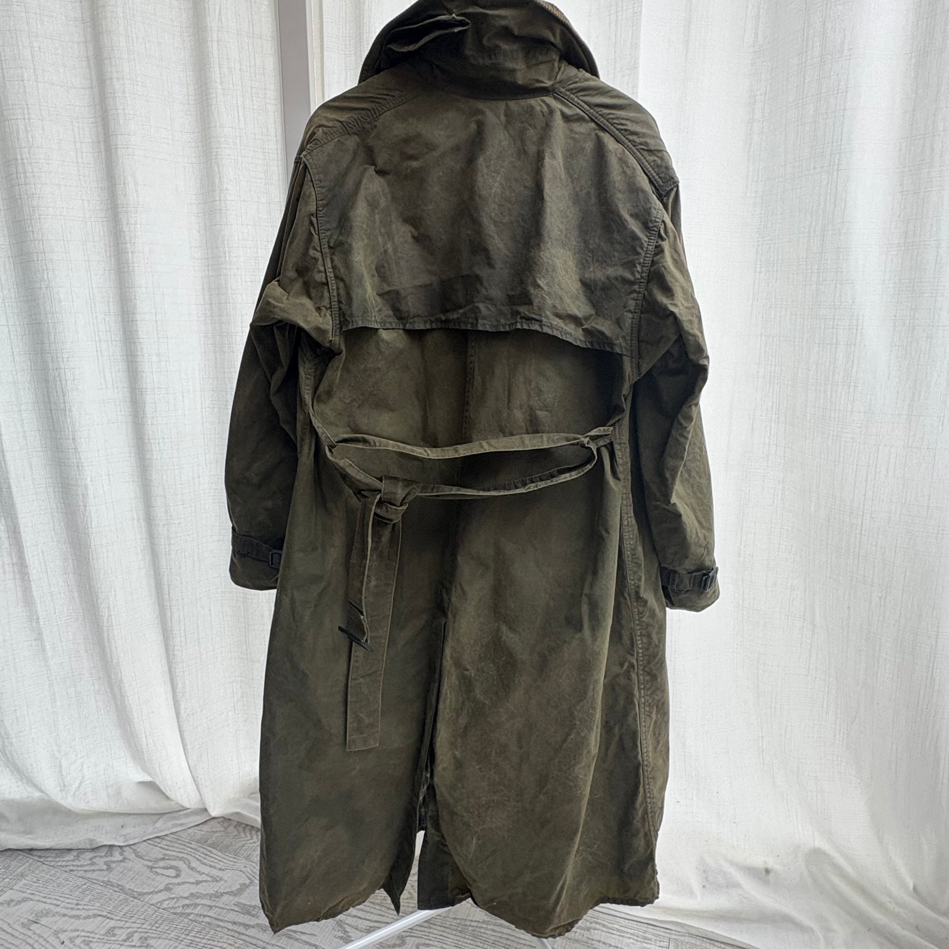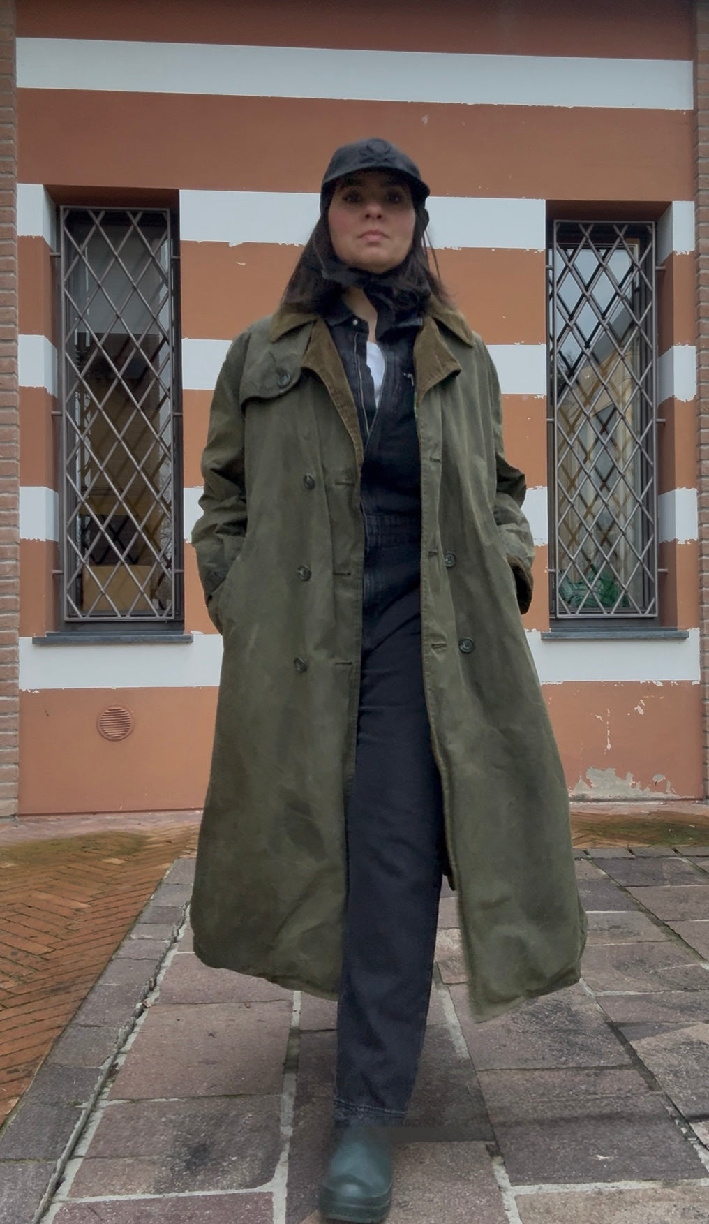Con mantellina, fascia per stringere il collo, cintura, fibbie sui polsi, dettagli al colletto- sui polsini e all’interno in velluto millerighe verde.