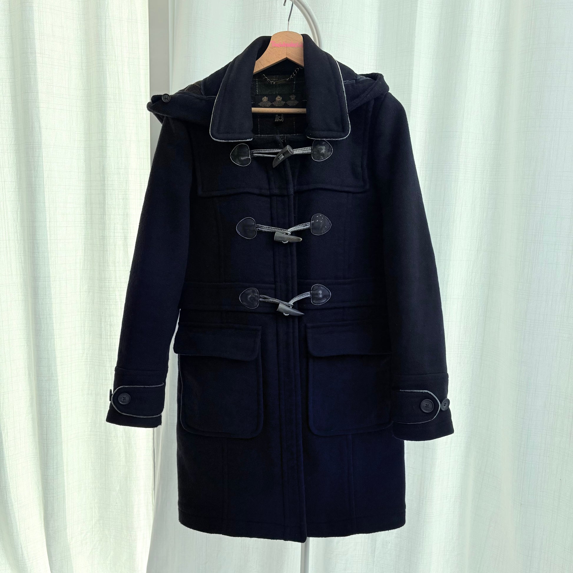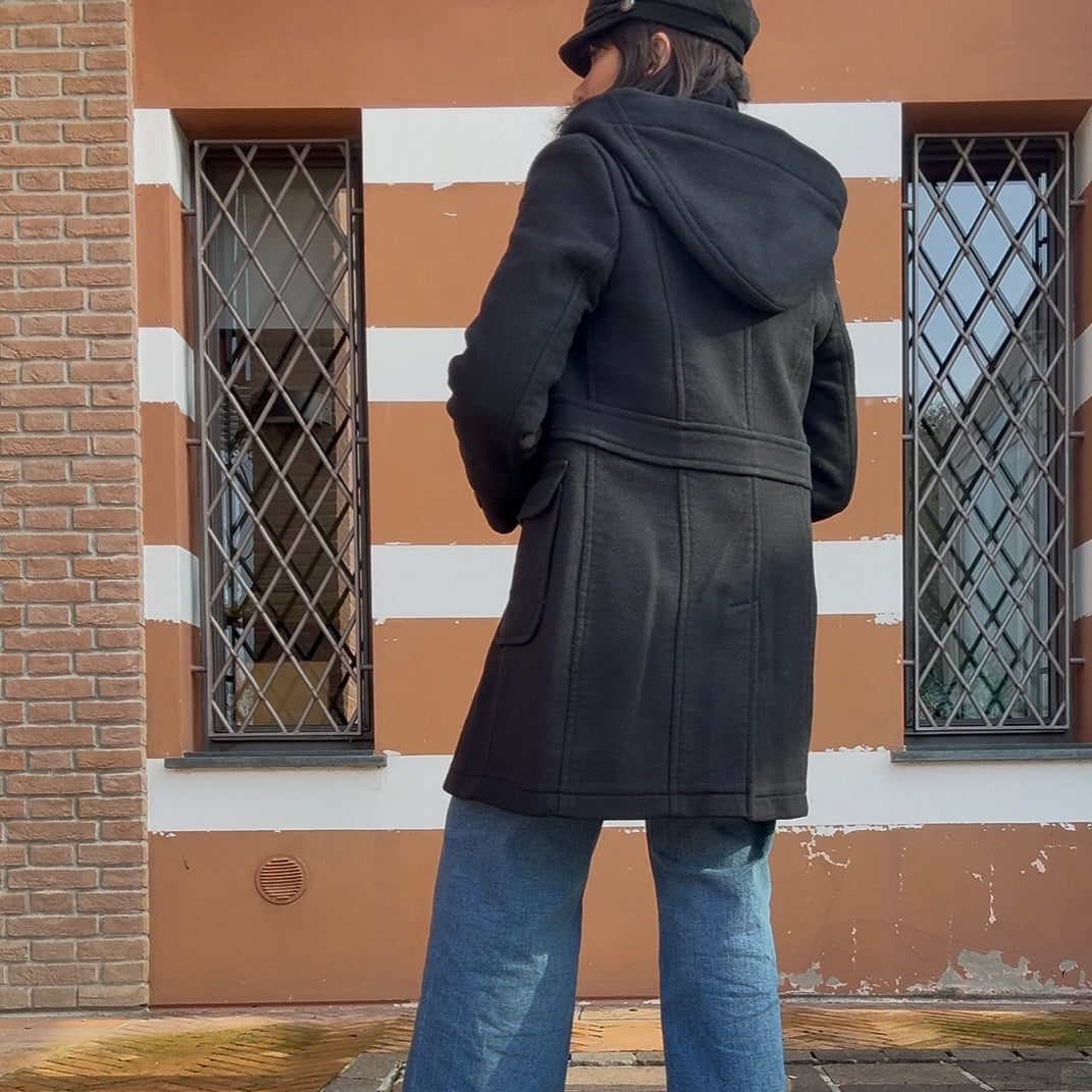 cappuccio staccabile, si chiude con zip e alamari.