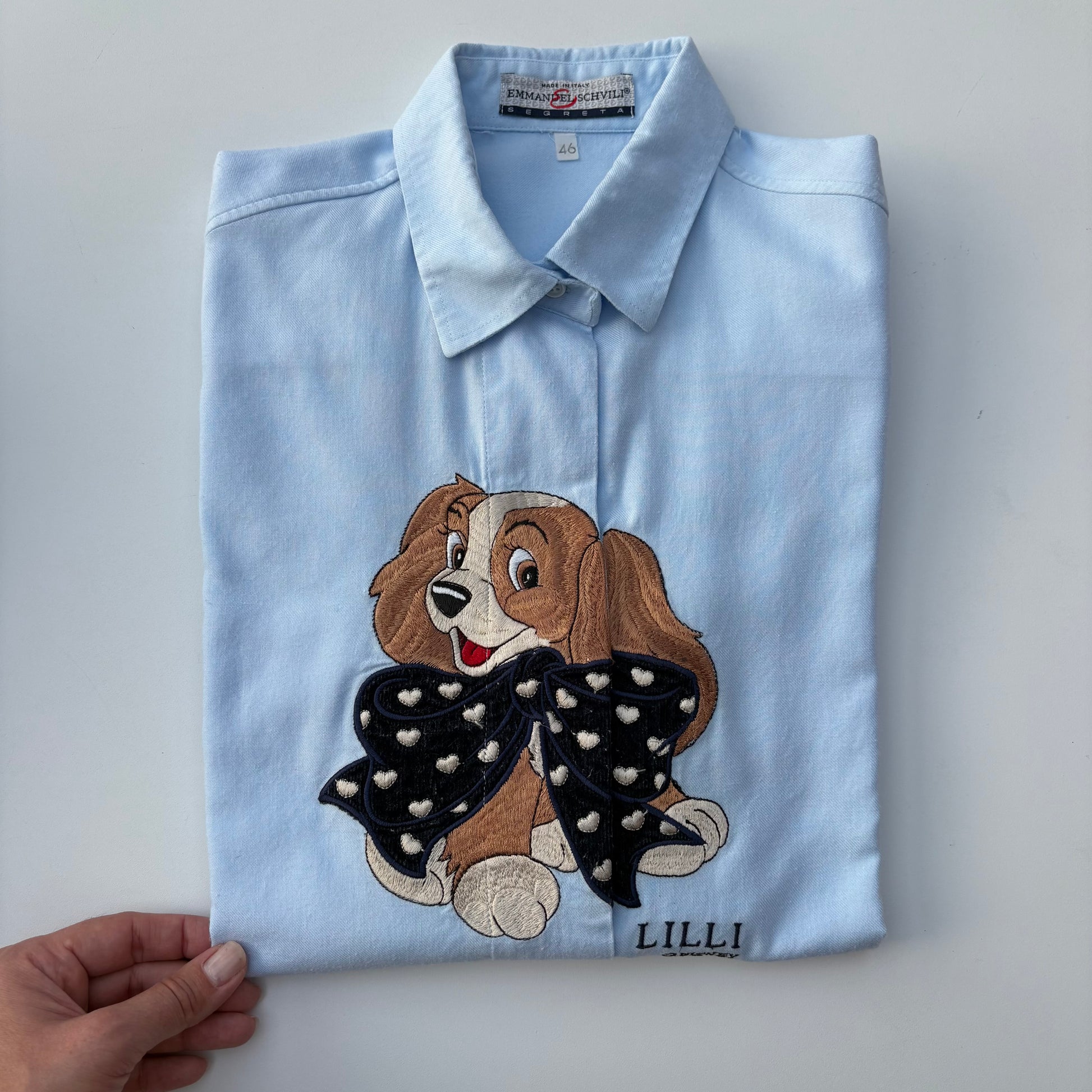 Camicia vintage anni 90 di Schvili, in cotone e viscosa, con effetto leggermente felpato ma molto sottile azzurro con ricamo dedicato a Lilli.