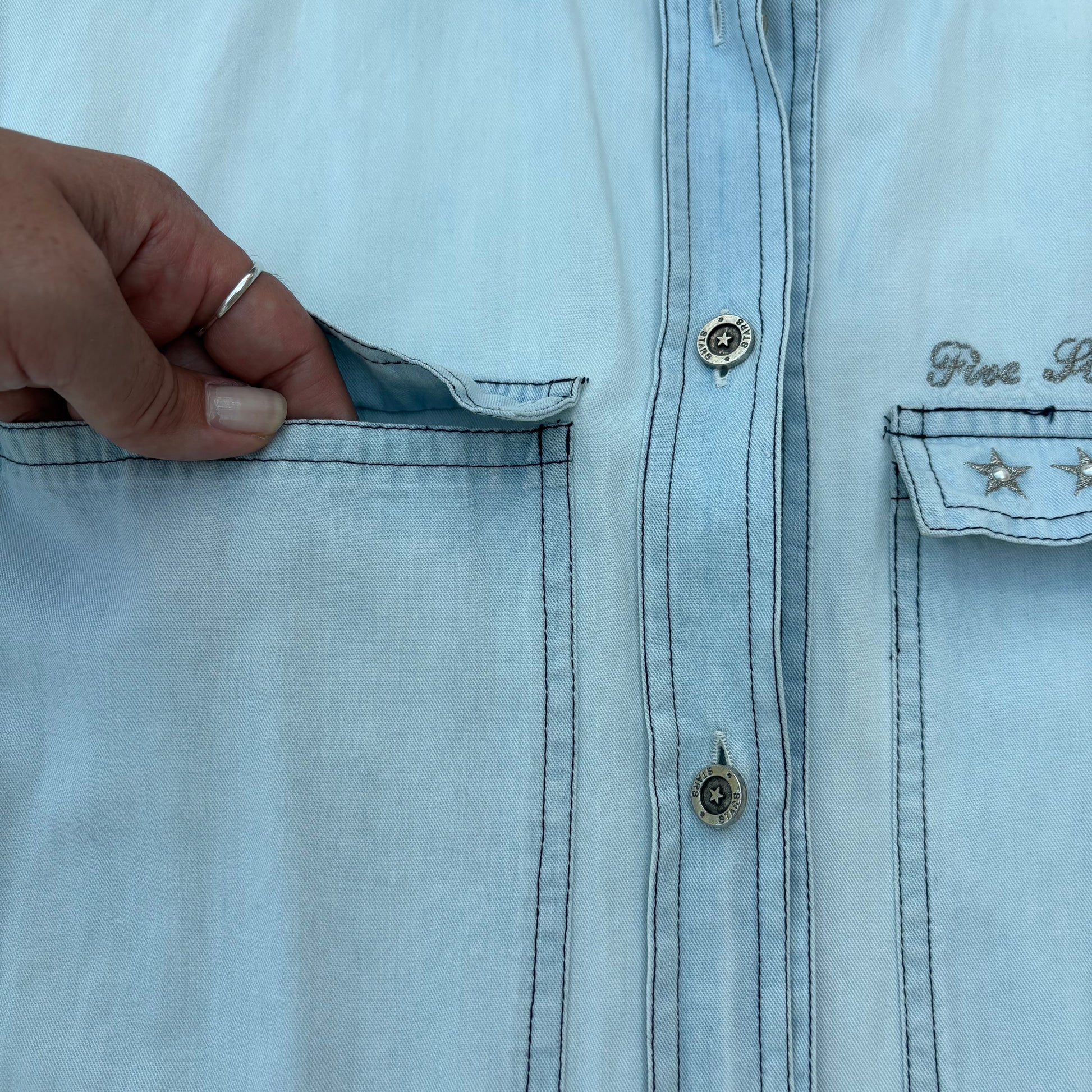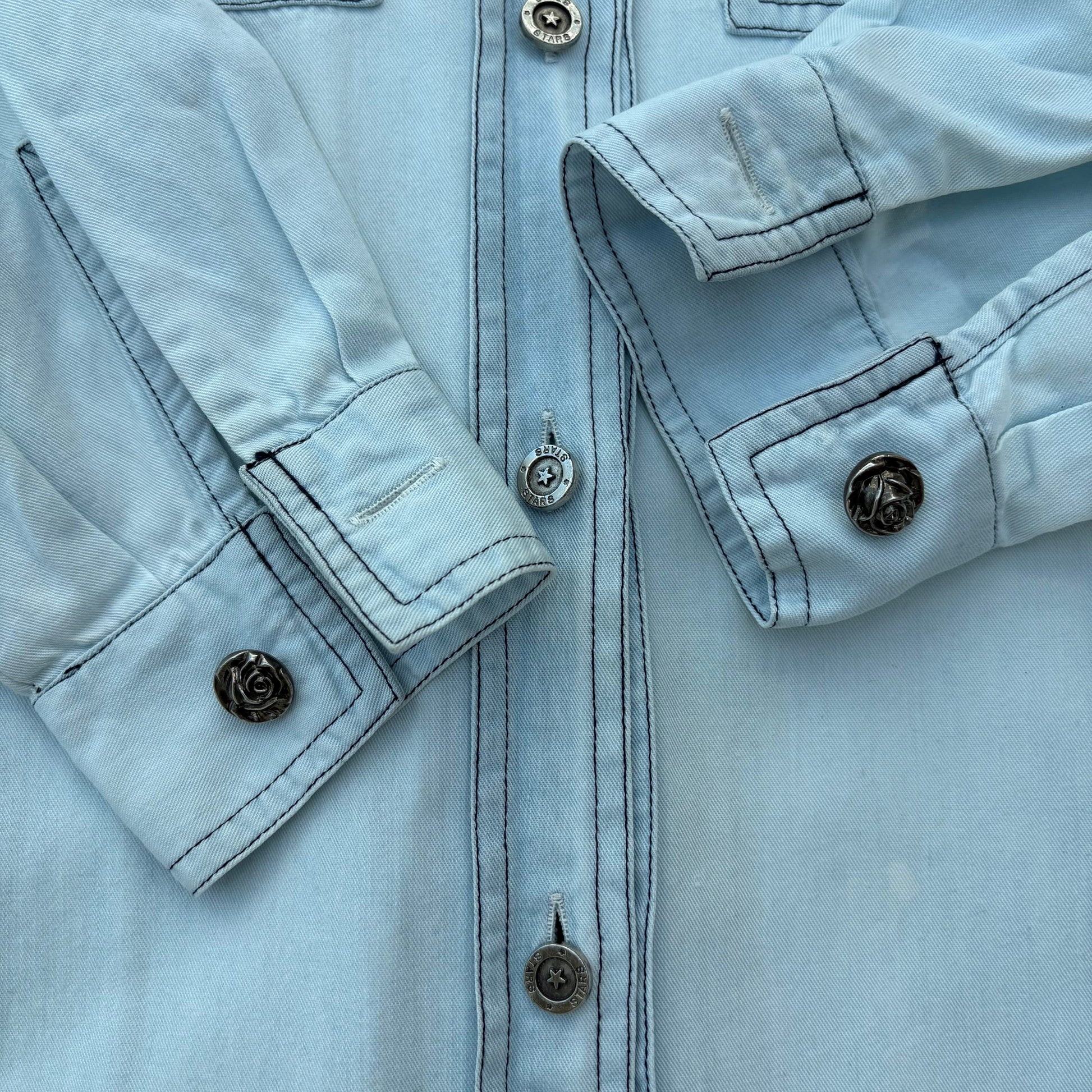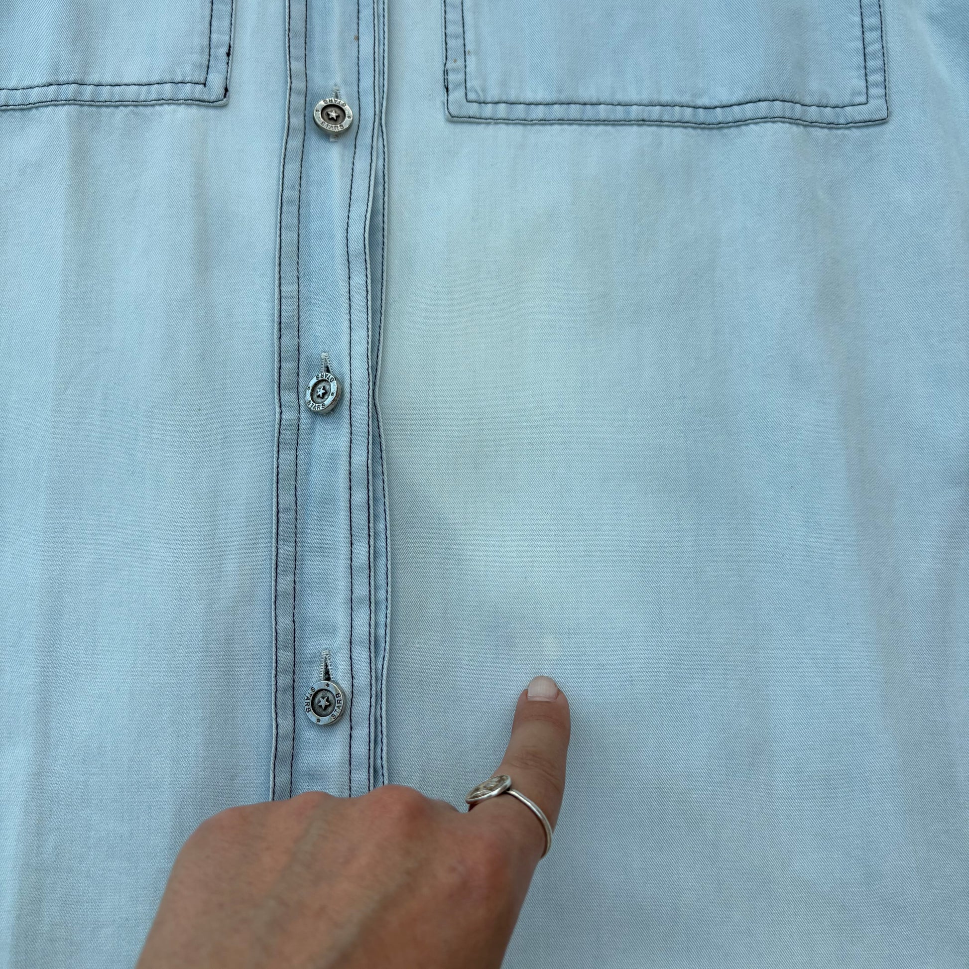 Anni 80 di Les Copains, chemisier in denim leggero e super morbido, lavaggio azzurro chiarissimo con effetto delave.