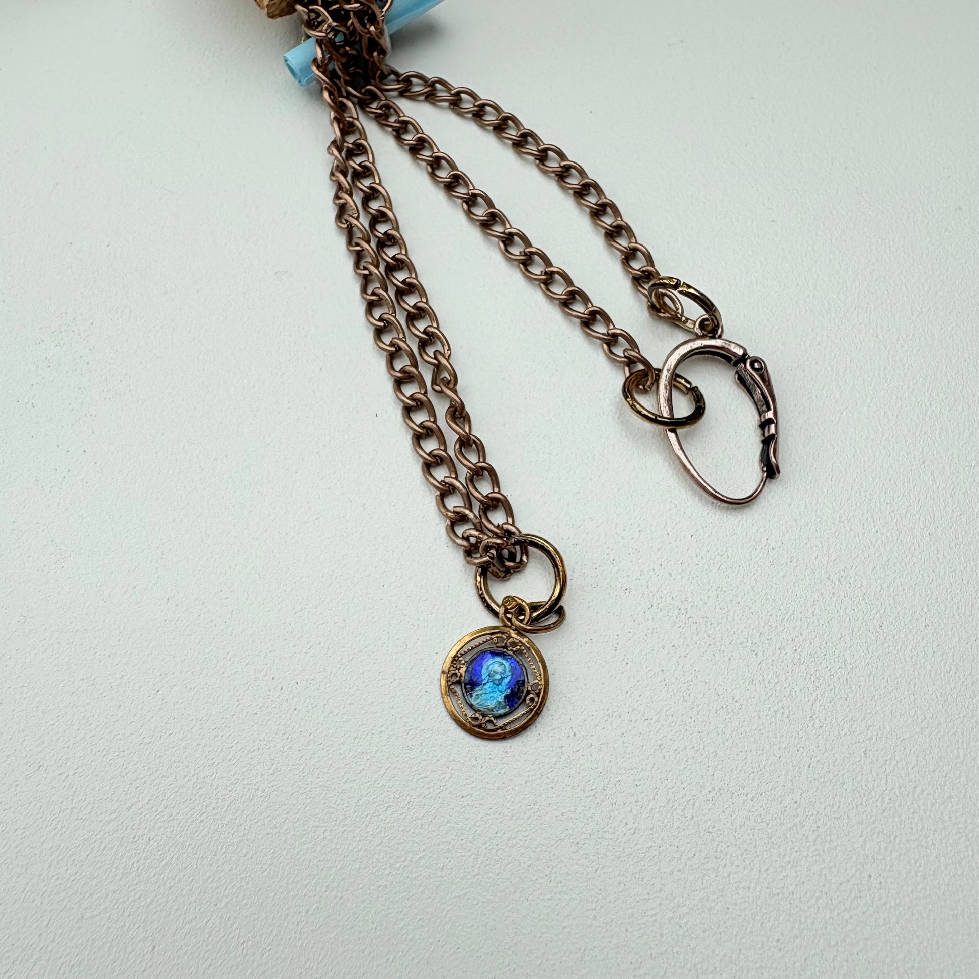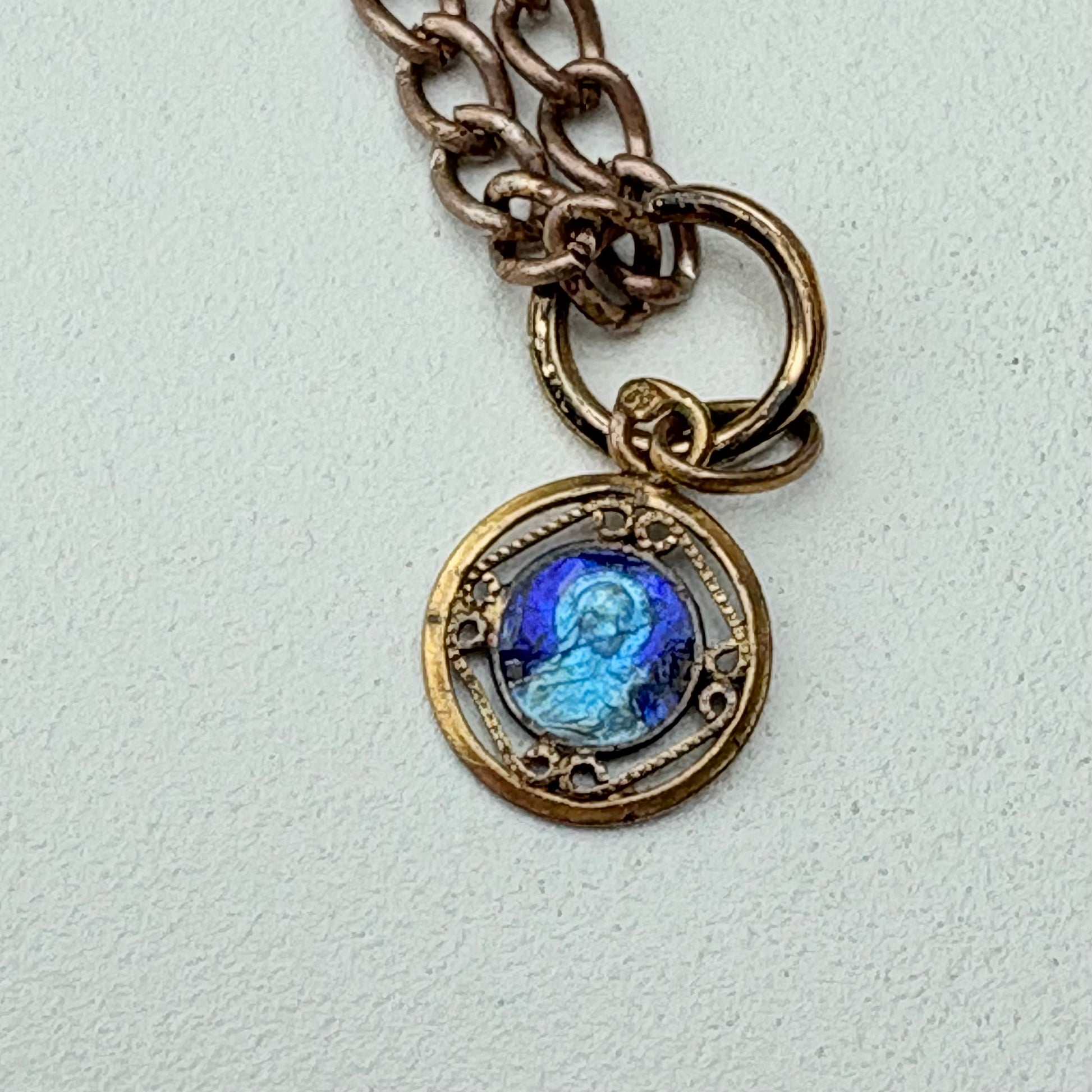 Vintage francese-collanina con medaglietta ottone smaltato in azzurro/blu raffigurante la Madonna di Lourdes. Double.