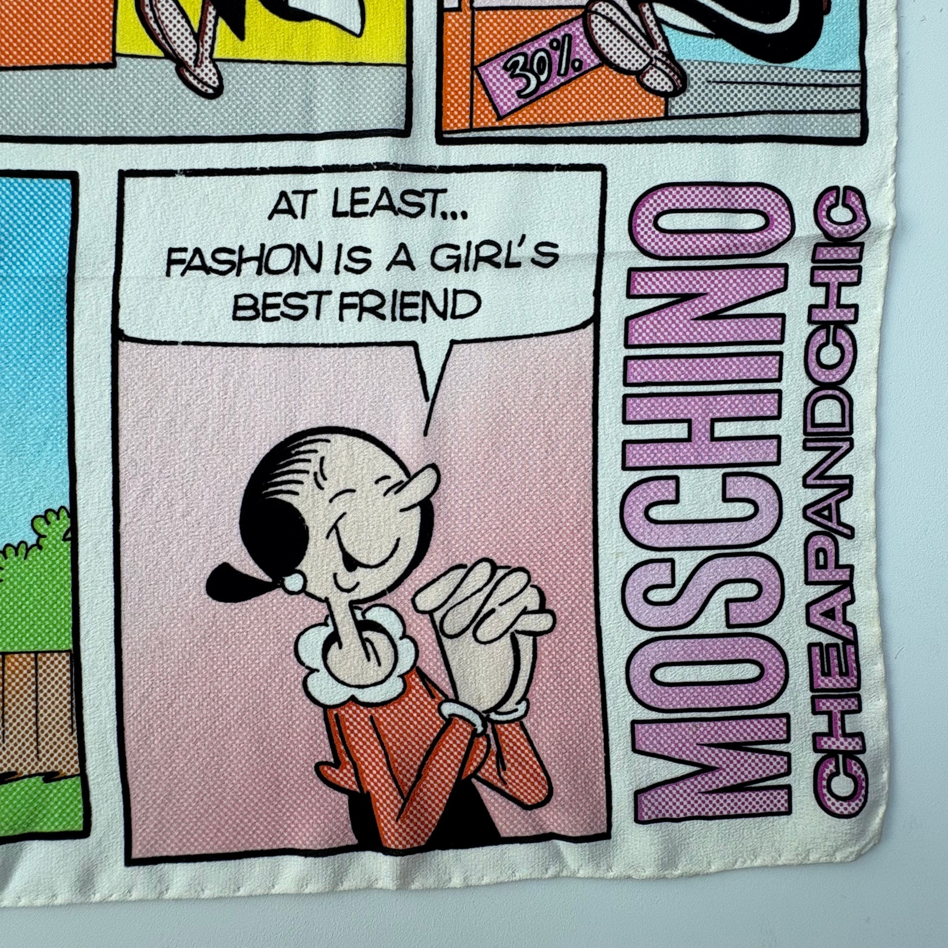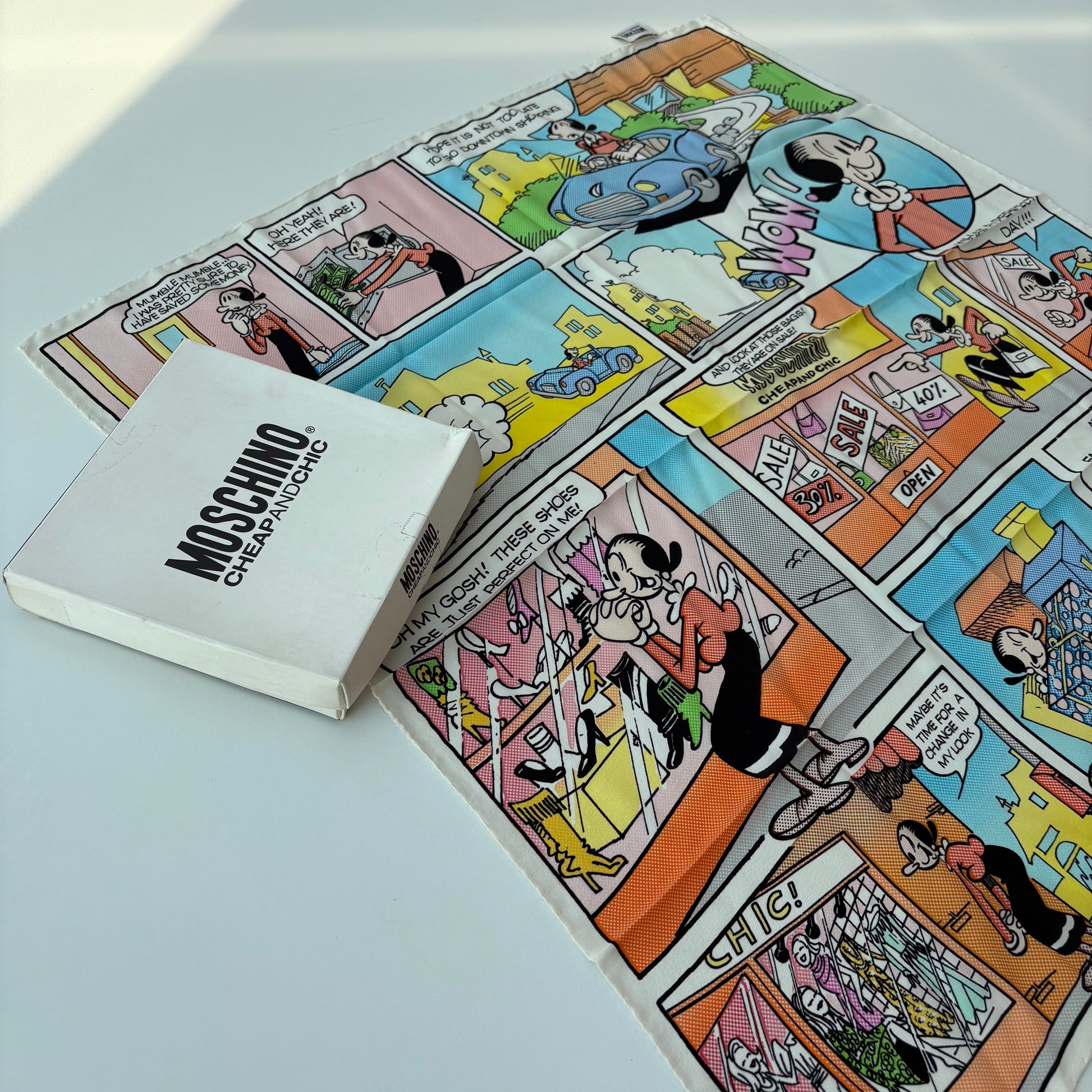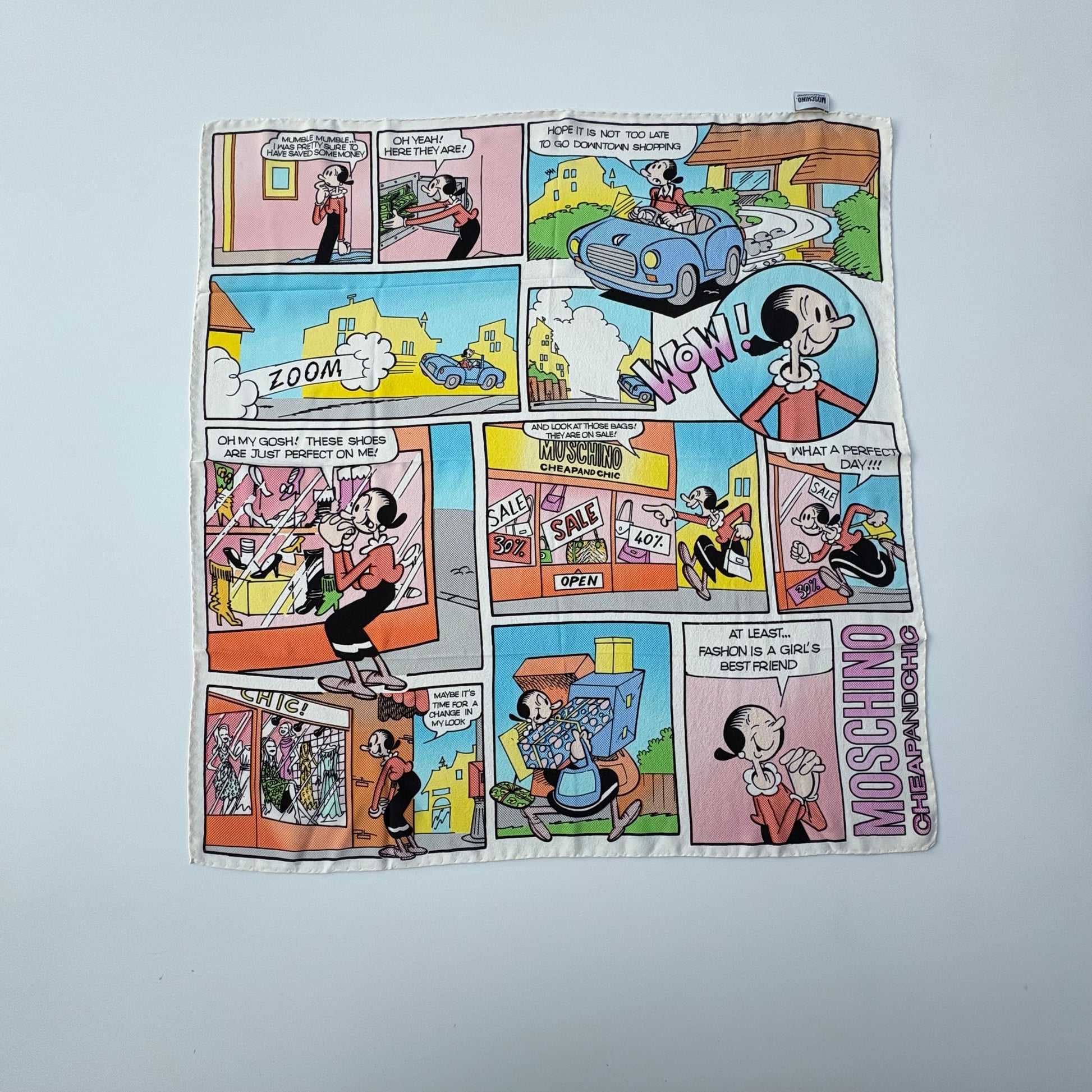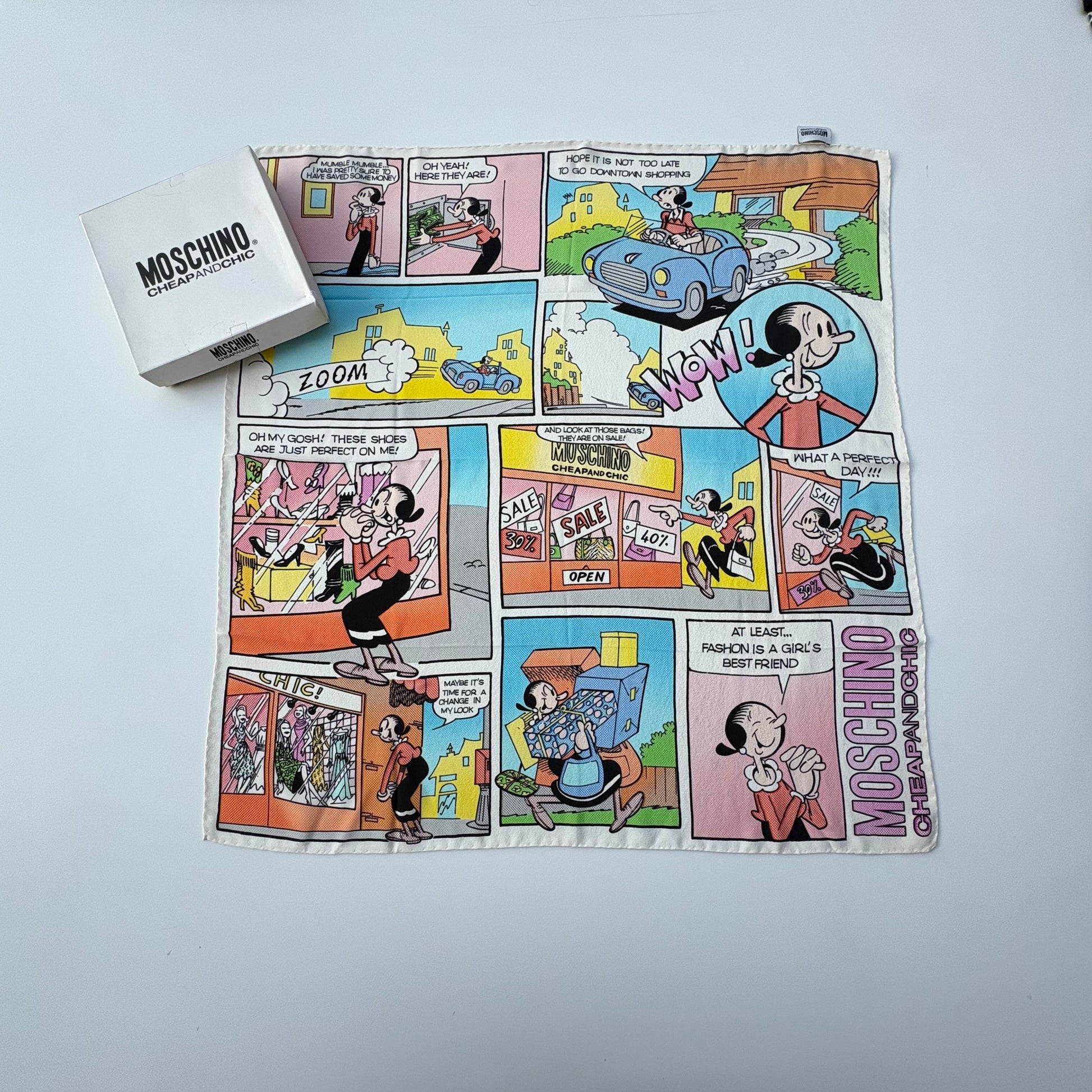 Foulard Moschino in purissima seta Lario con fumetto dedicato a Olivia in una giornata di shopping sfrenato.