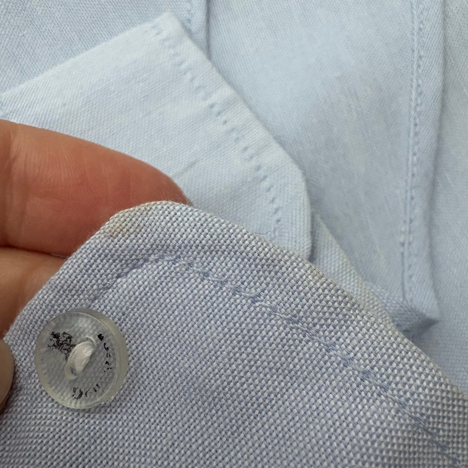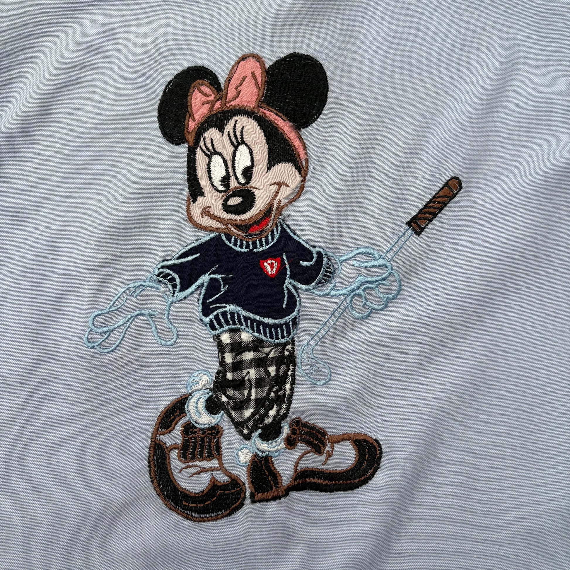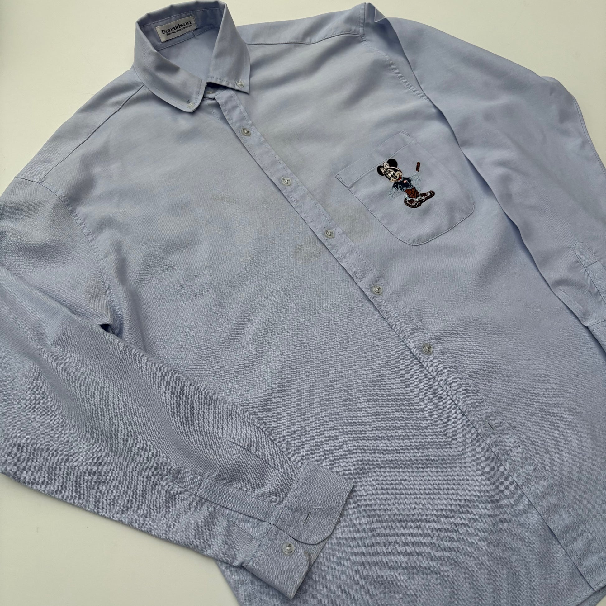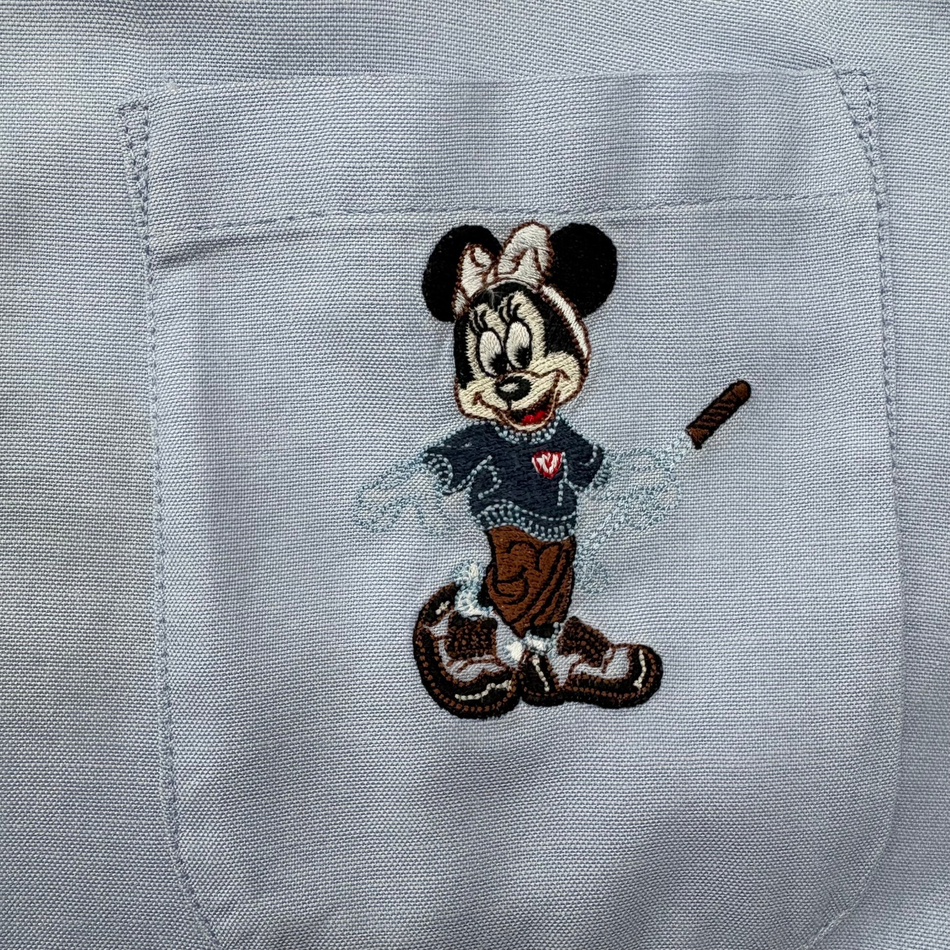 Di Donaldson, camicia azzurra in cotone, button down, con ricamo dedicato a Minnie sul taschino davanti e sulla schiena.