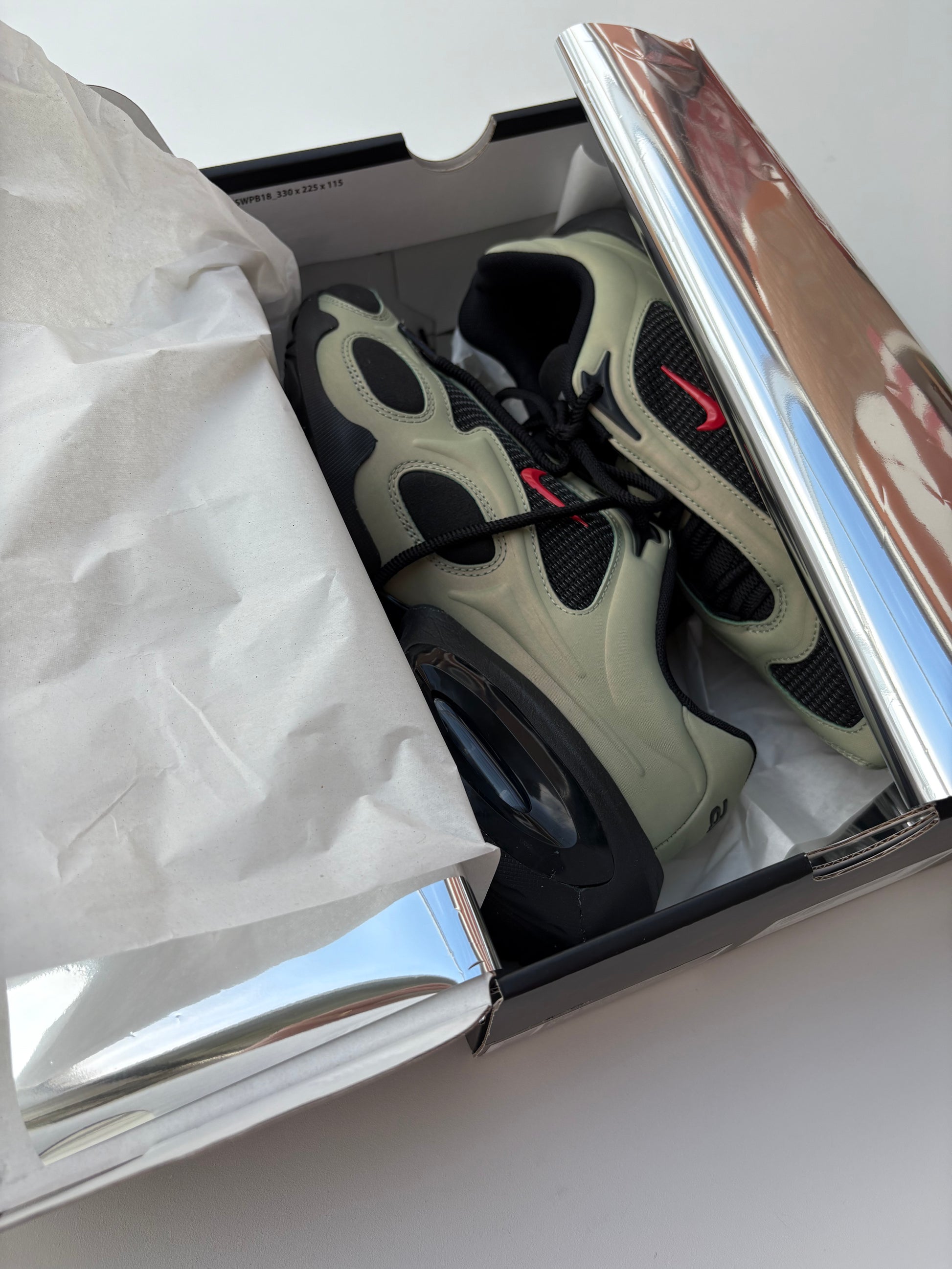 ”Le proporzioni esagerate, le finiture eleganti e l'arco plantare inaspettatamente alto mettono in mostra la tecnologia Air da cui il modello prende il nome.” Parola di Nike.