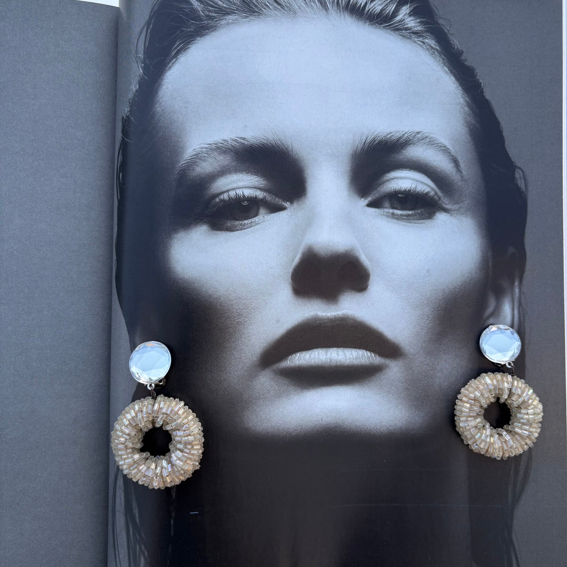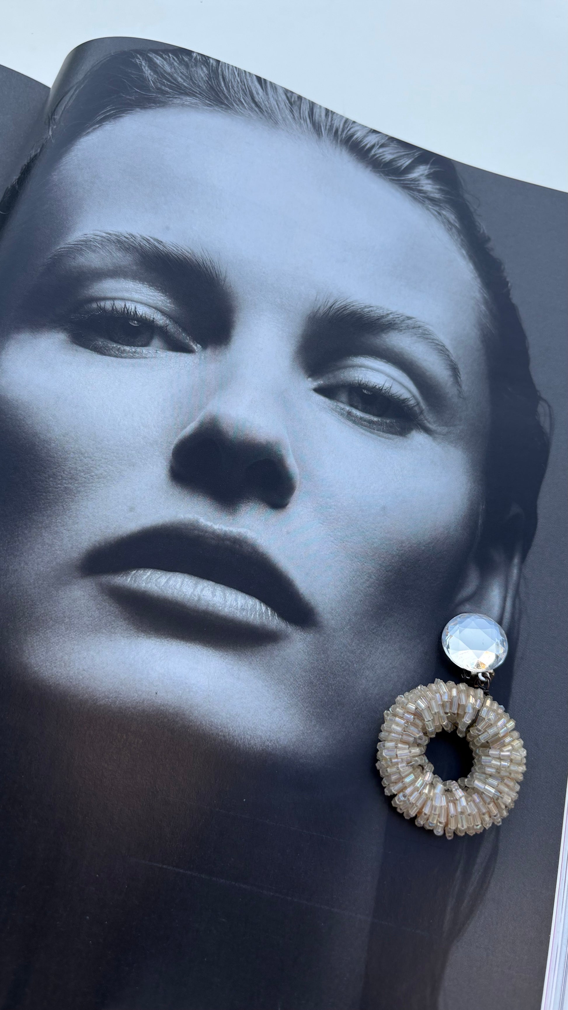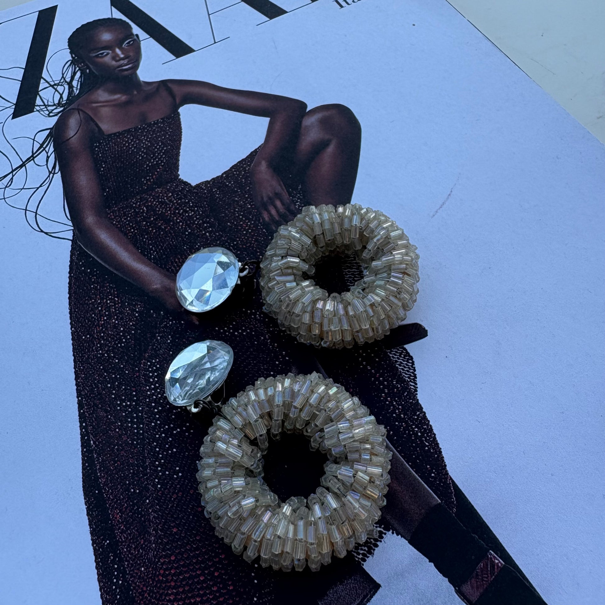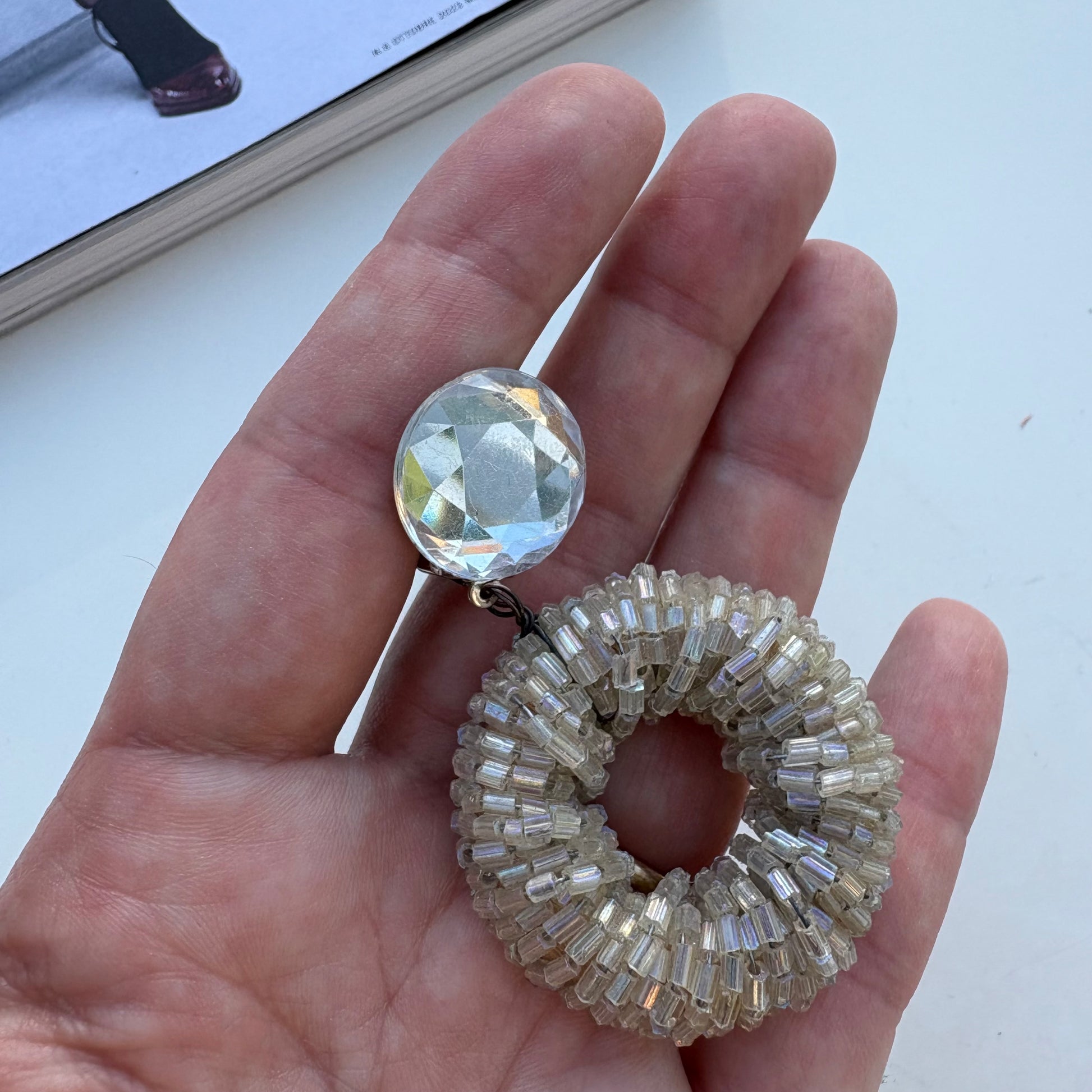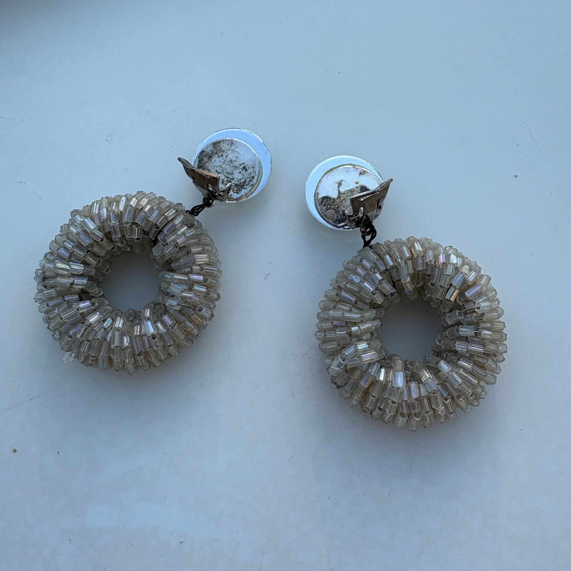 Orecchini a clip con cerchi ricoperti di corallini color ghiaccio.