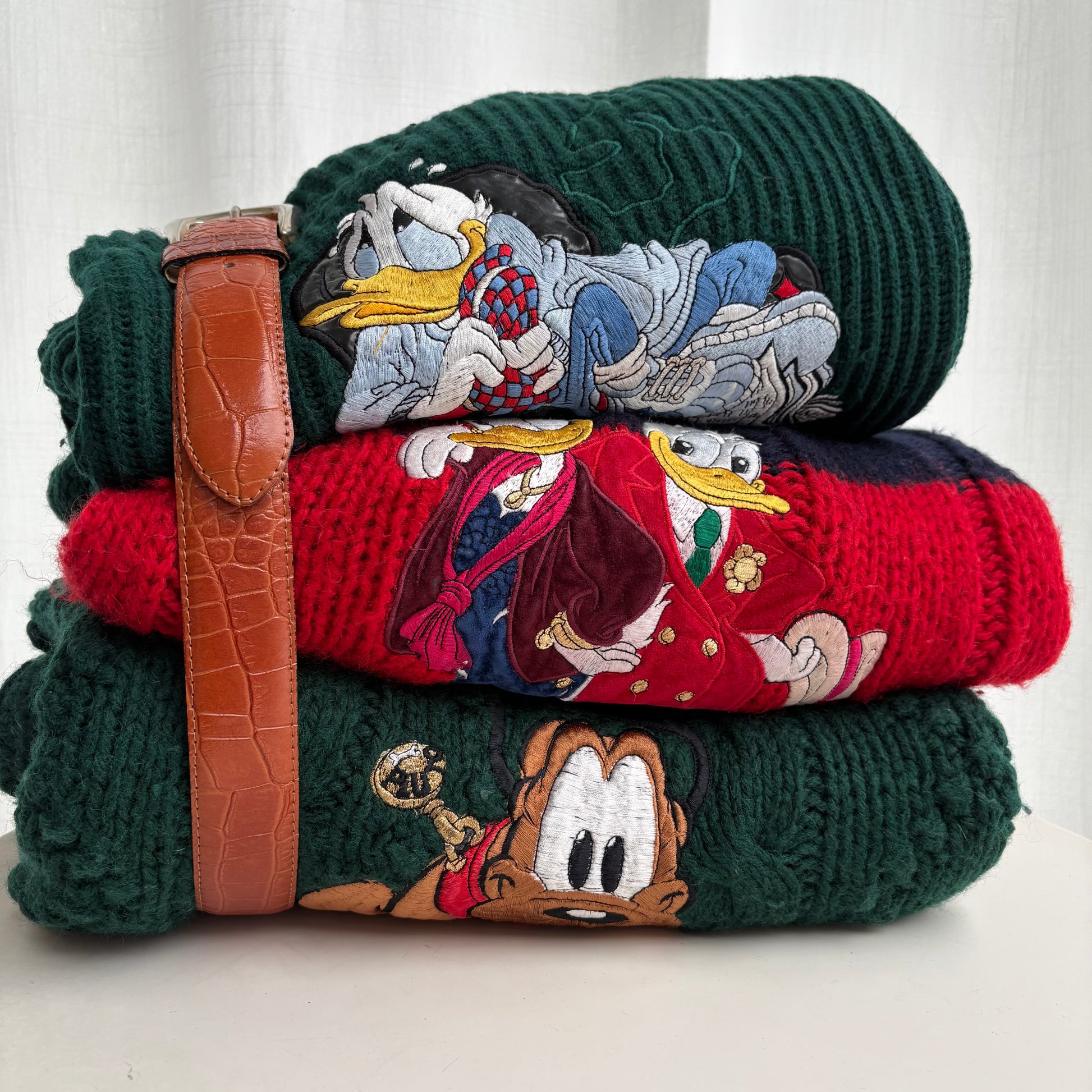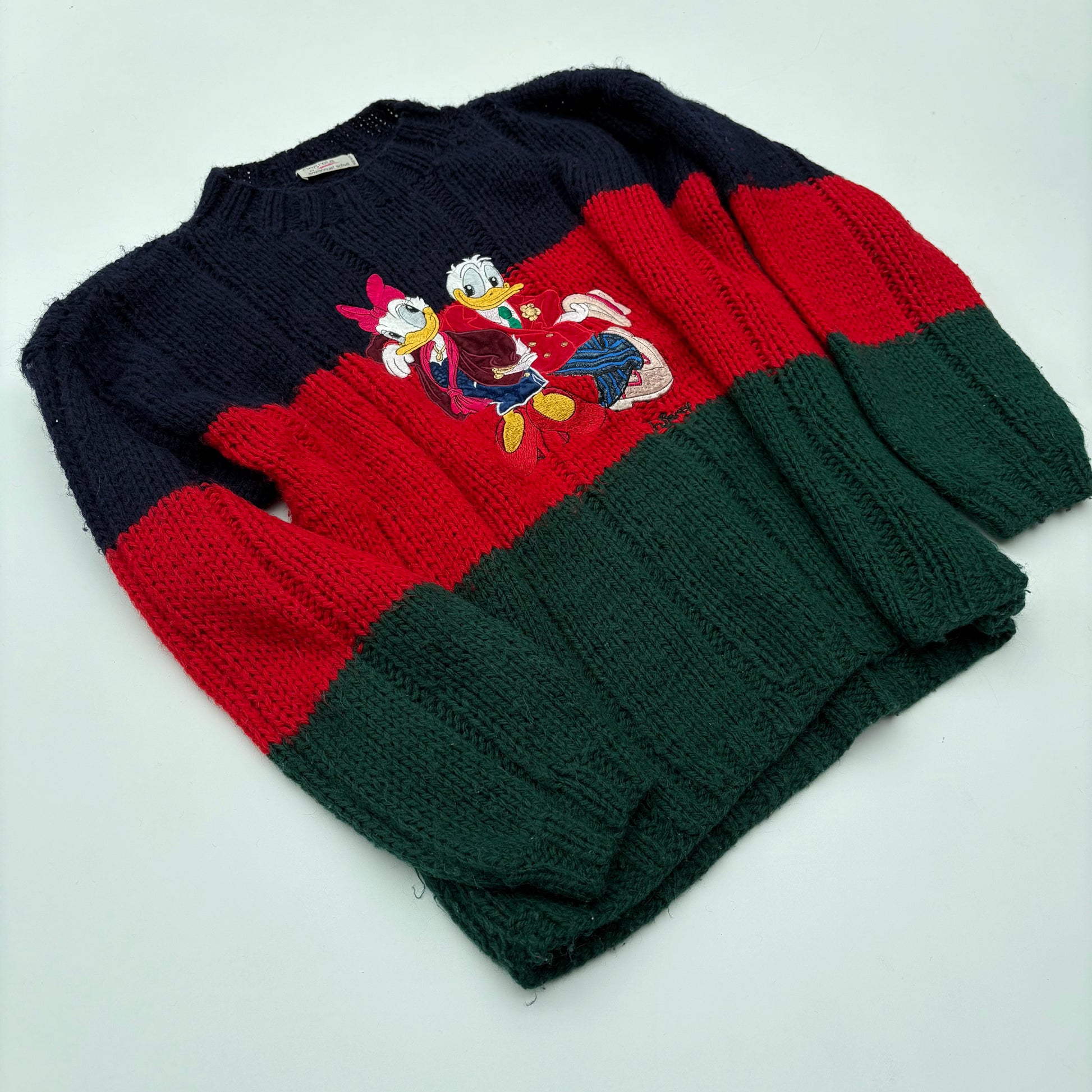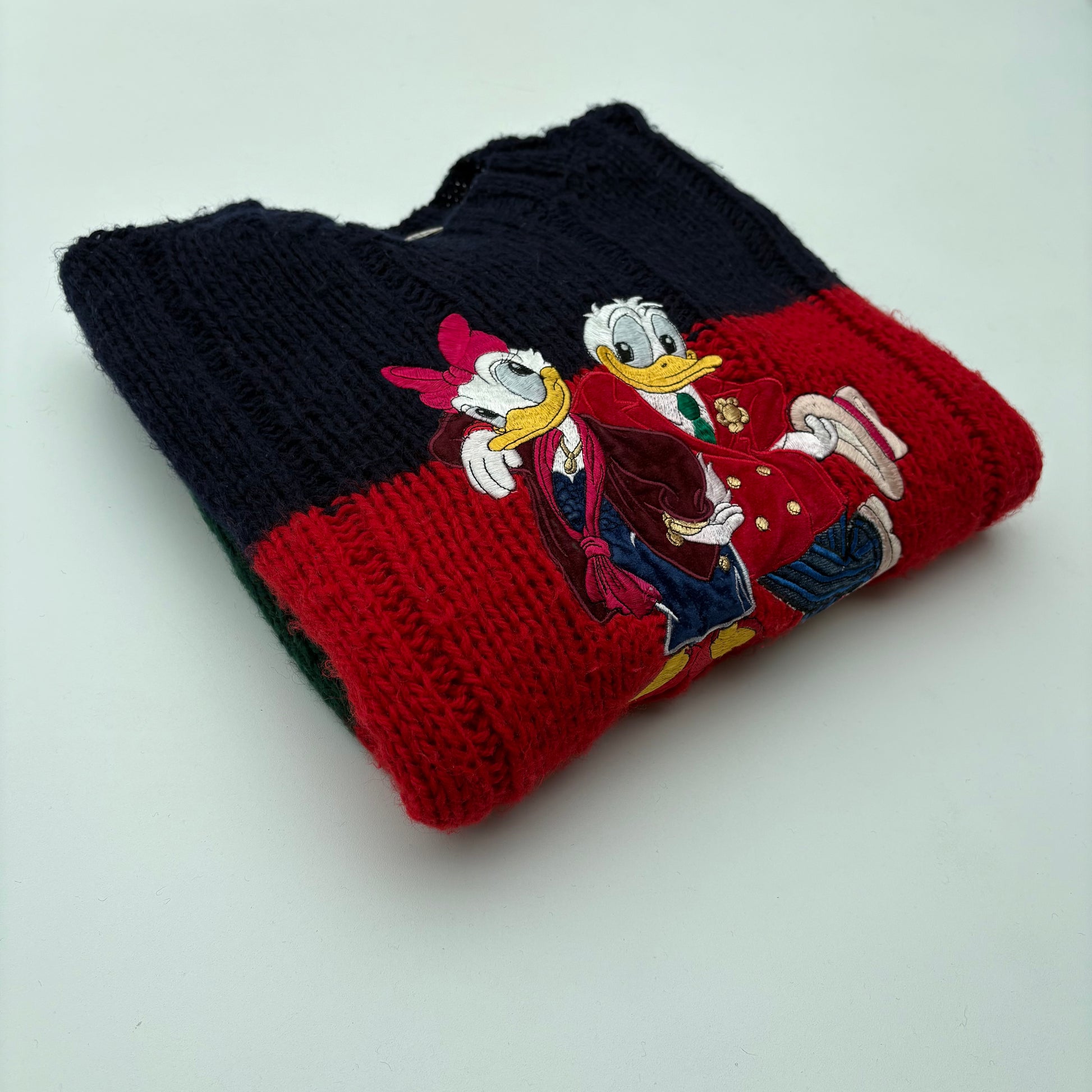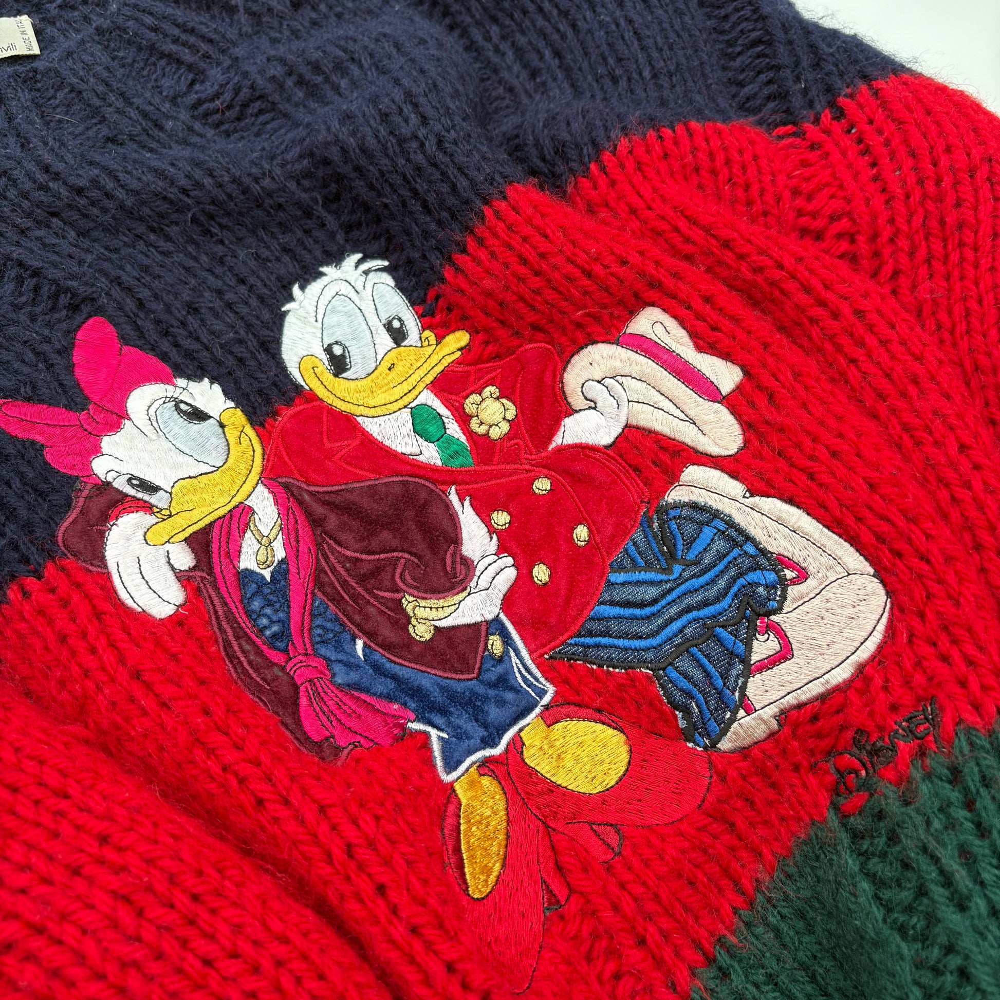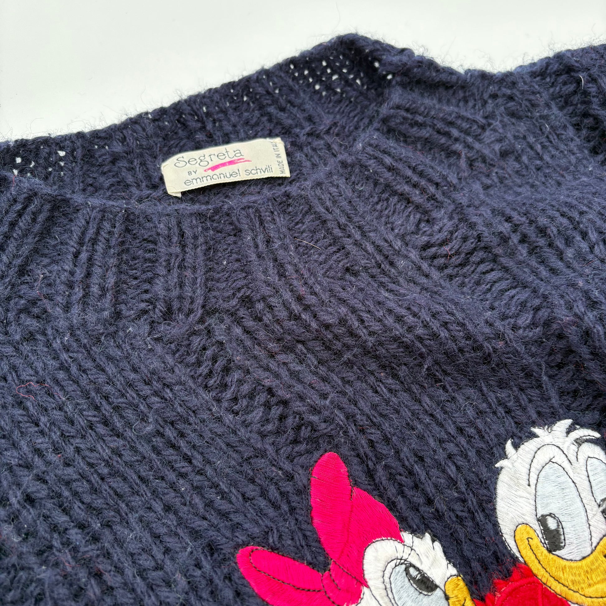 Pull vintage anni 90 by Schvili, in misto Iana (manca etichetta di composizione, ma al tatto sembra esserci anche lana mohair) , a righe con ricamo a tema Paperina e Paperino in abito da seratona!