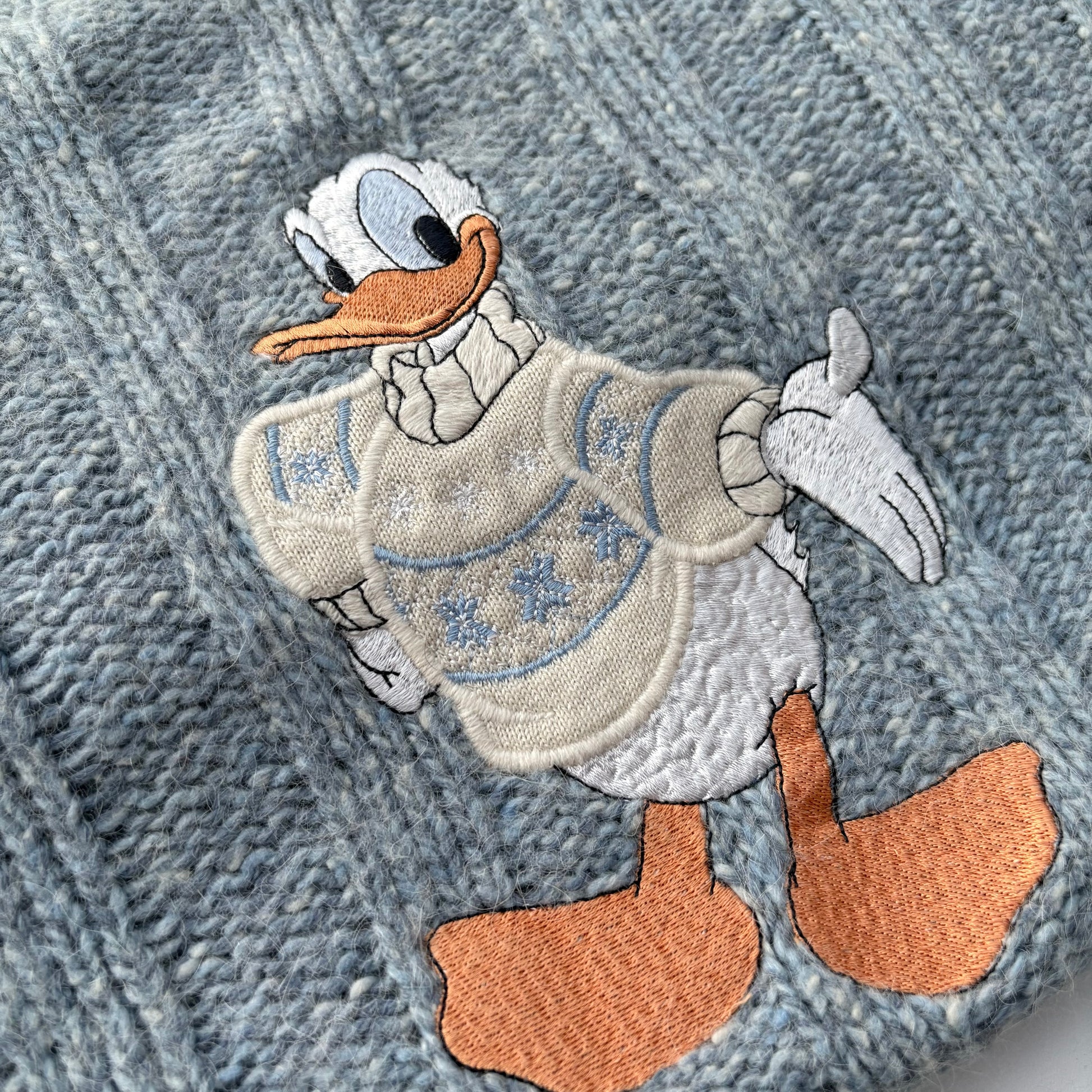 Pullover vintage anni 90 bicolor (azzurro polvere e corda) effetto mélange di Georgya Studio con ricamo centrale dedicato a Paperino.