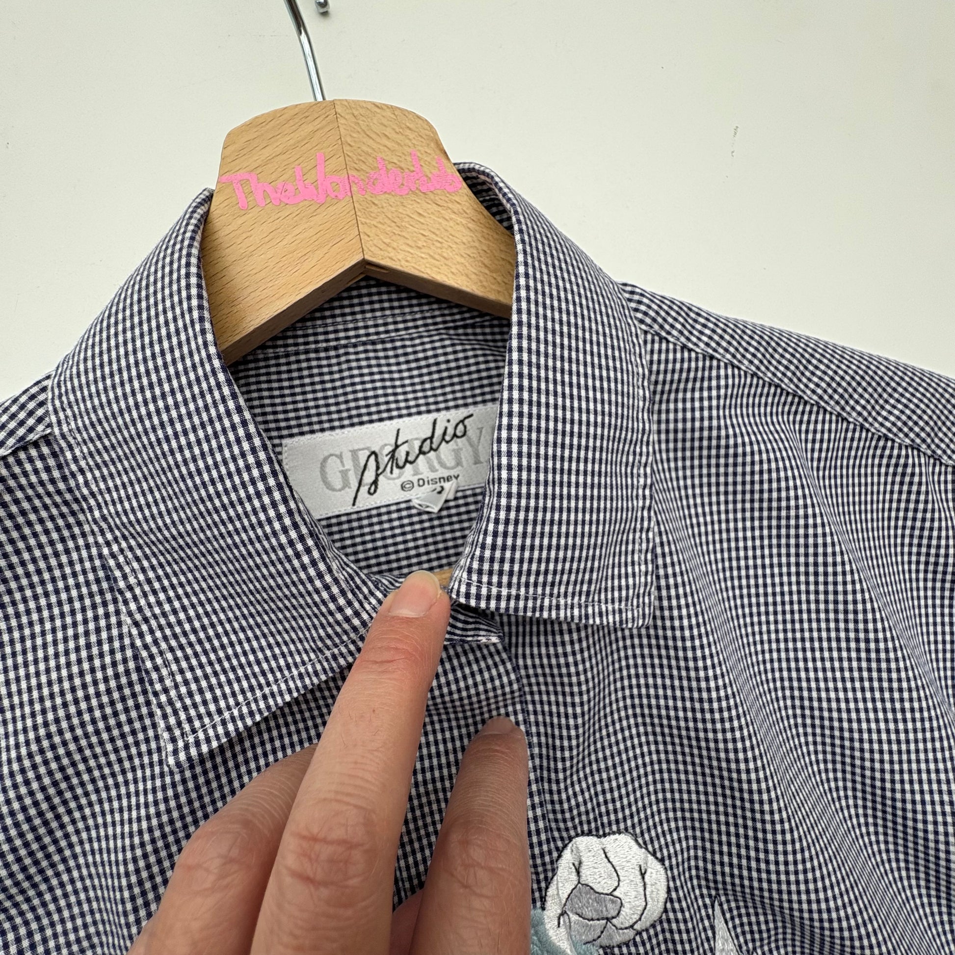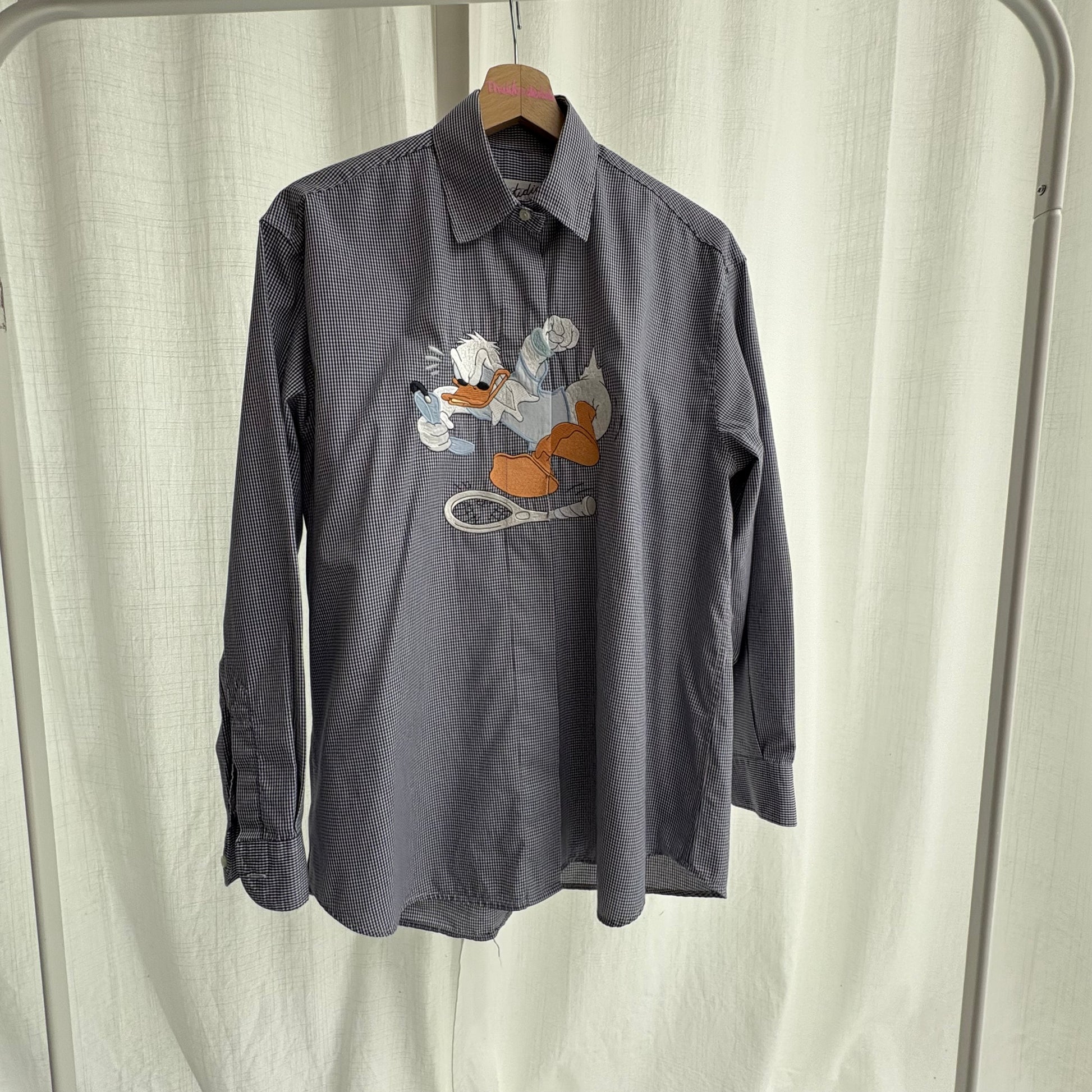 di Georgya Studio, camicia in cotone a quadretti vichy in bianco e blu con ricamo sul davanti dedicato a un Paperino tennista! Taglio dritto e morbido.