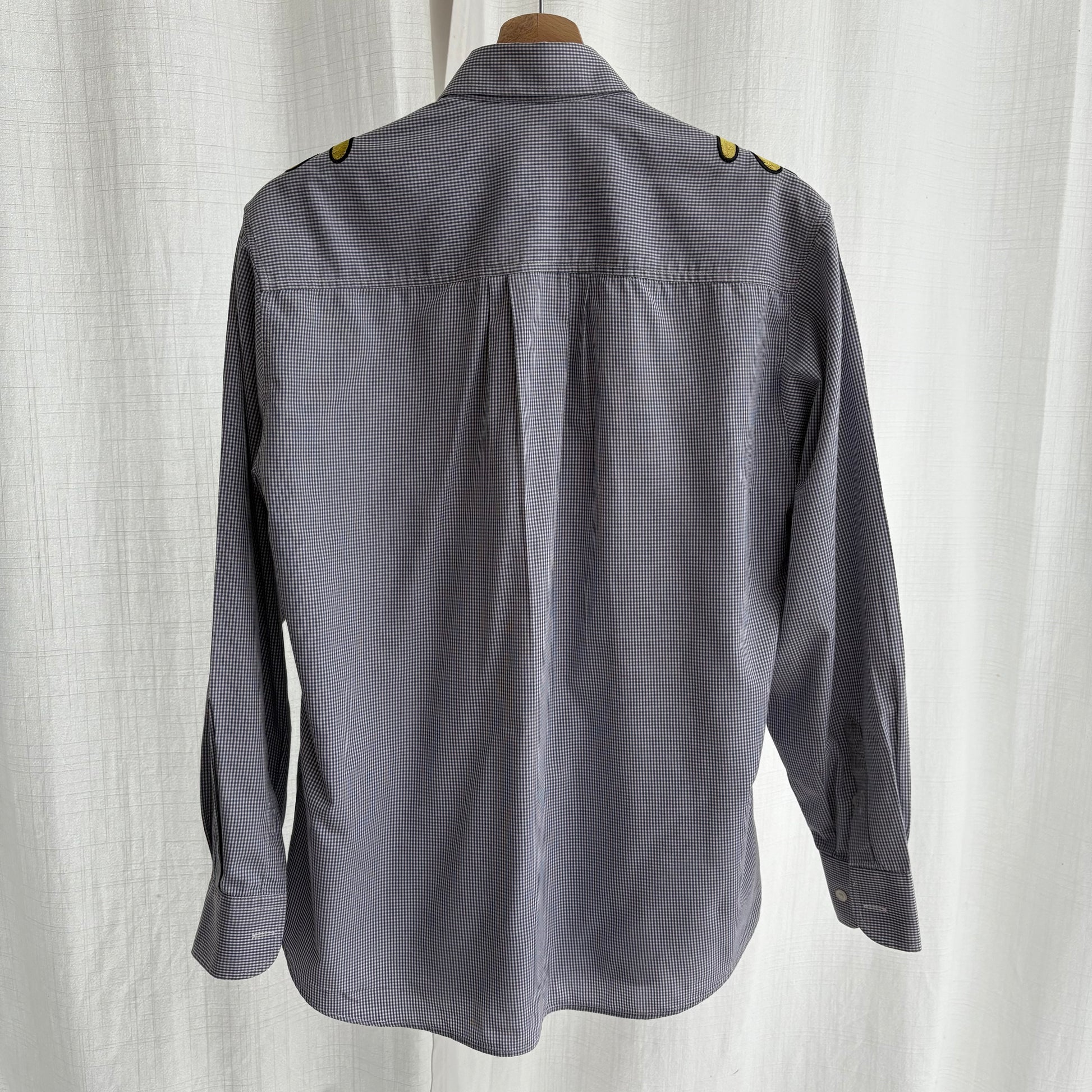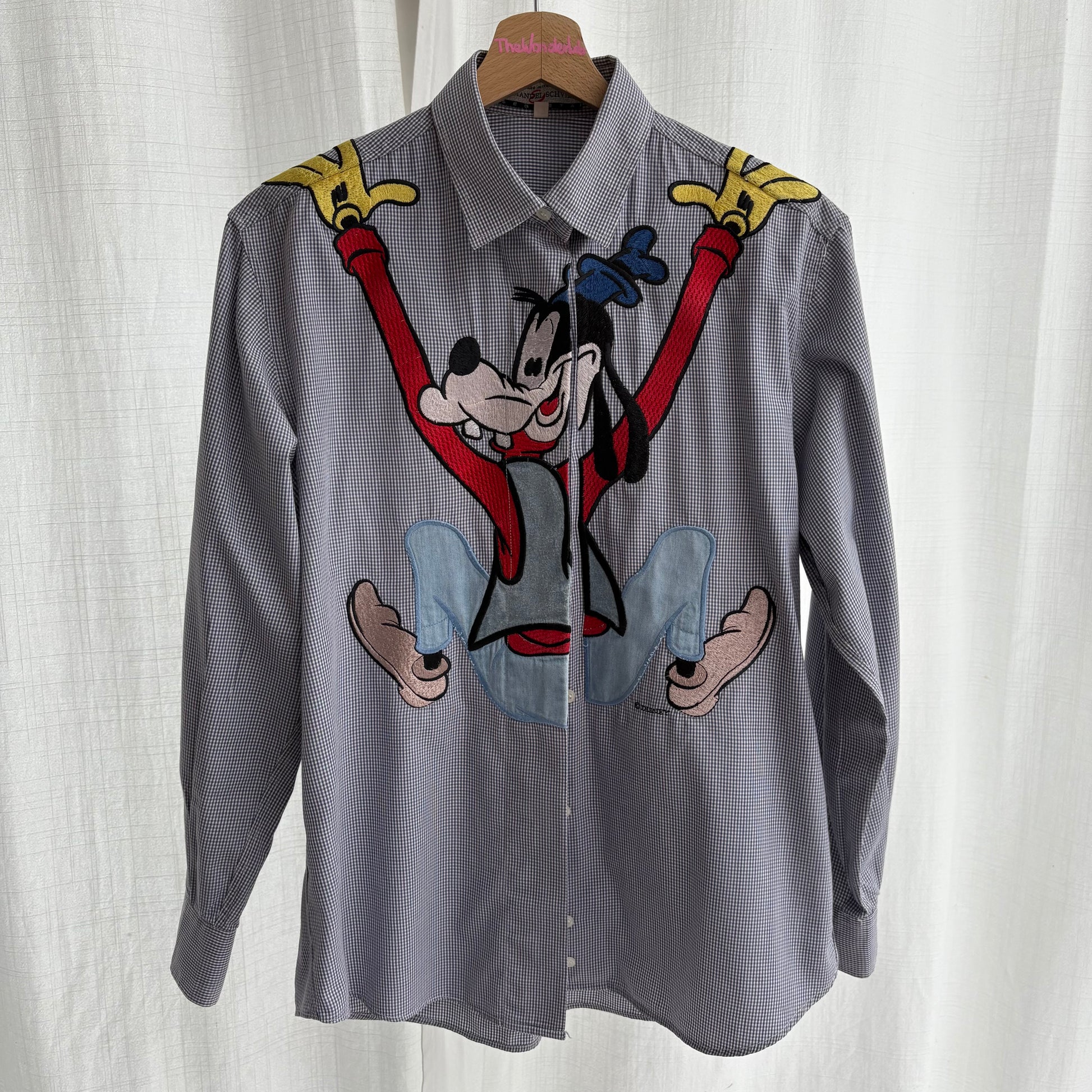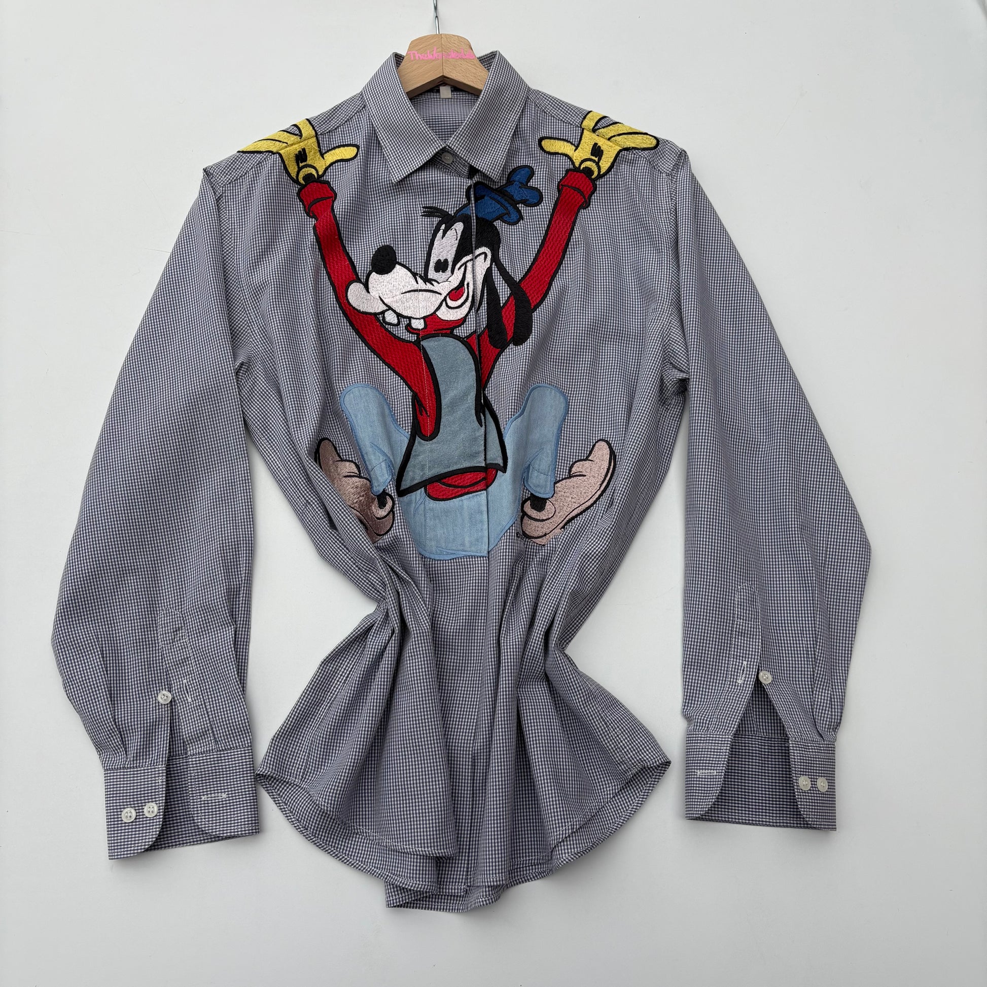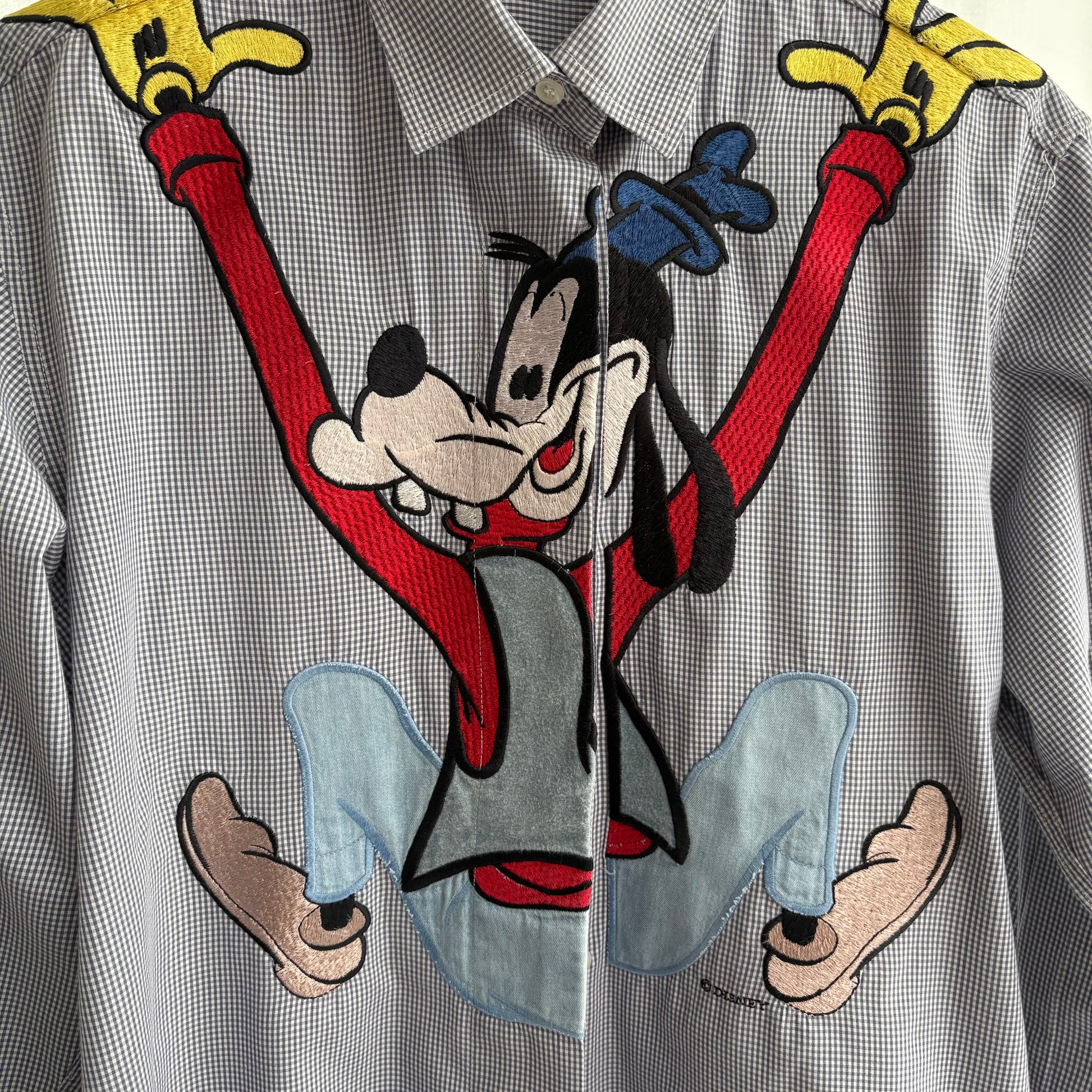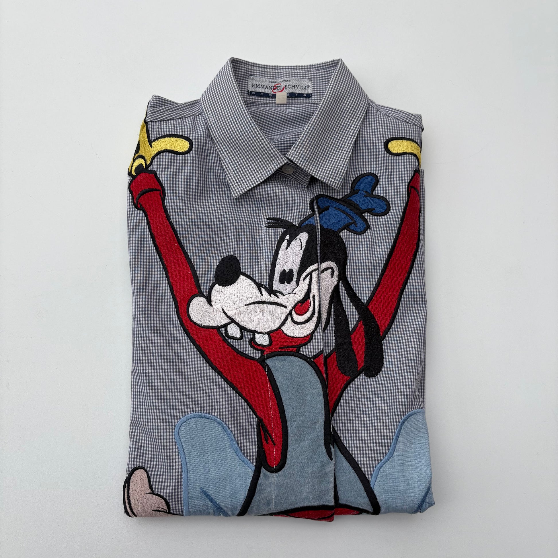Di Schvili, camicia in cotone a quadretti piccolissimi, bianco e blu-grigio. Grandissimo ricamo frontale dedicato a Pippo in versione equilibrista, si tiene aggrappato alle spalle come se fosse in arrampicata!