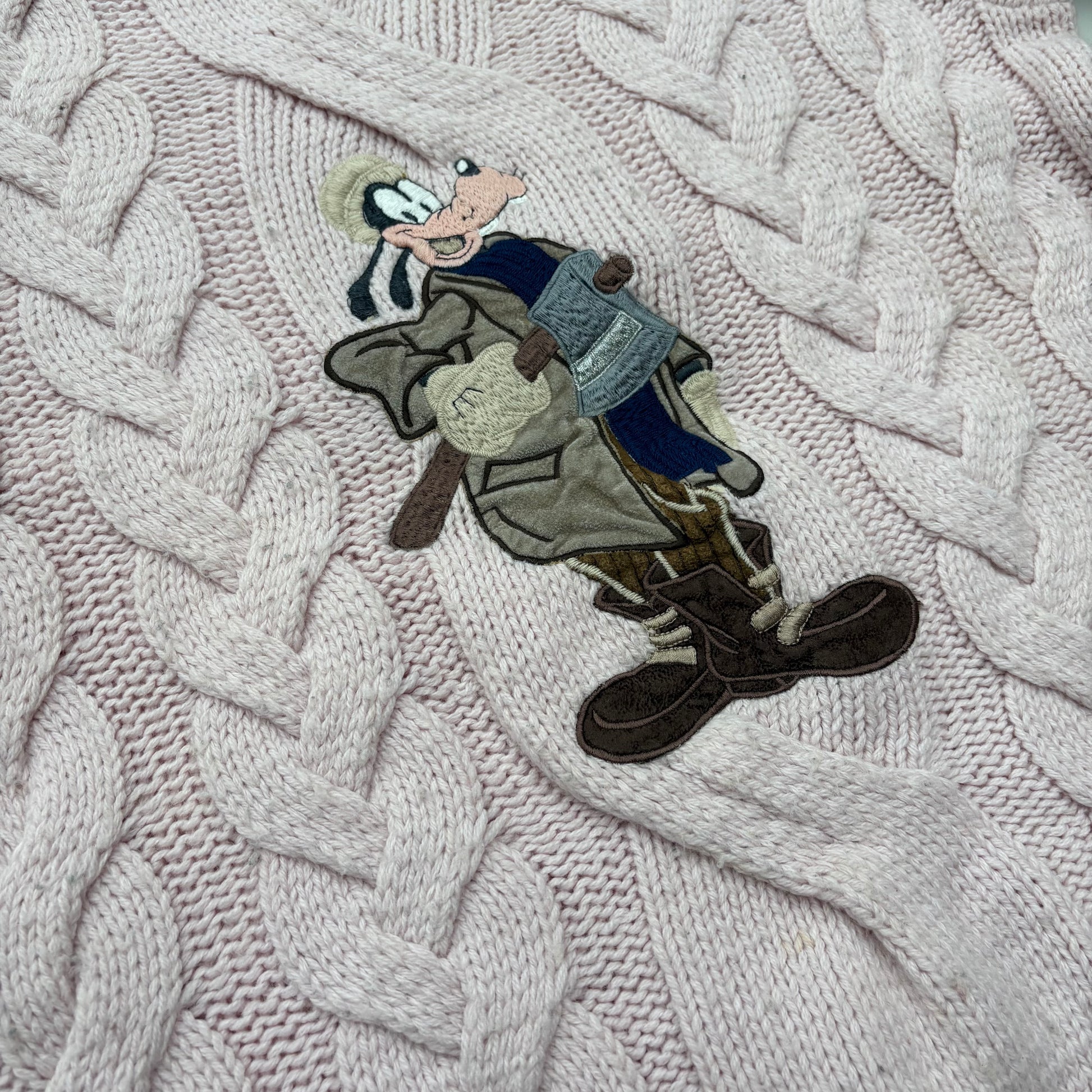 Di Georgya Studio, pullover anni 90 in misto lana rosa pallido con ricamo dedicato a Pippo e lavorazione a trecce. Spacchetti laterali.
