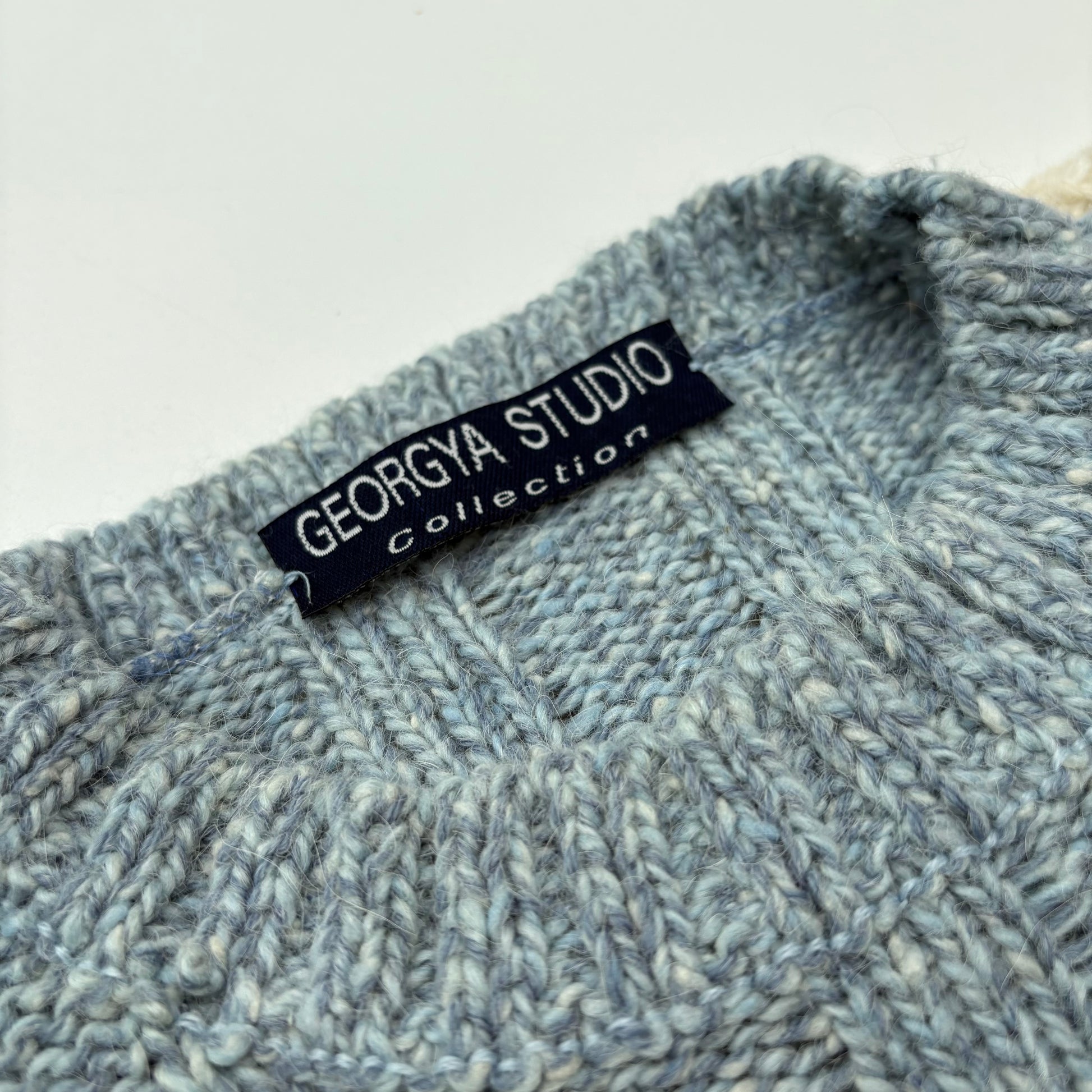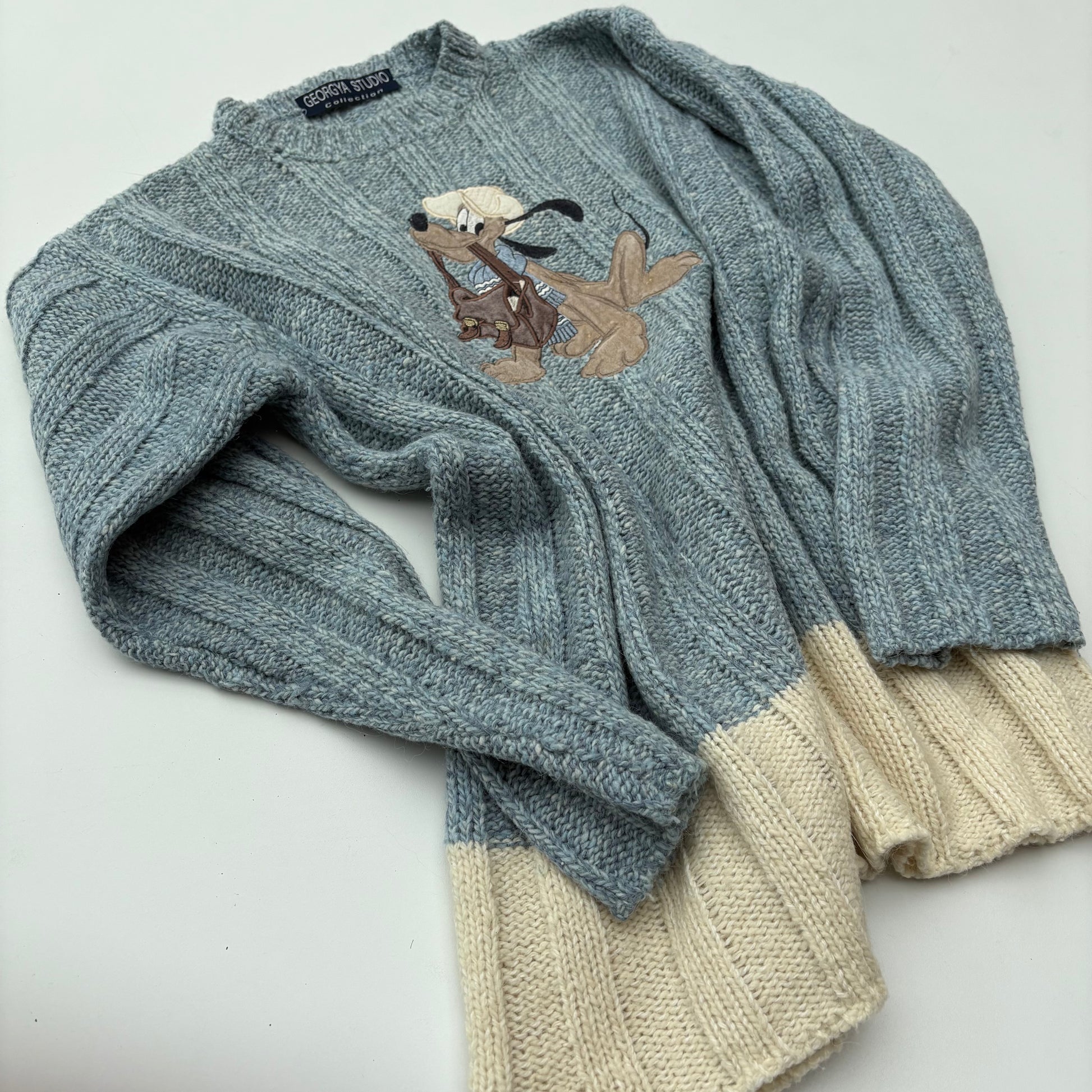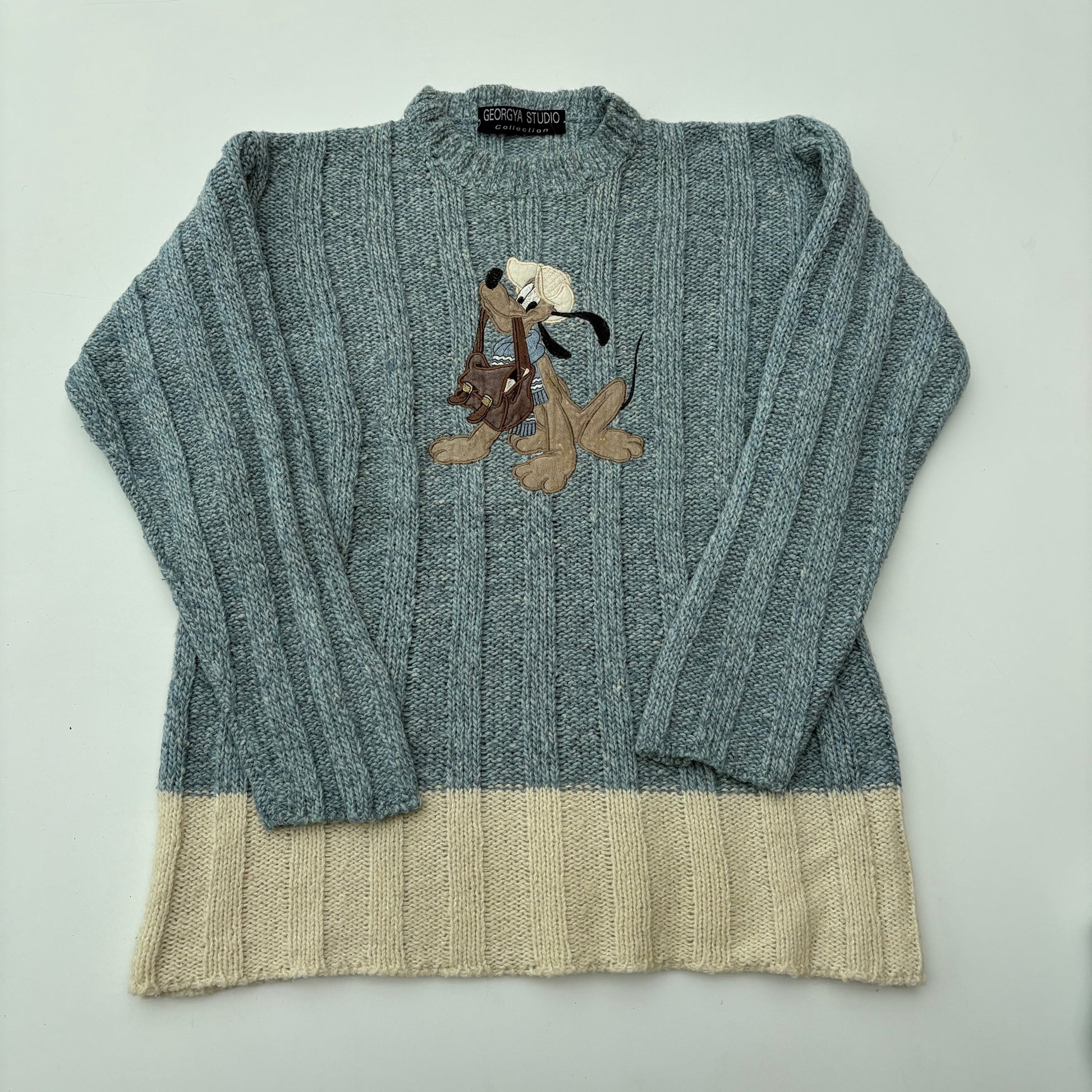 Pullover vintage anni 90 bicolor (azzurro polvere e corda) effetto mélange di Georgya Studio con ricamo centrale dedicato a Pluto.