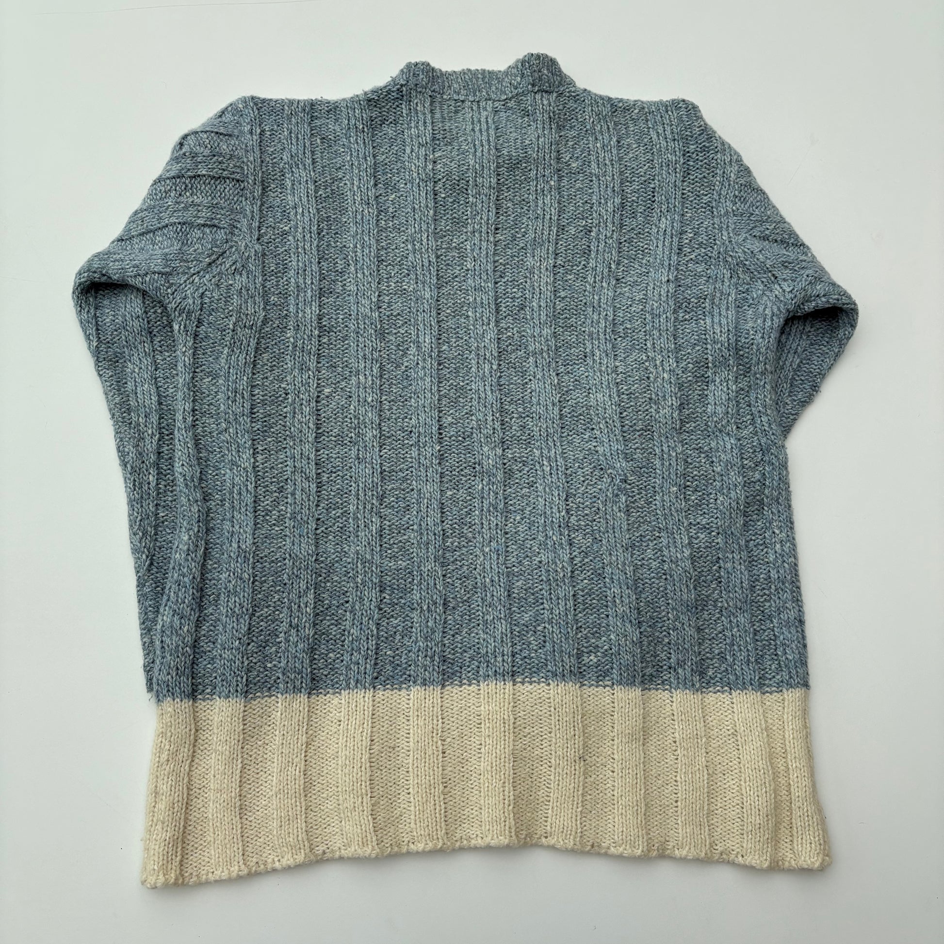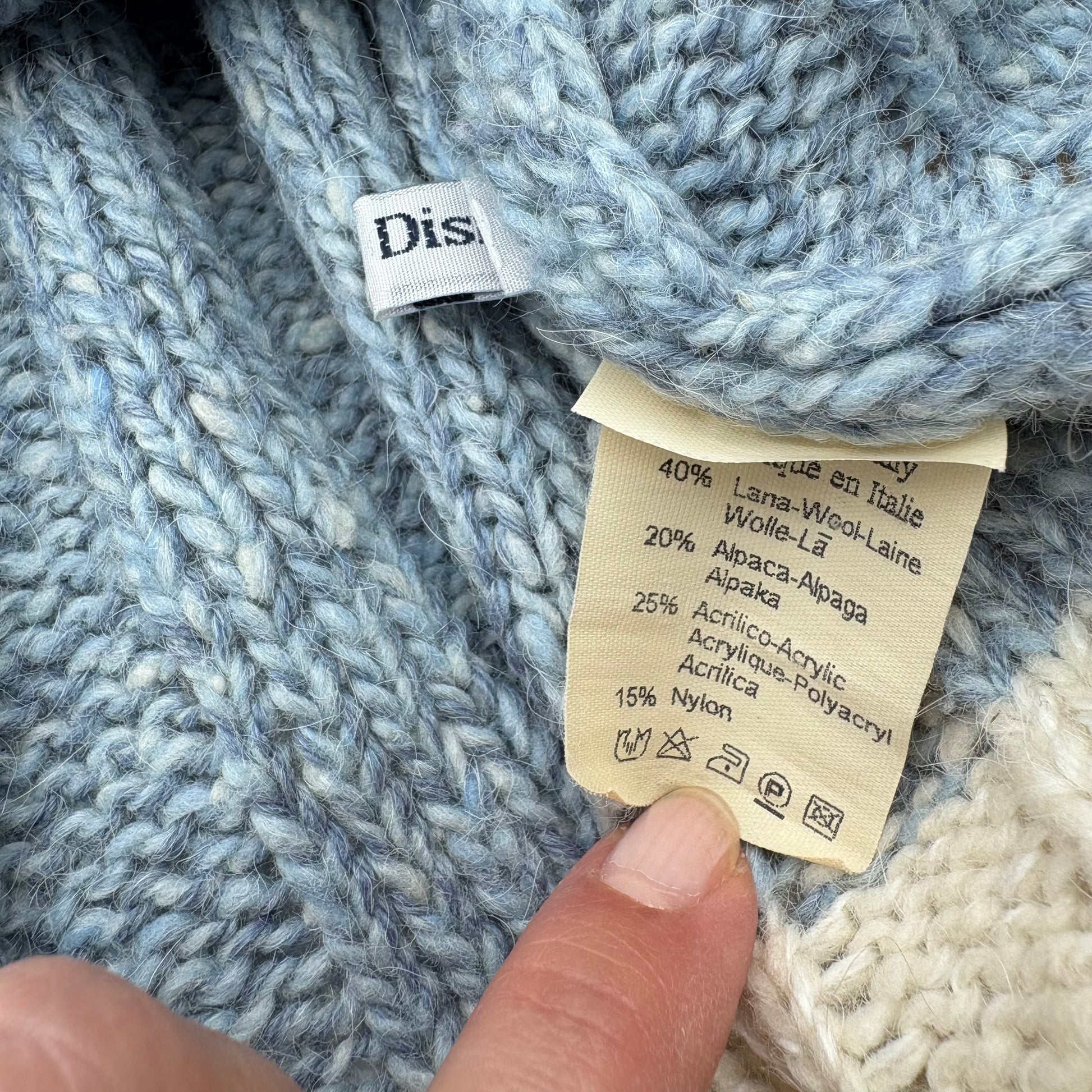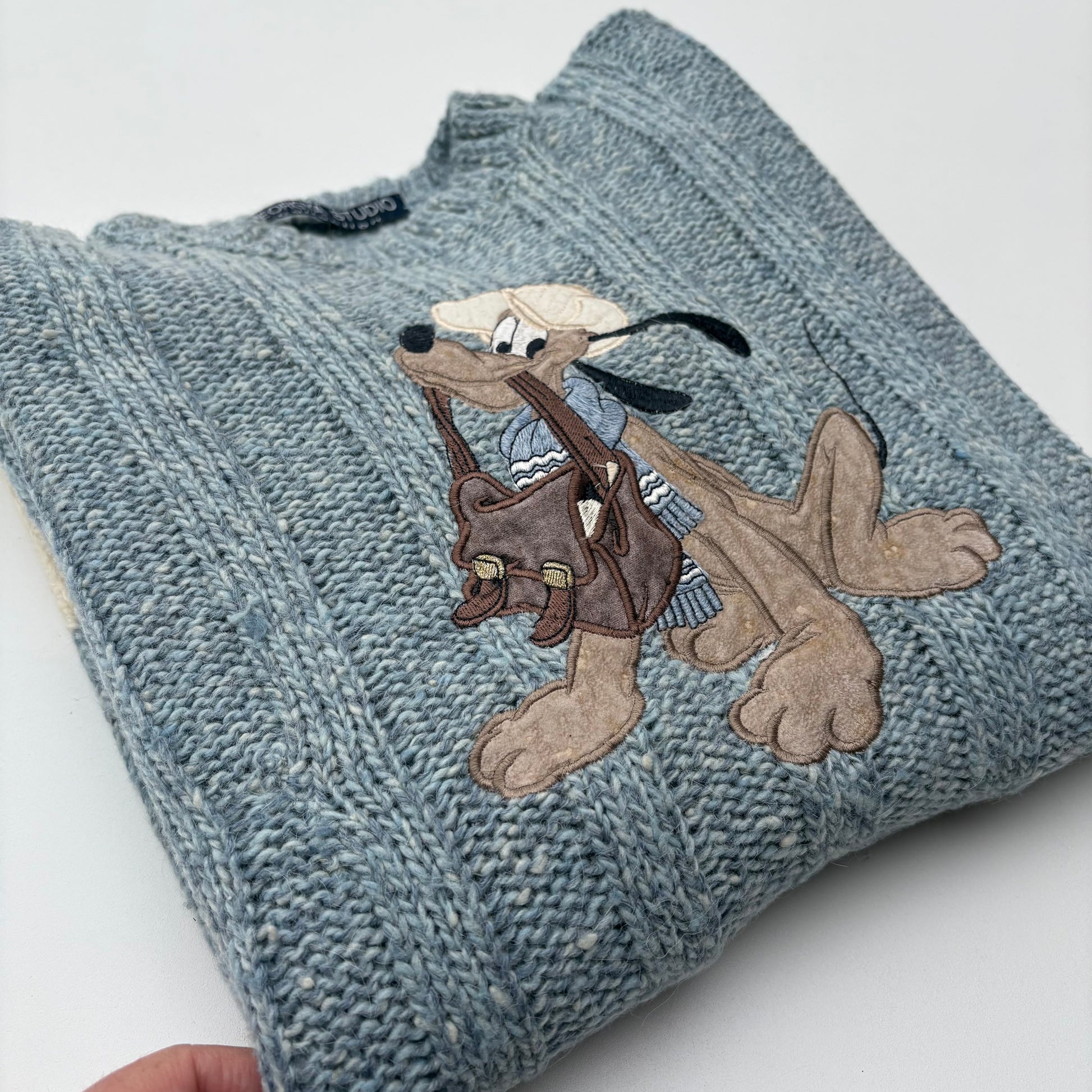 Pullover vintage anni 90 bicolor (azzurro polvere e corda) effetto mélange di Georgya Studio con ricamo centrale dedicato a Pluto.