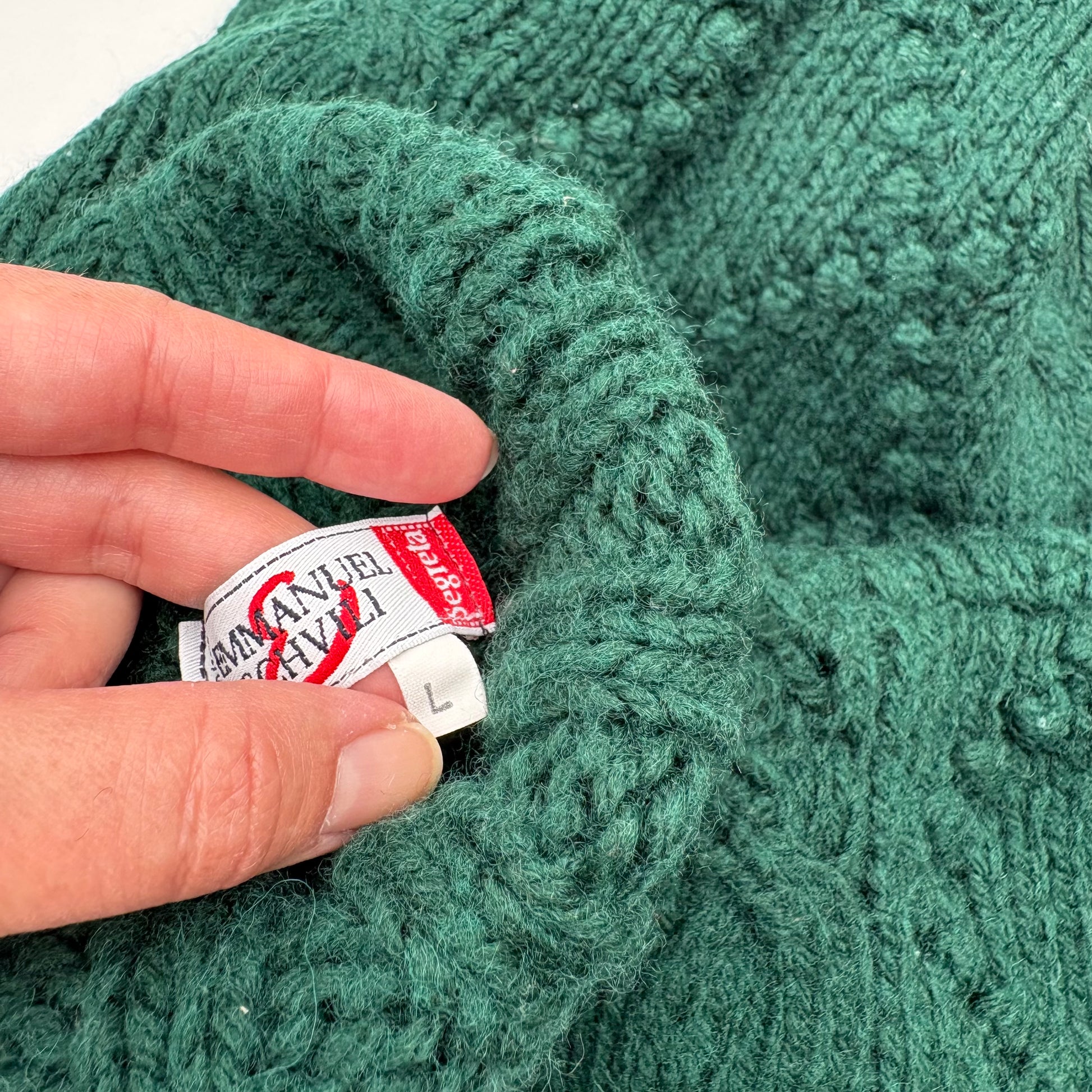 Taglio over e squadrato, la maglia è lavorata grossa, a trecce con “noccioline”.