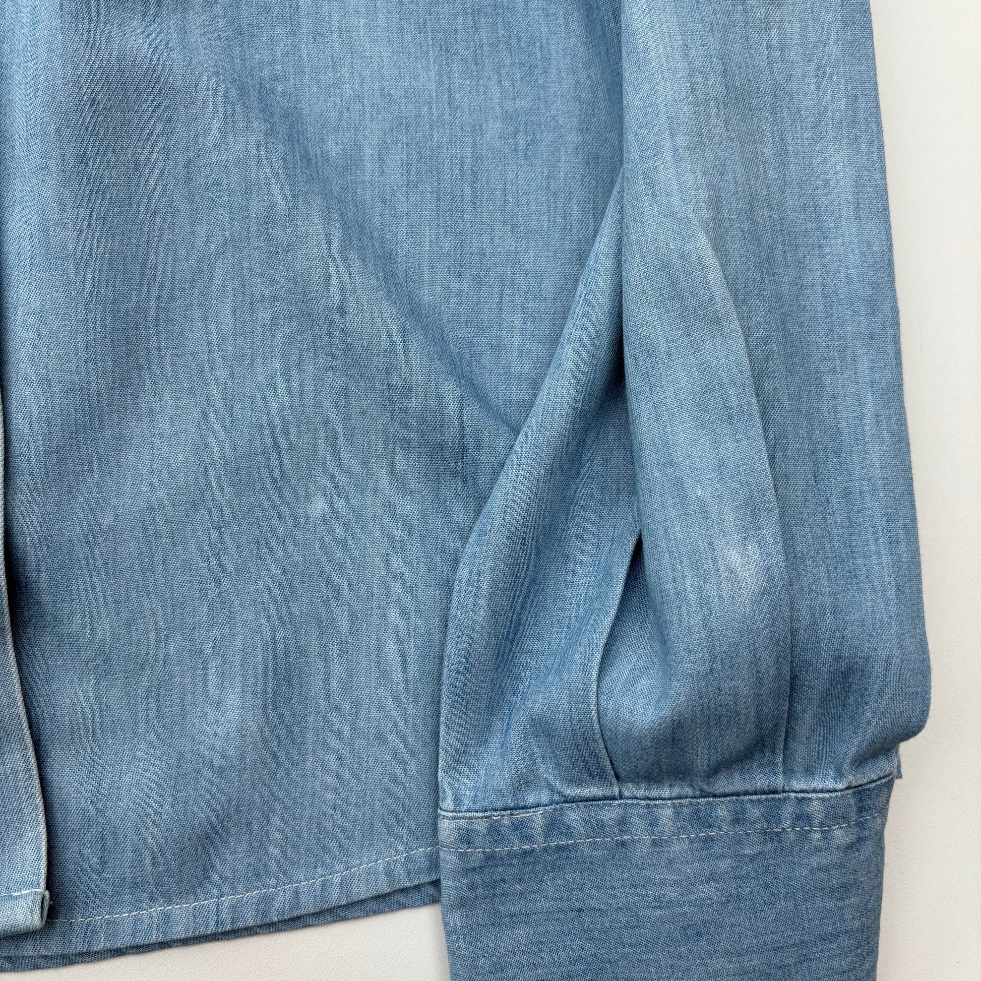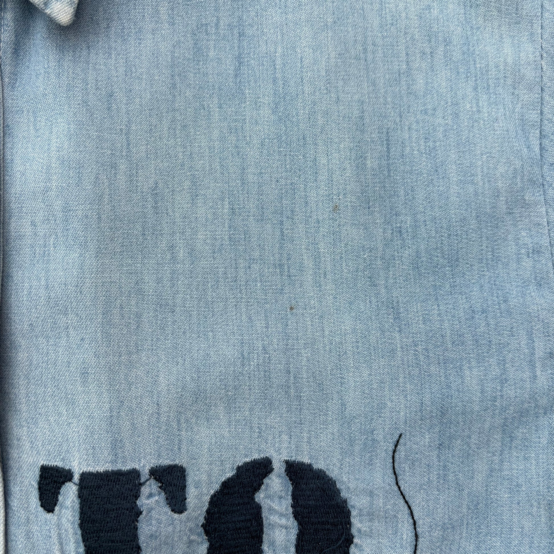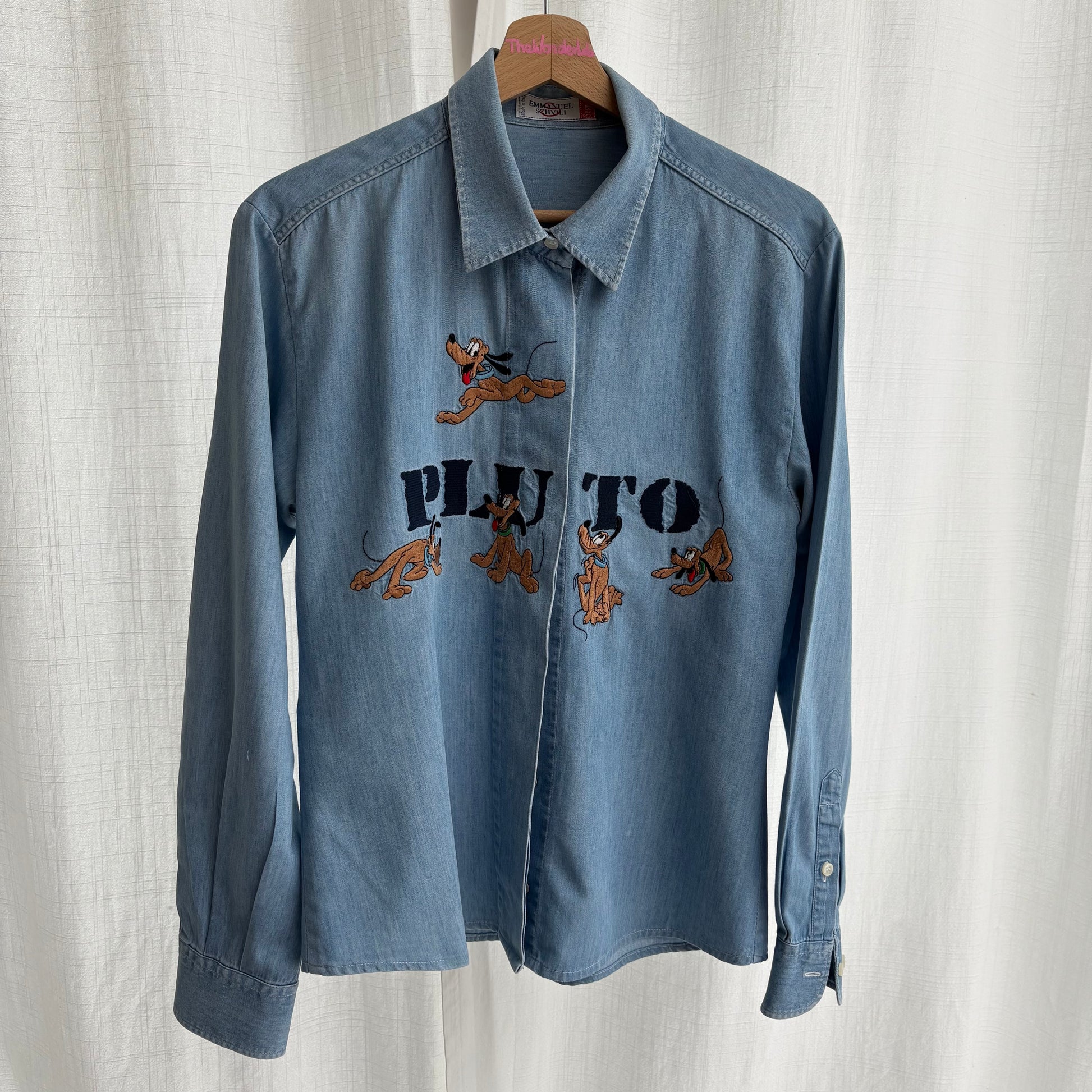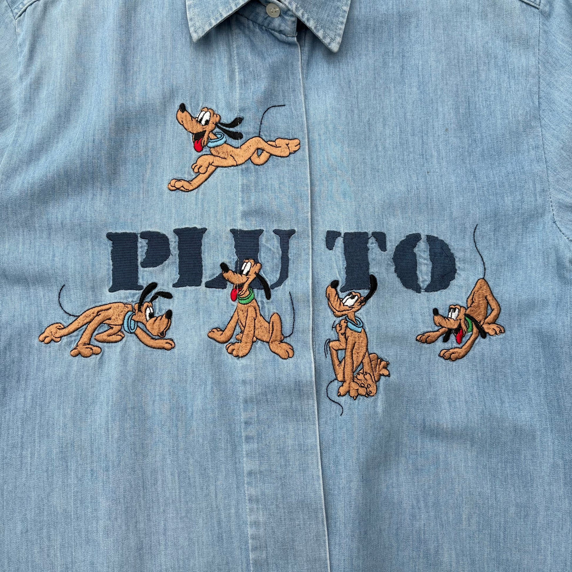 Di Schvili, camicia vintage anni 90 in Denim leggero, lavaggio chiaro, con ricamo sul davanti dedicato a Pluto!