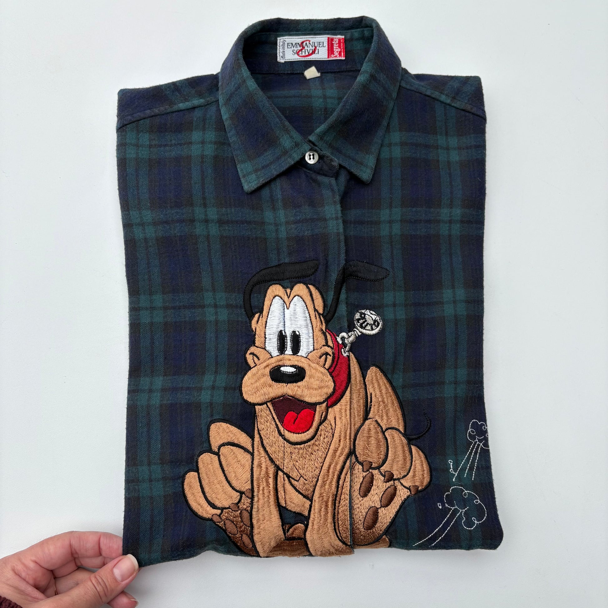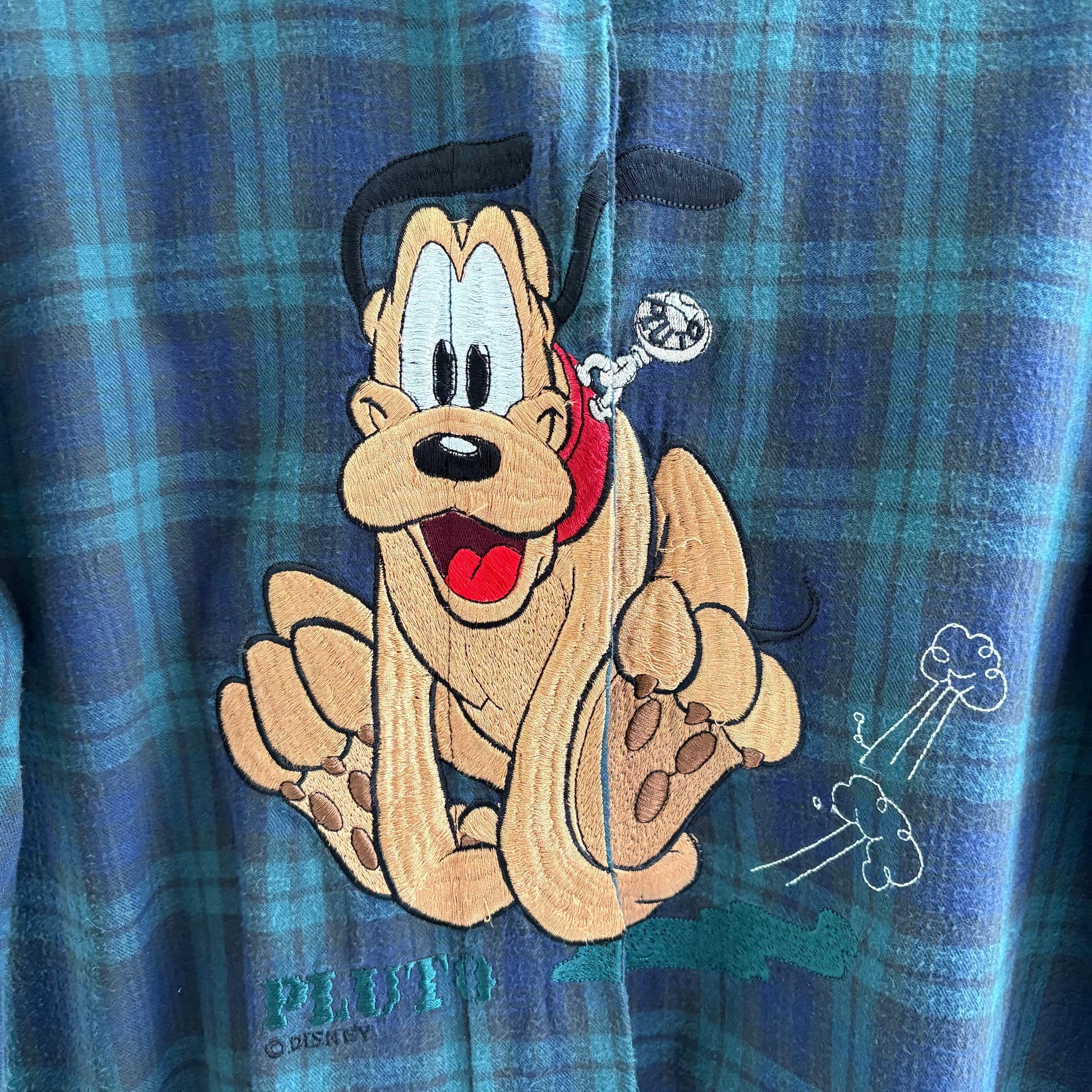 Di Schvili, vintage anni 90, camicia in flanella super soffice con fantasia scozzese e ricamo dedicato a Pluto.