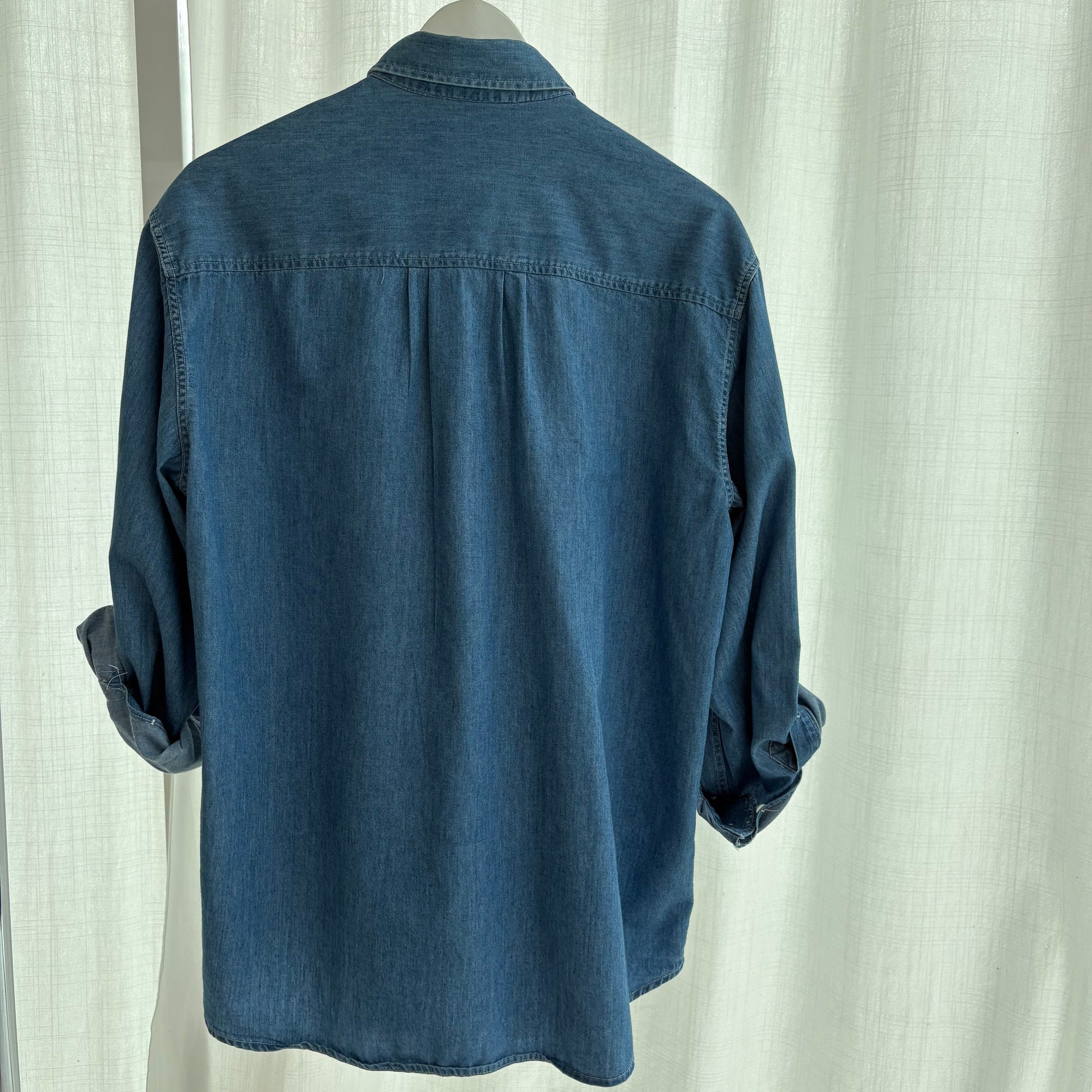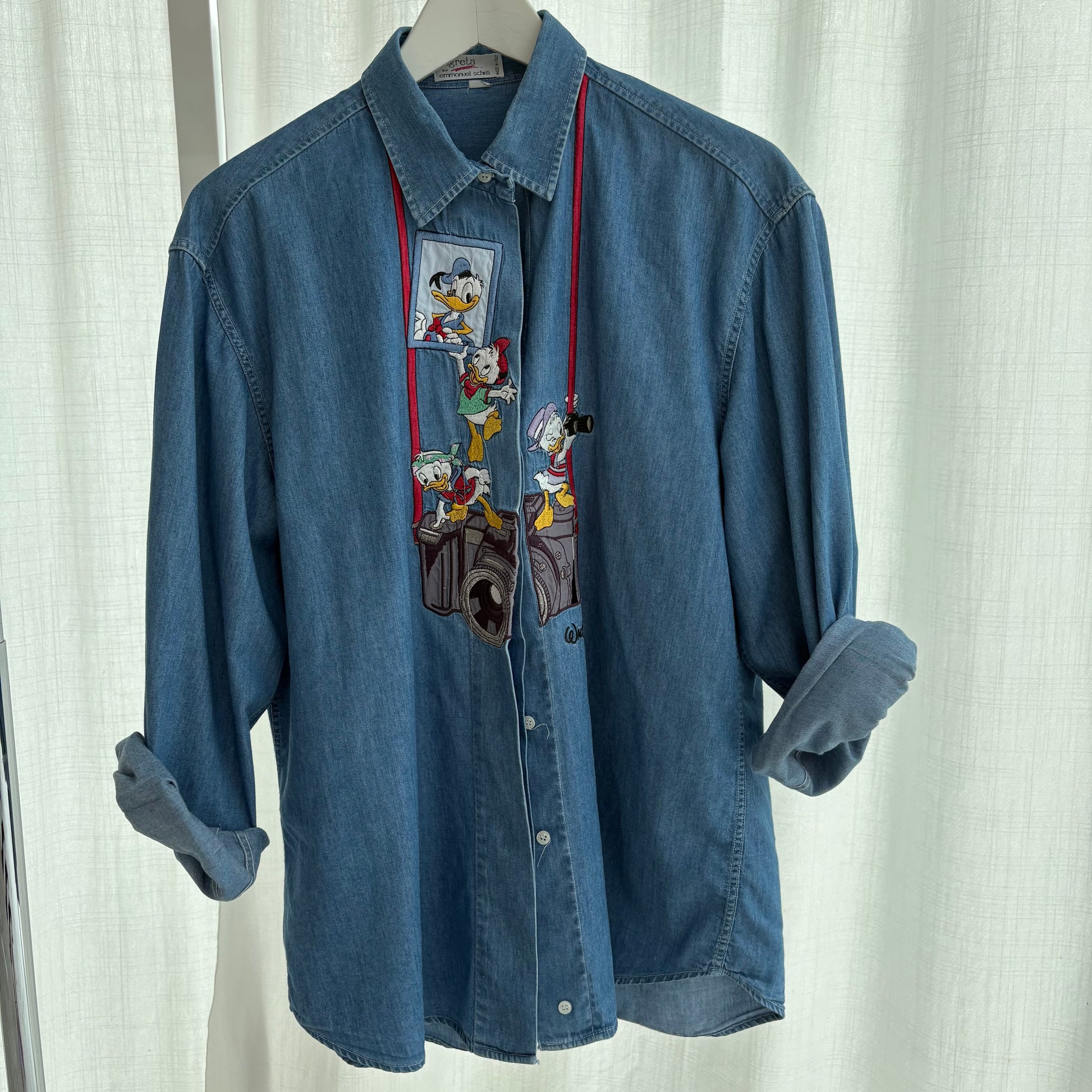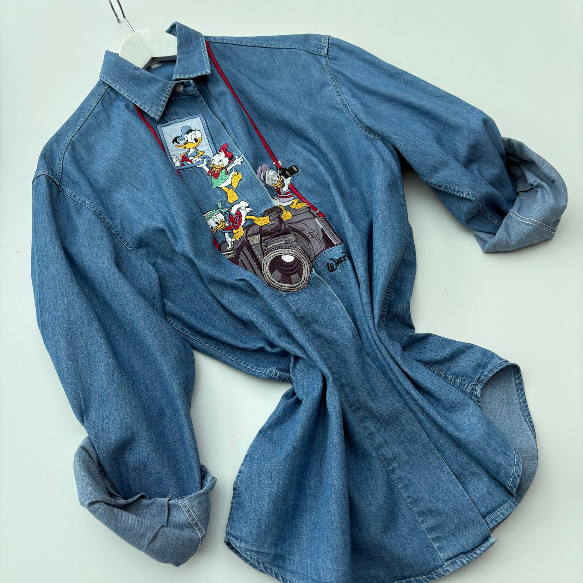 Camicia Schvili in denim lavaggio medio- chiaro con ricamo dedicato a Qui Quo Qua che scattano una fotografia a zio Paperino.