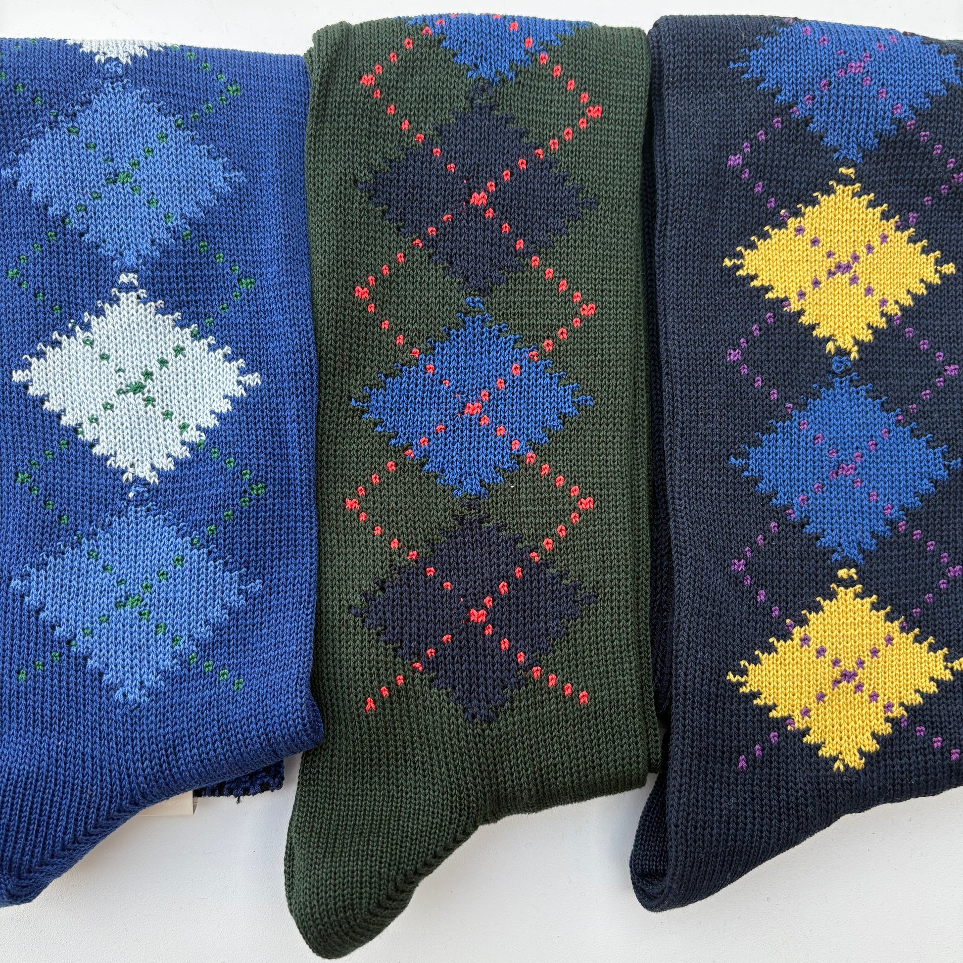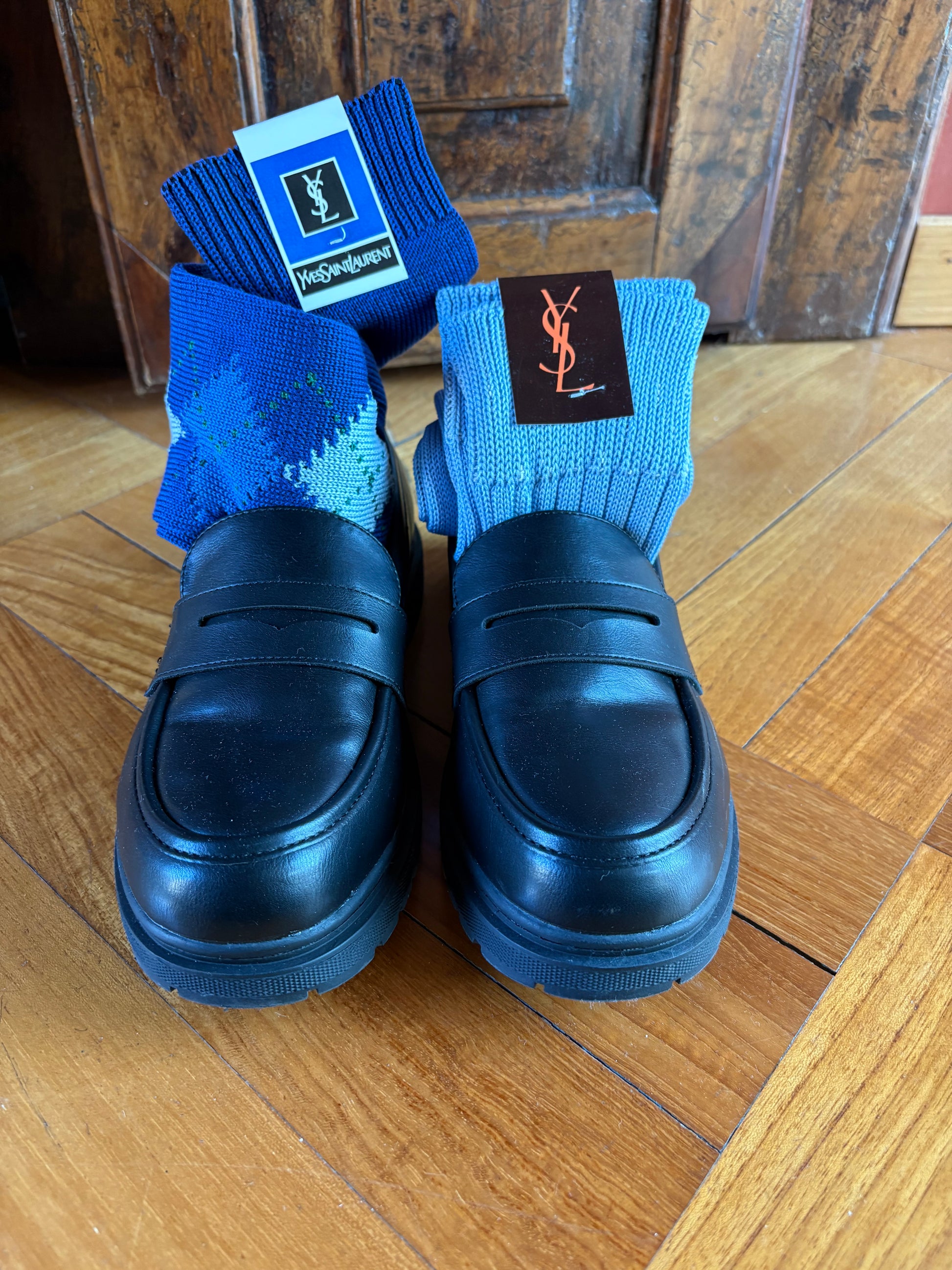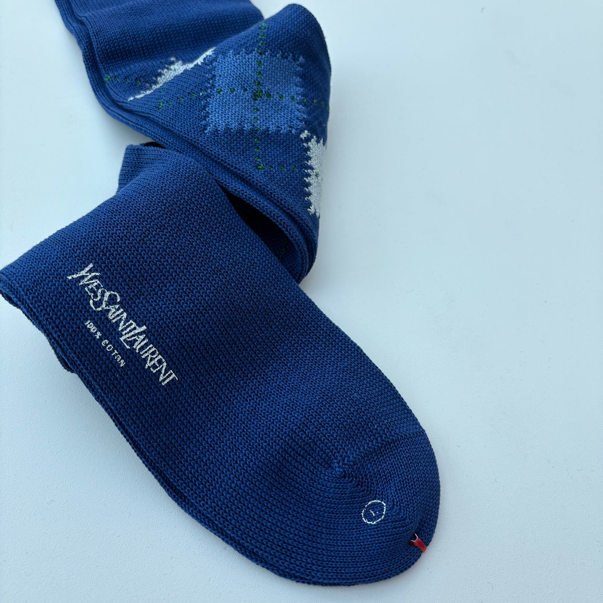 Calzettoni in 100% cotone con fantasia argyle diYSL, nelle tonalità del blu e dell’azzurro.
