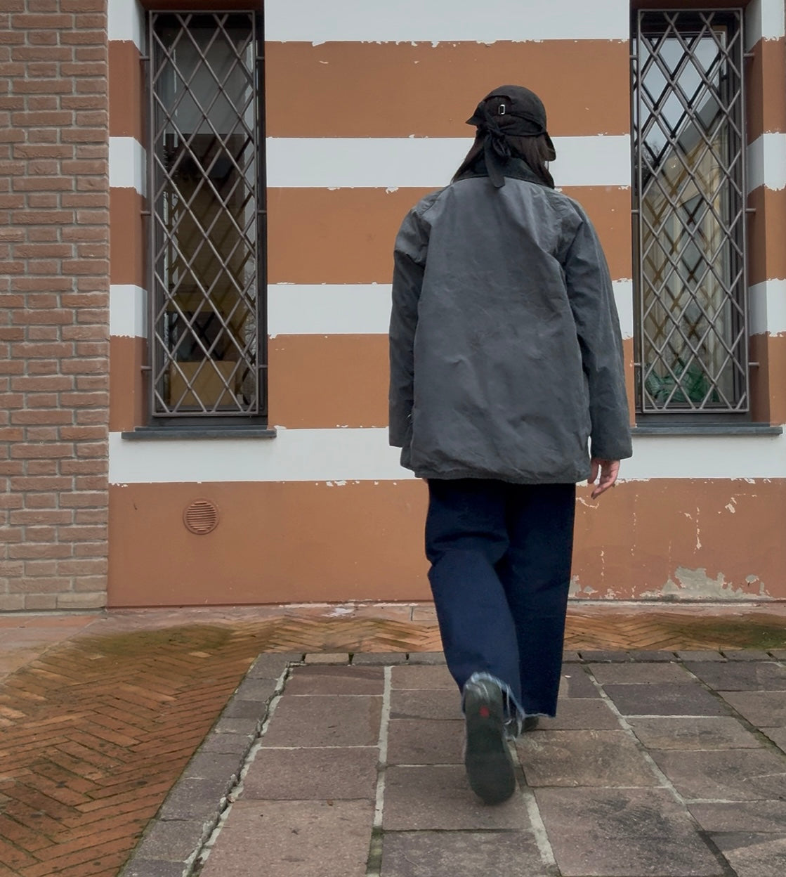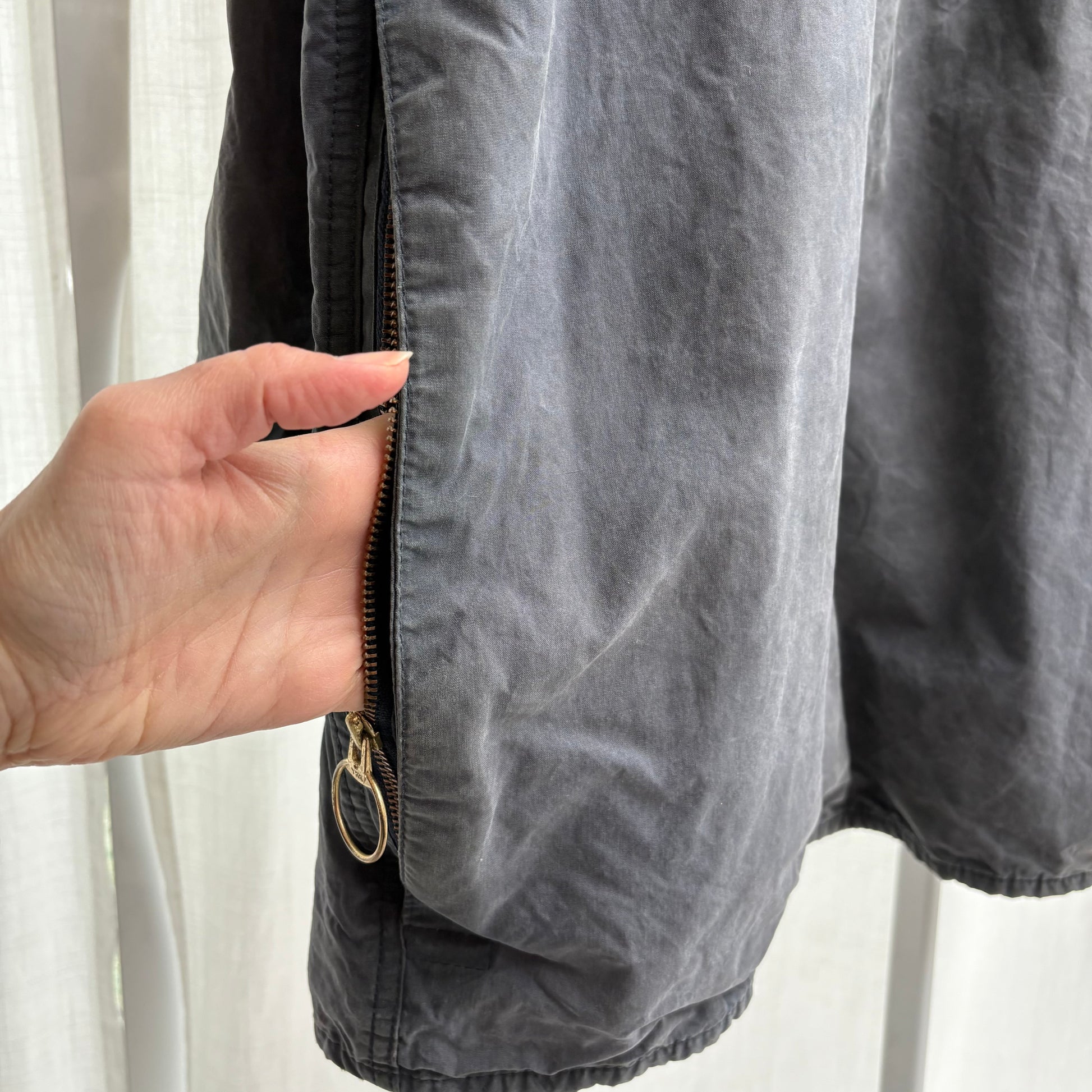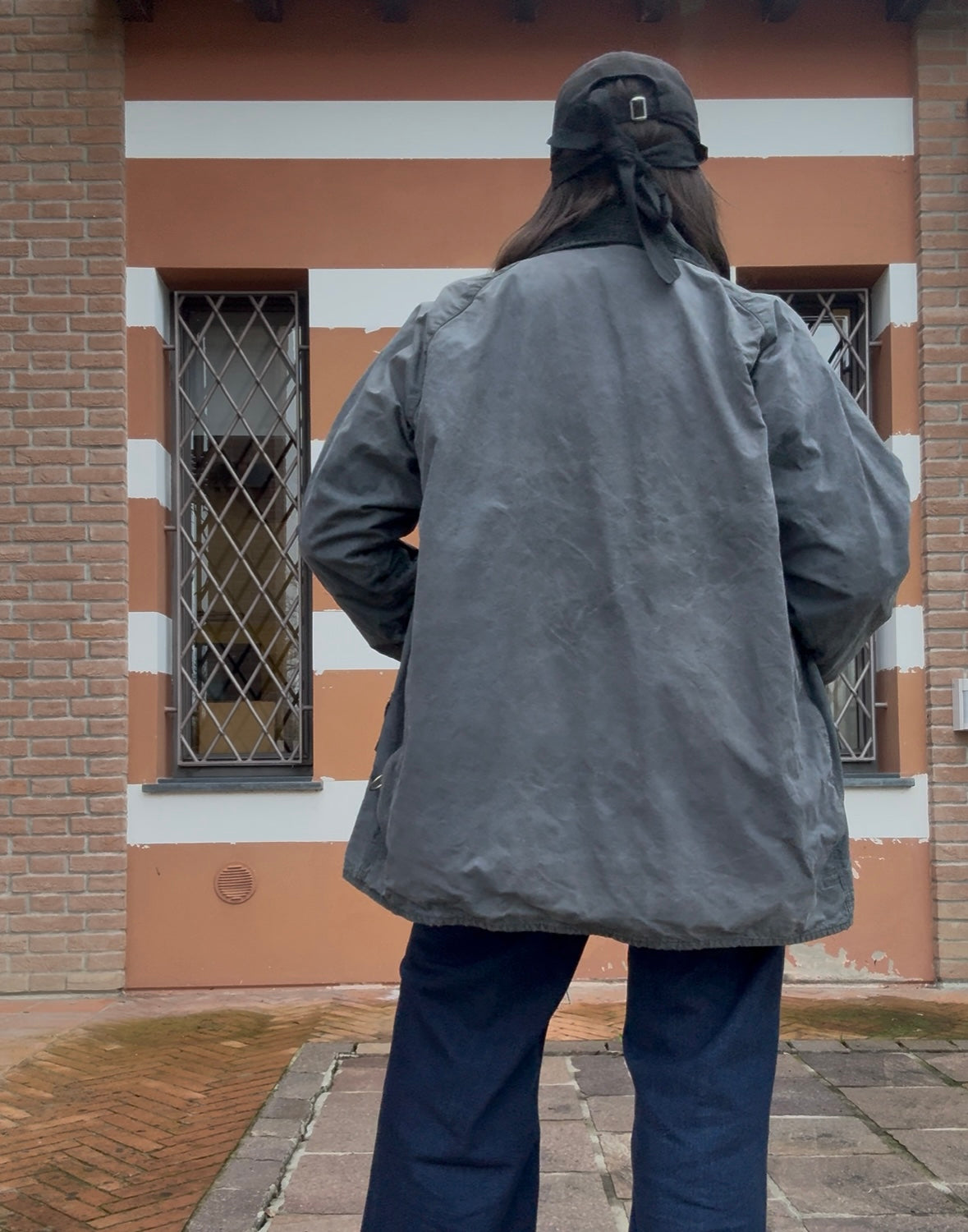 Giacca cerata con lunghezza a metà coscia.