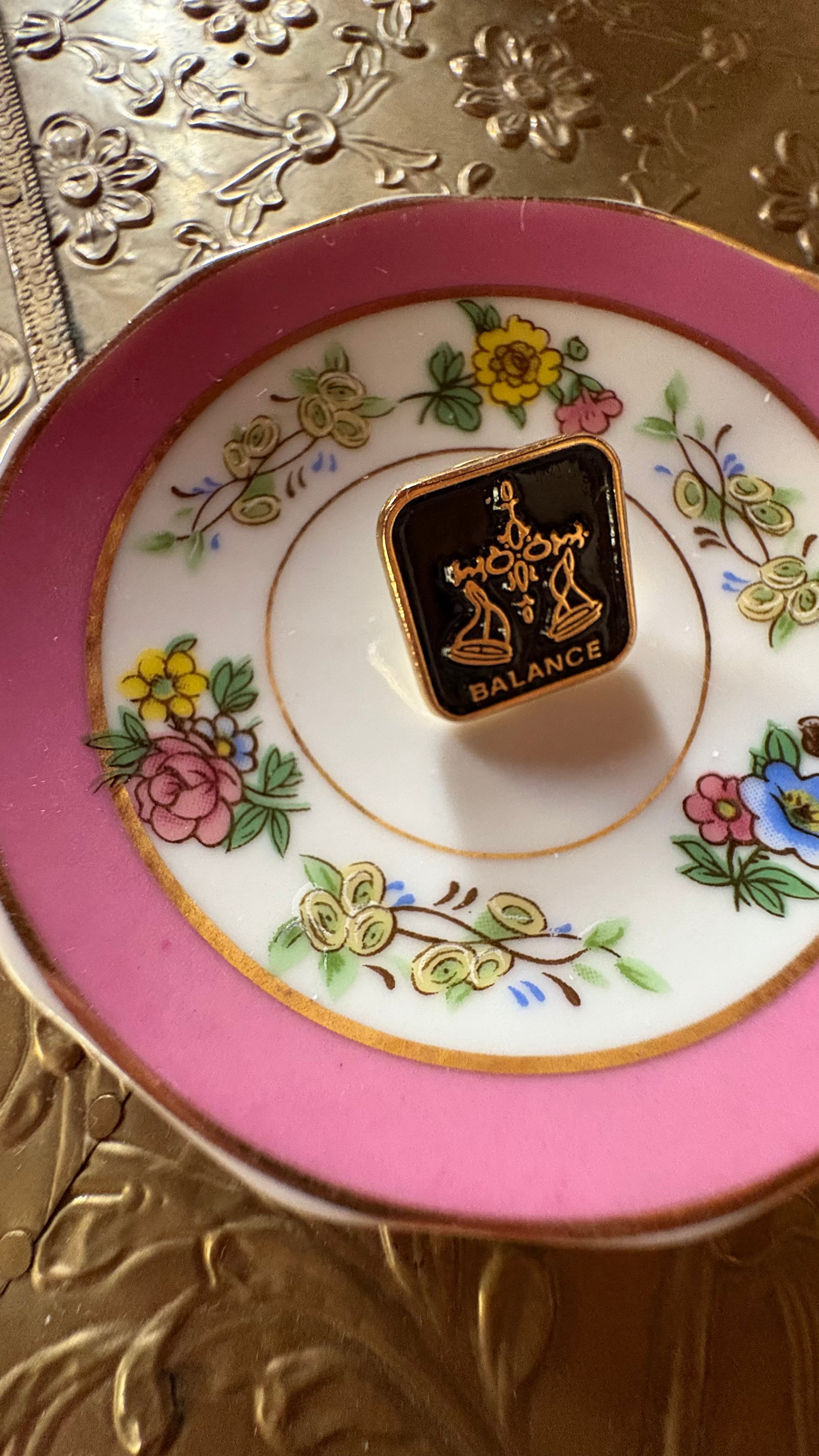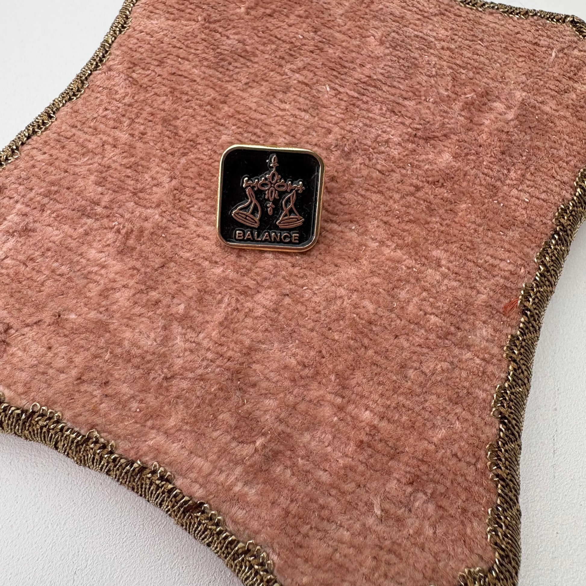 Spillette /pins in metallo goltone con segni zodiacali su piastra quadrata e smaltata di nero.