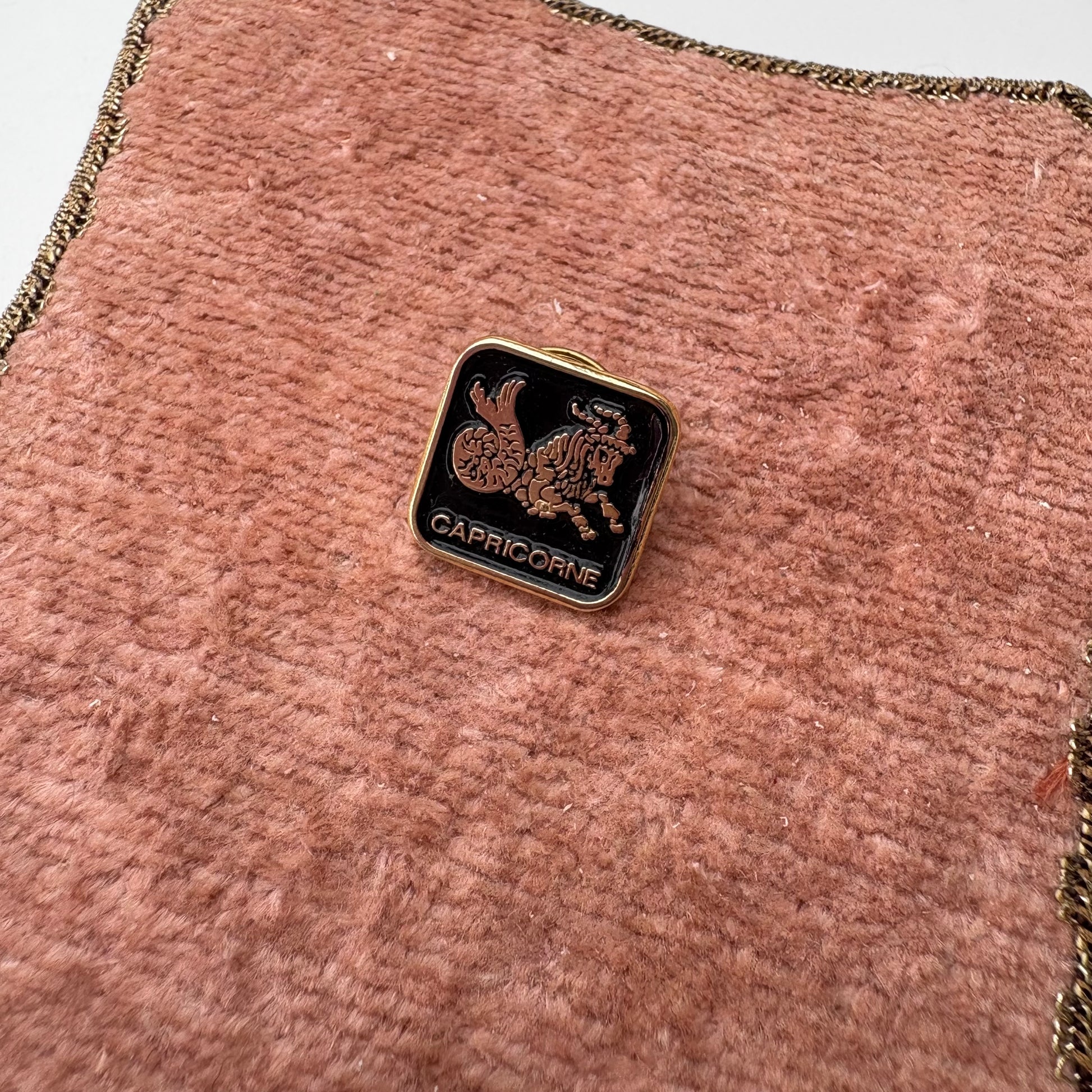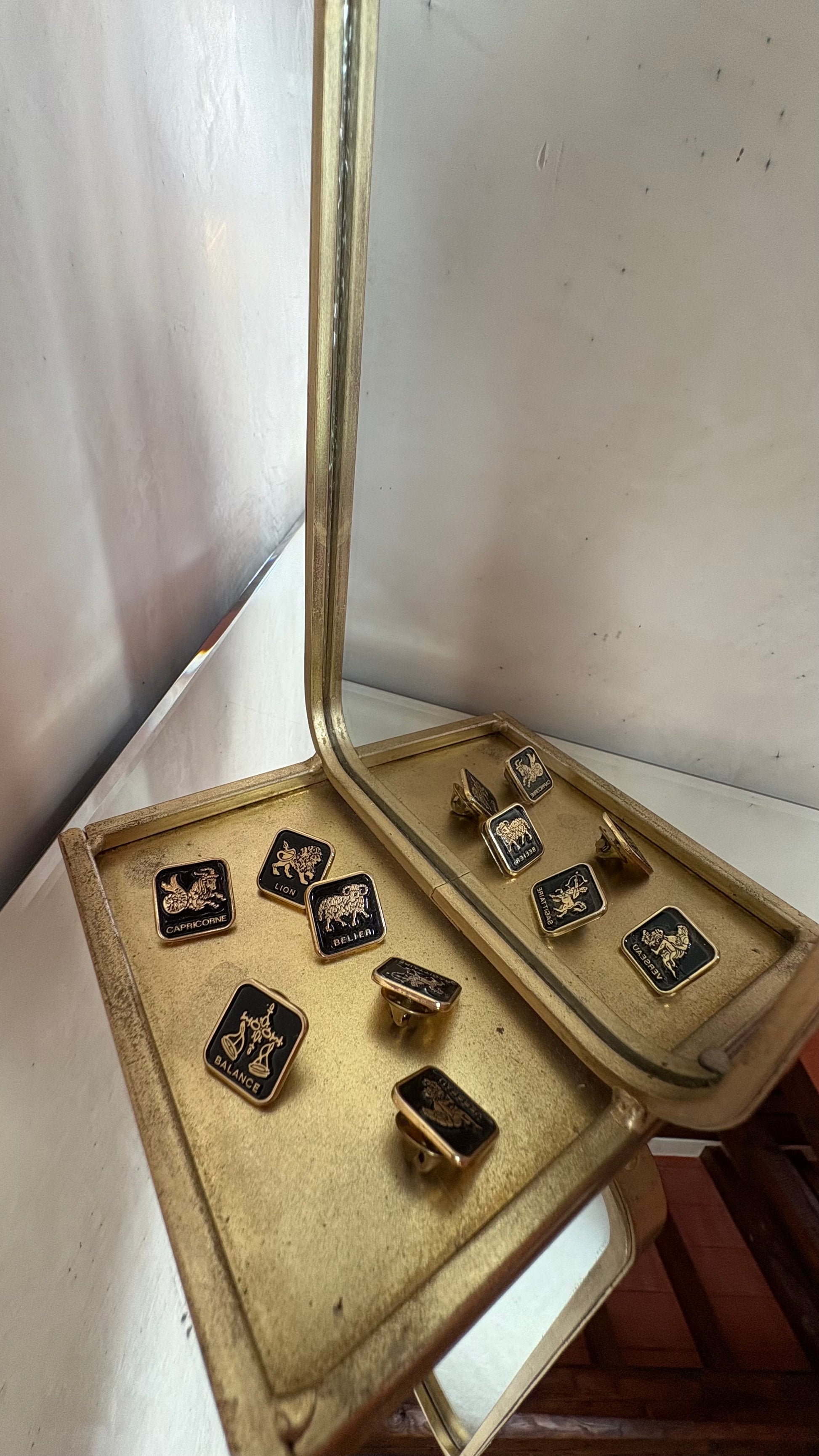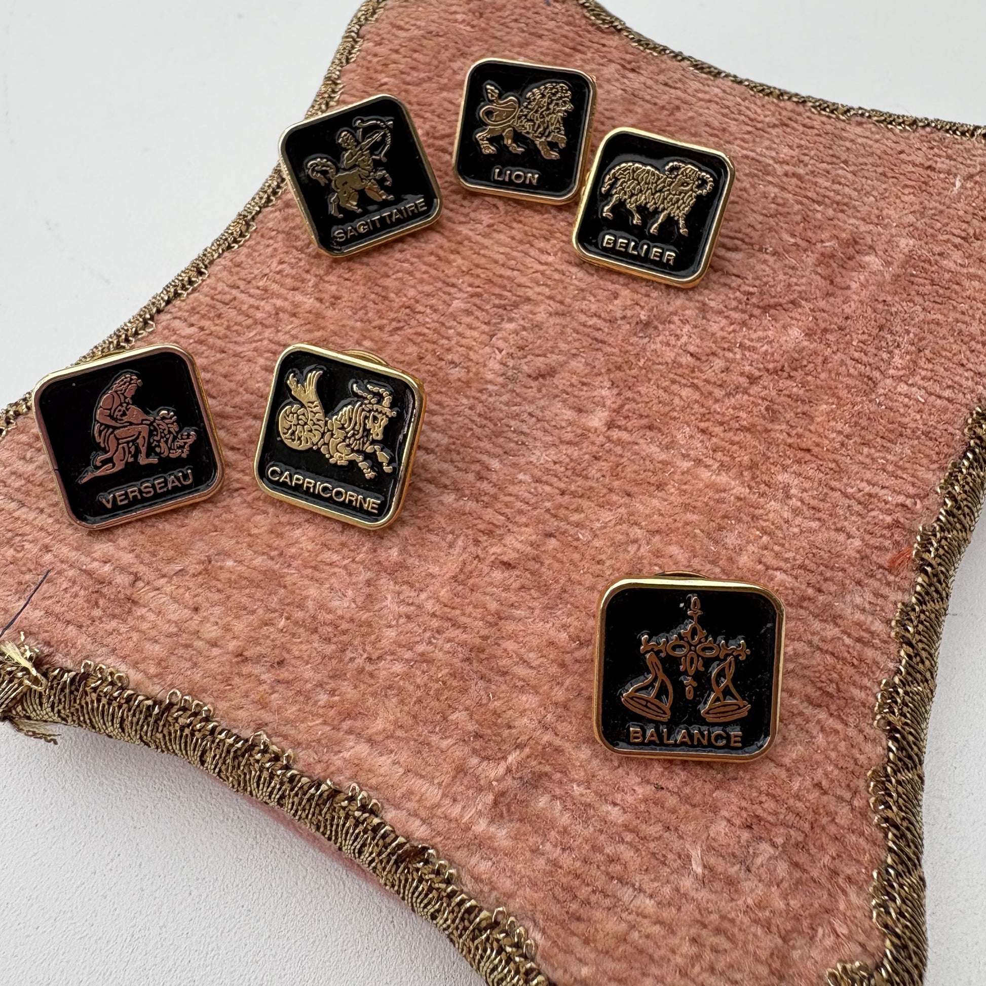 Spillette /pins in metallo goltone con segni zodiacali su piastra quadrata e smaltata di nero.