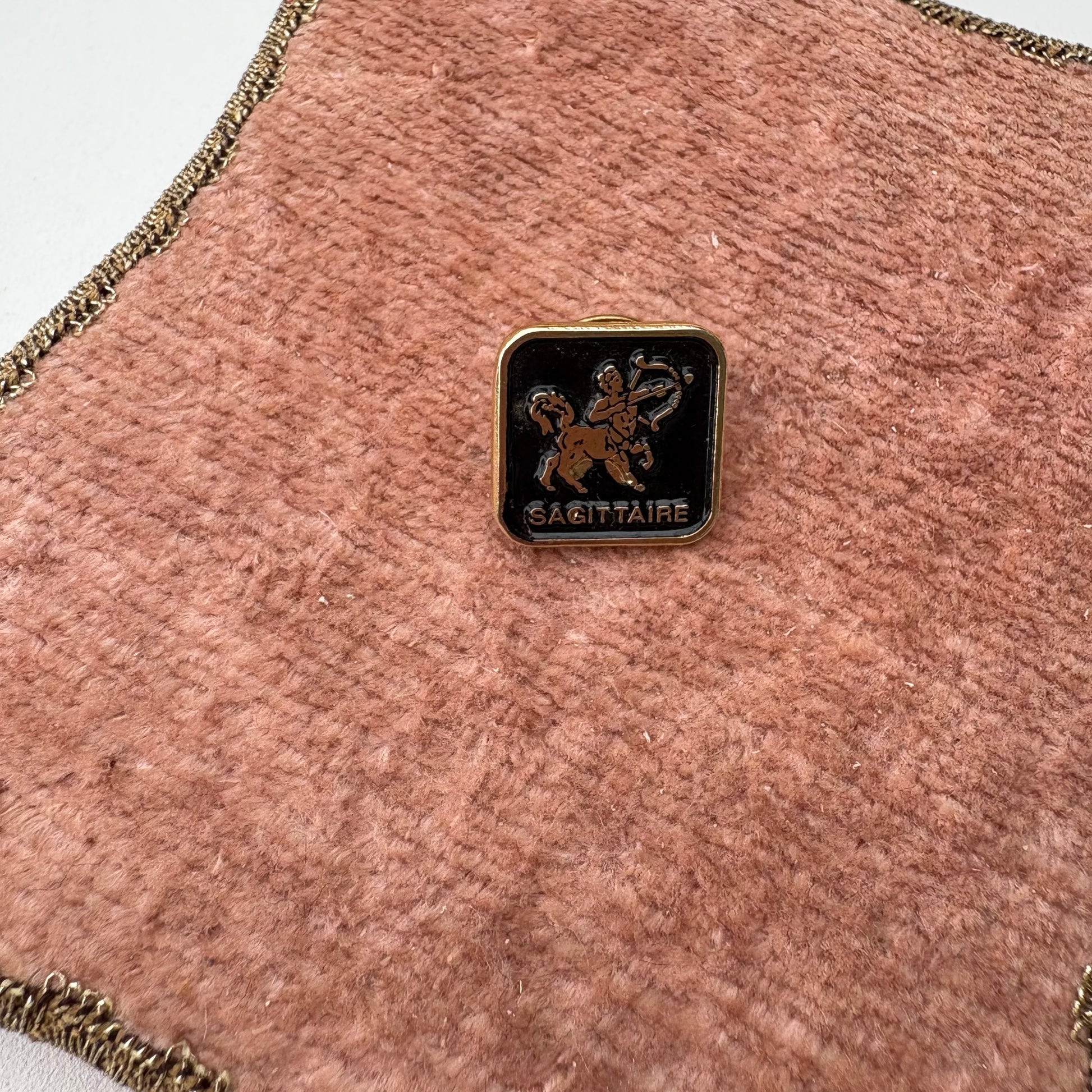 Spillette /pins in metallo goltone con segni zodiacali su piastra quadrata e smaltata di nero.