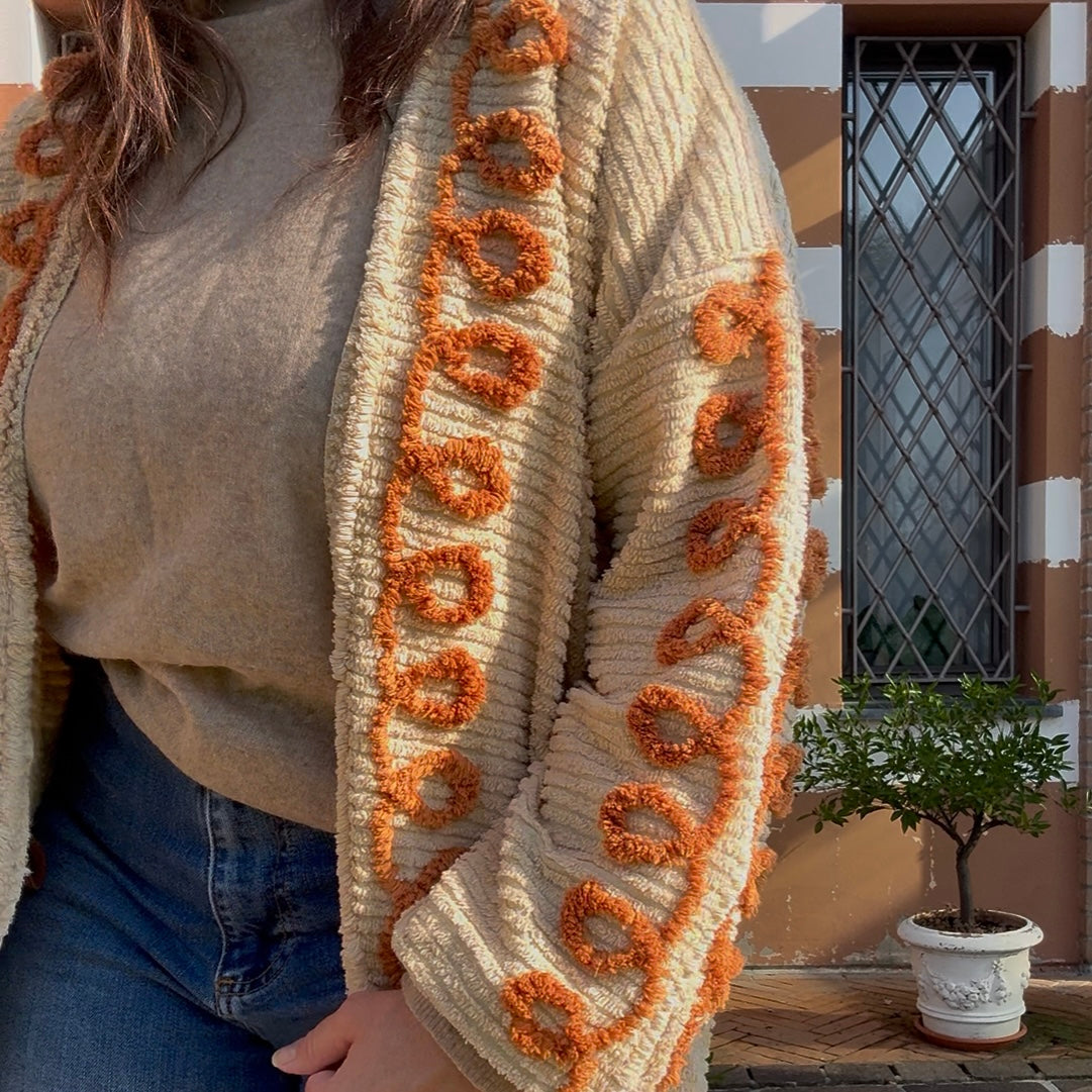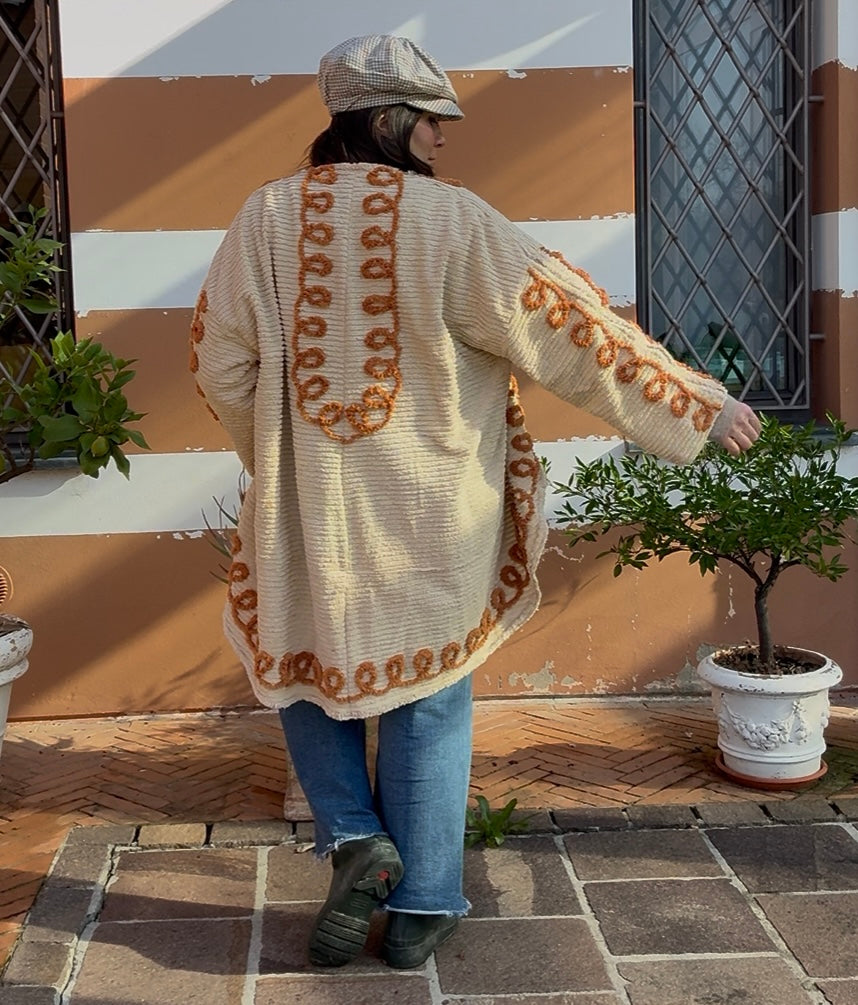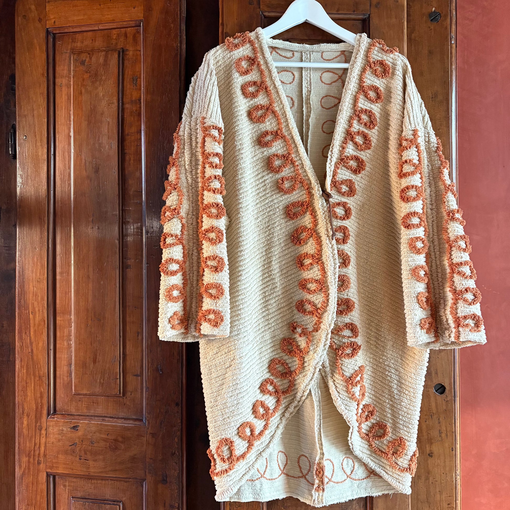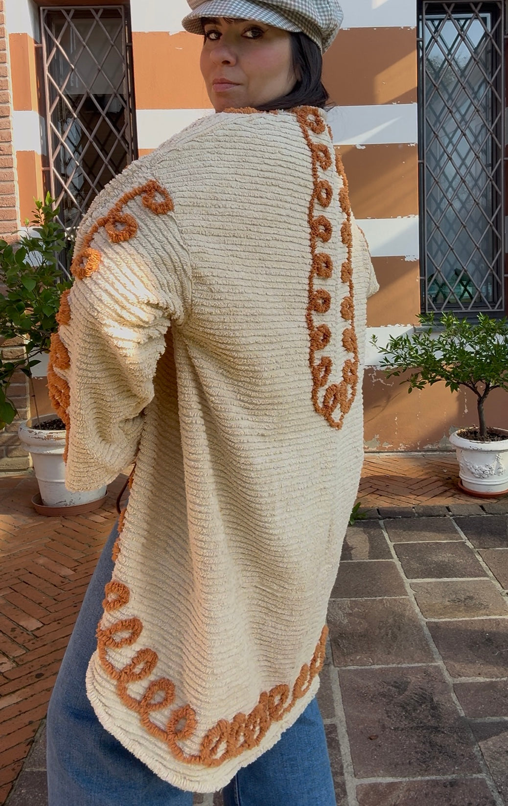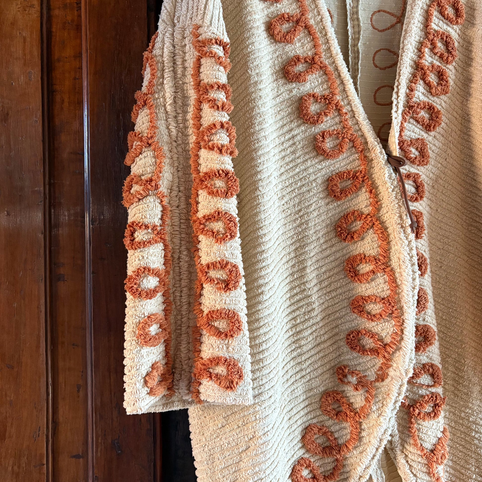 Giacca spolverino in ciniglia di cotone, modello a vestaglia - stondata che si chiude con laccetto sul davanti.