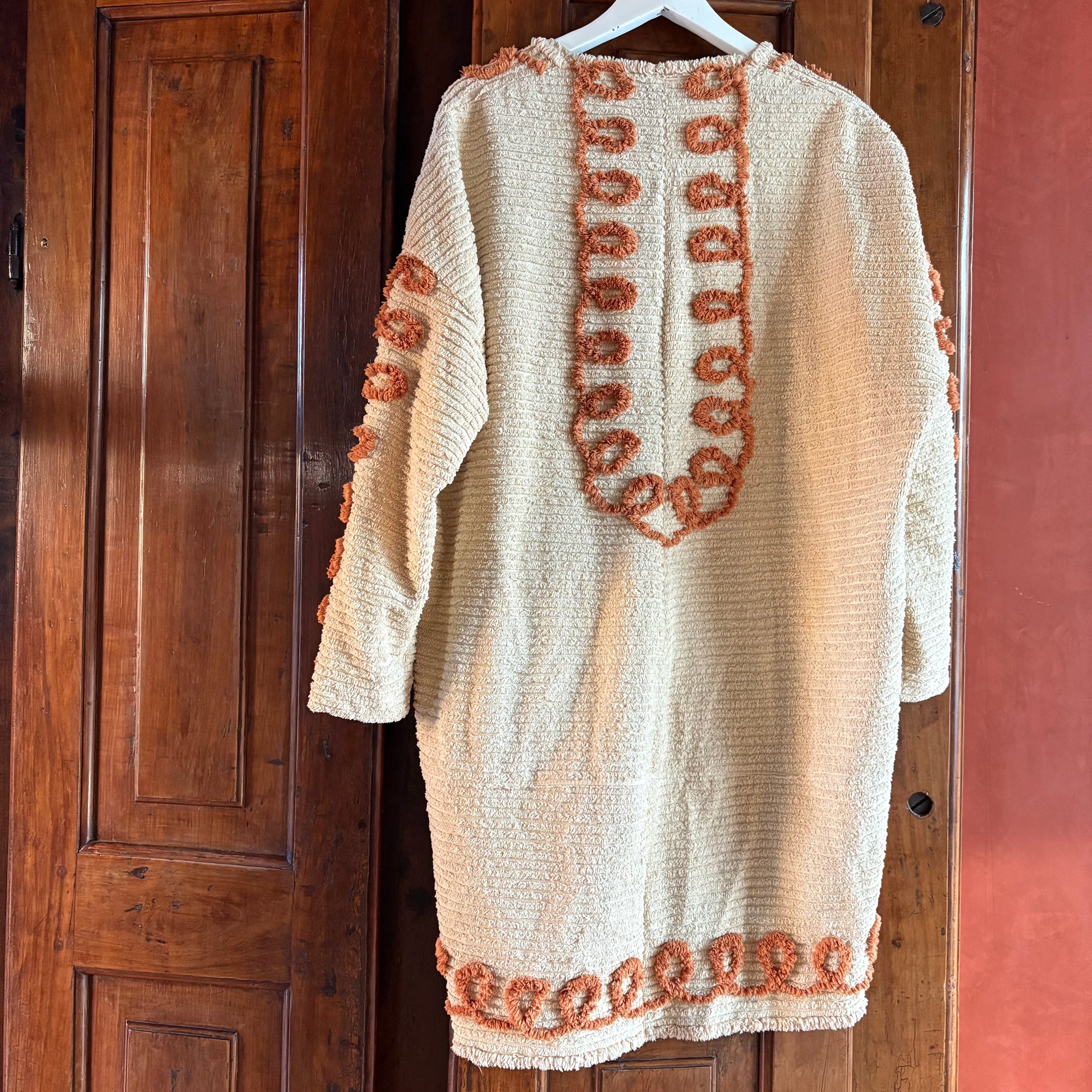 Modello lungo con bordo attorno al collo e lungo le maniche, sulla schiena ampio disegno geometrico.