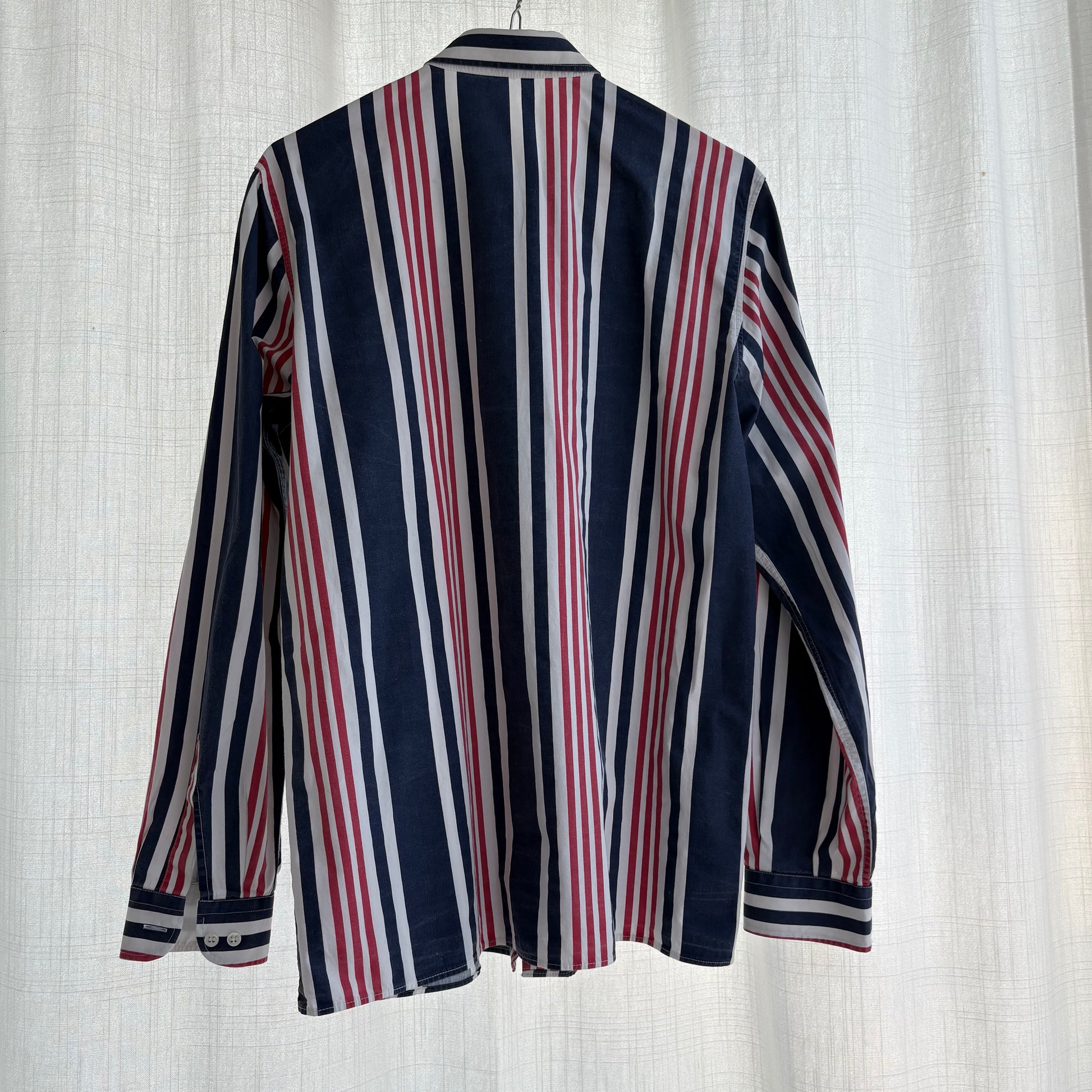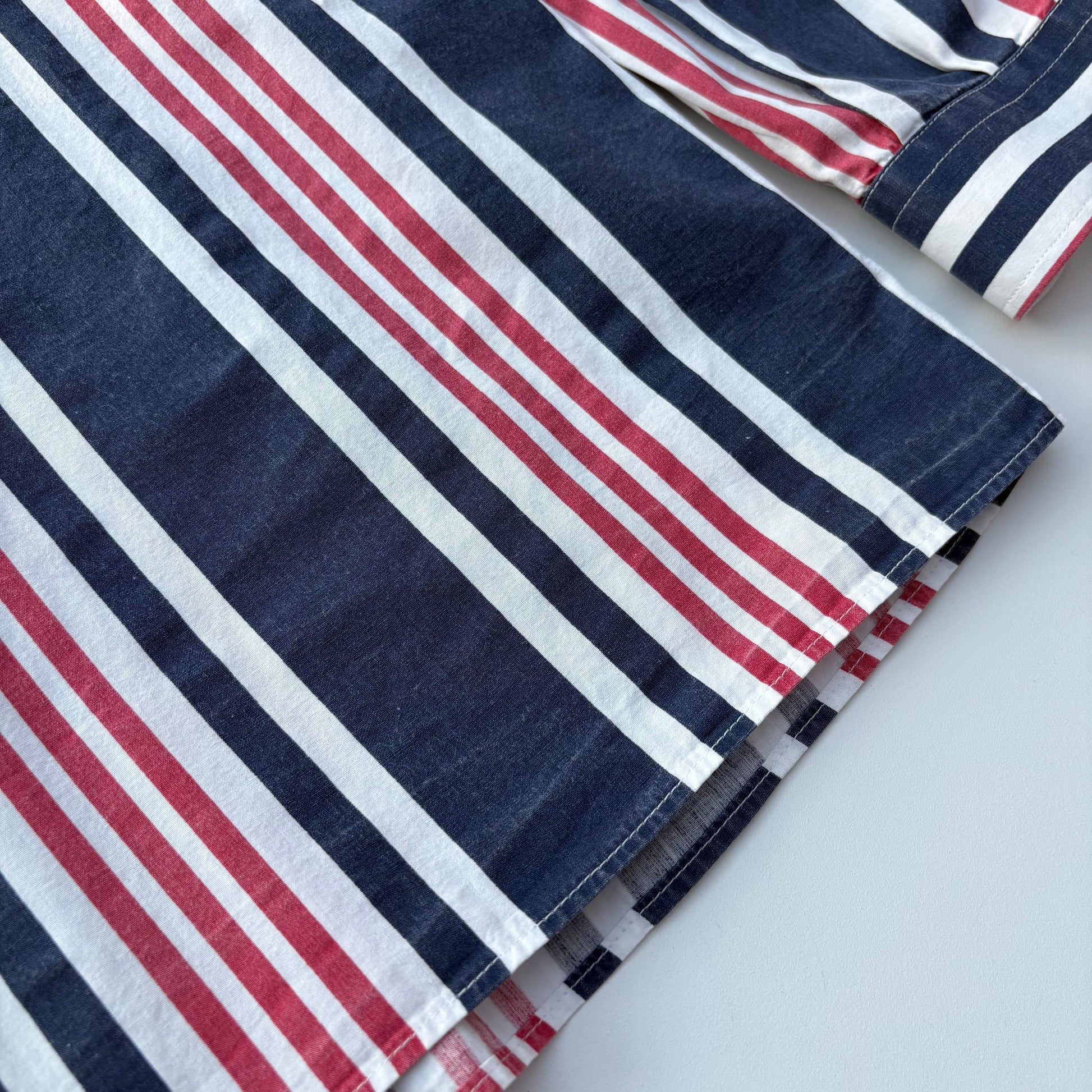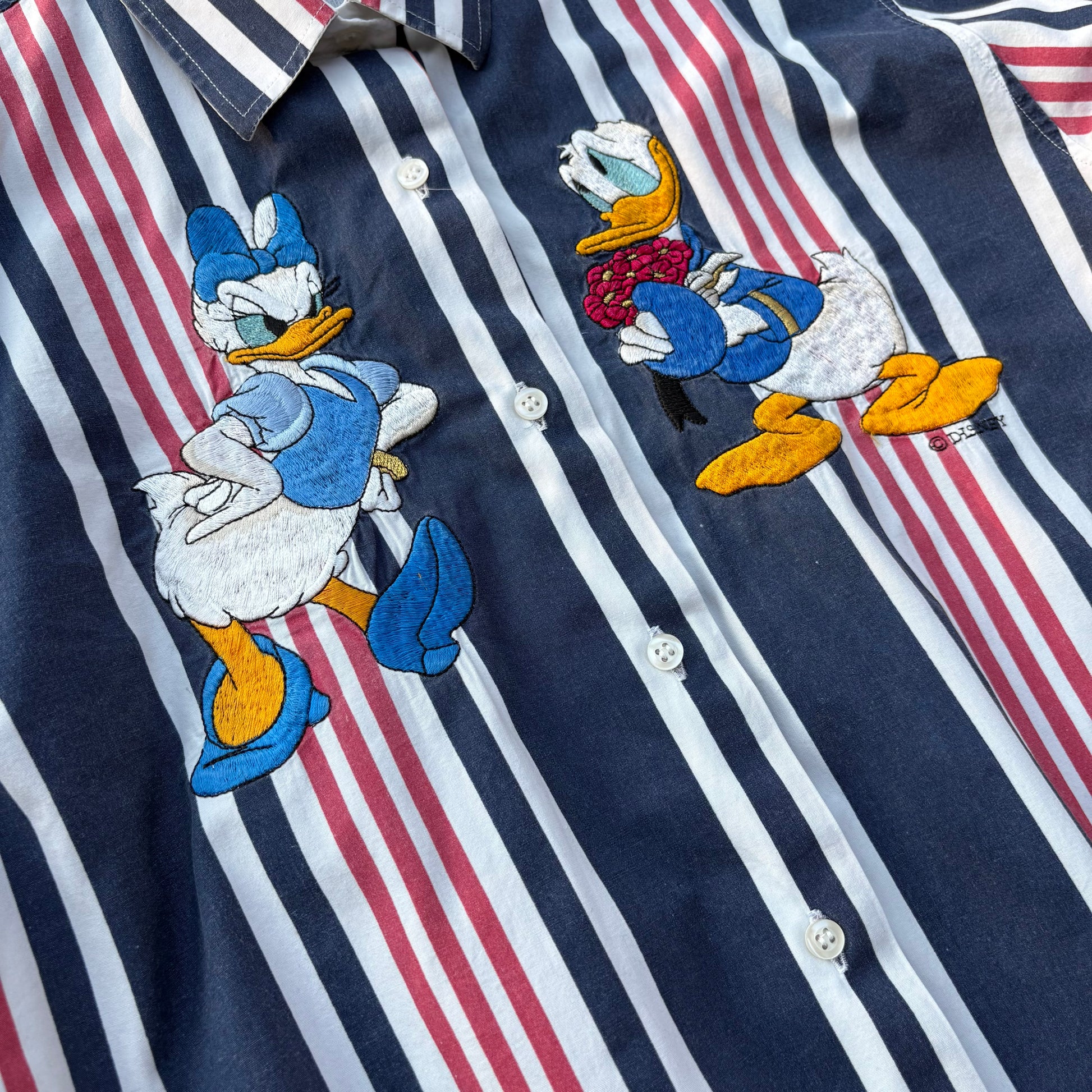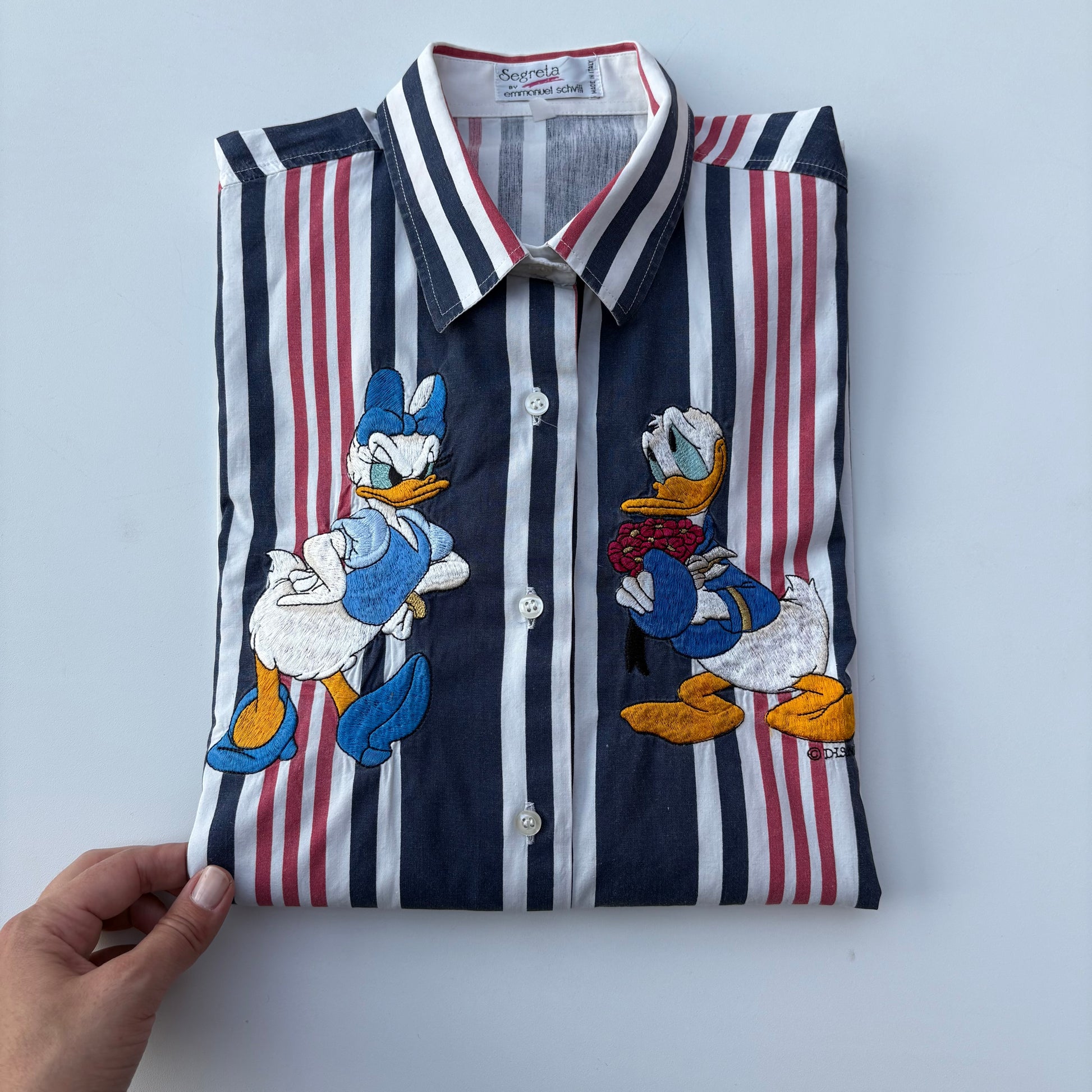 Camicia vintage anni 90 di Schvili, in cotone con fantasia a righe e ricamo dedicato a Paperino e Paperina.